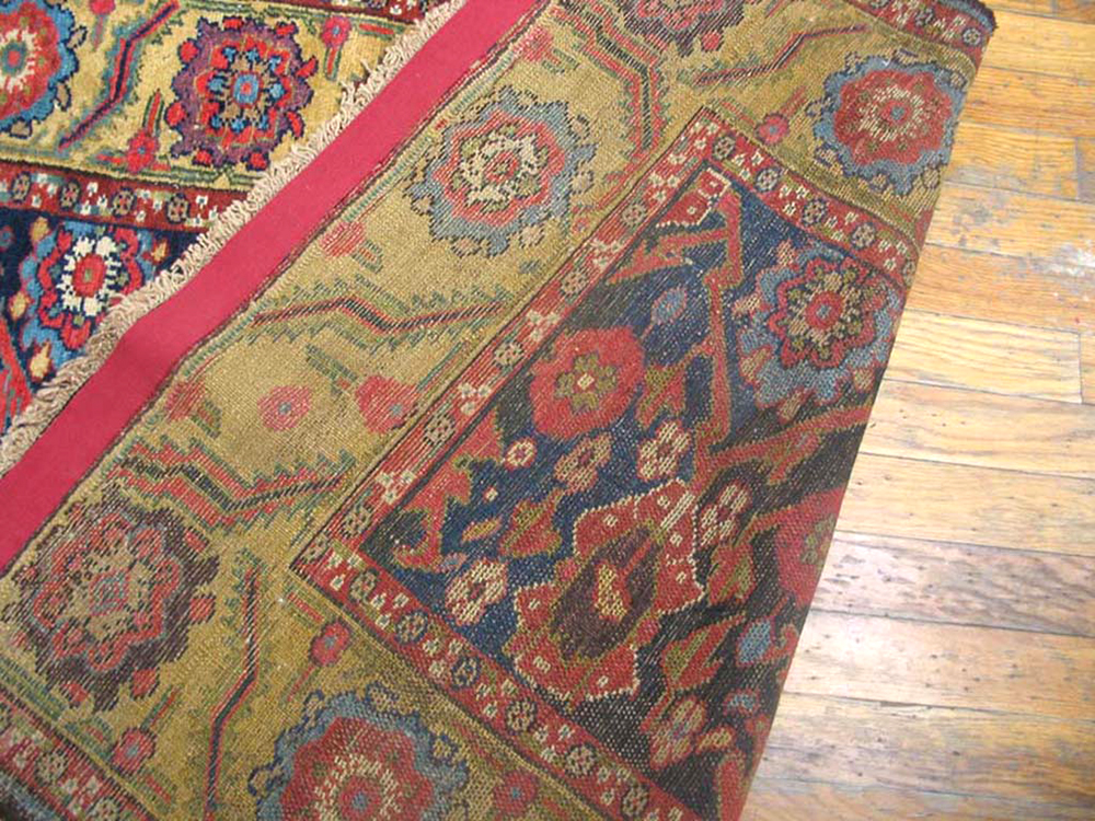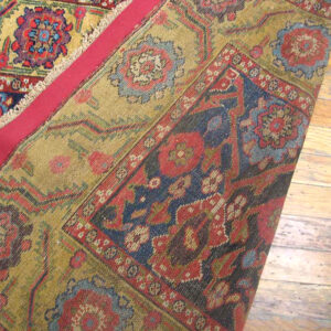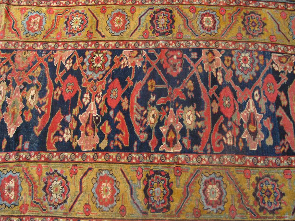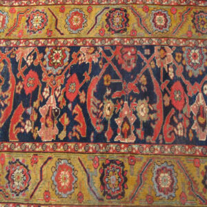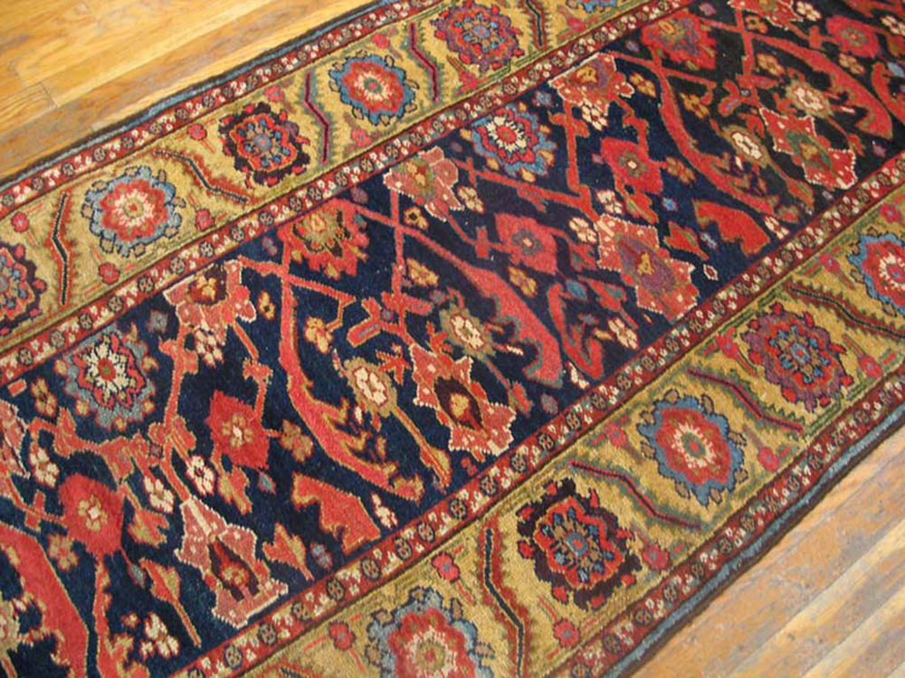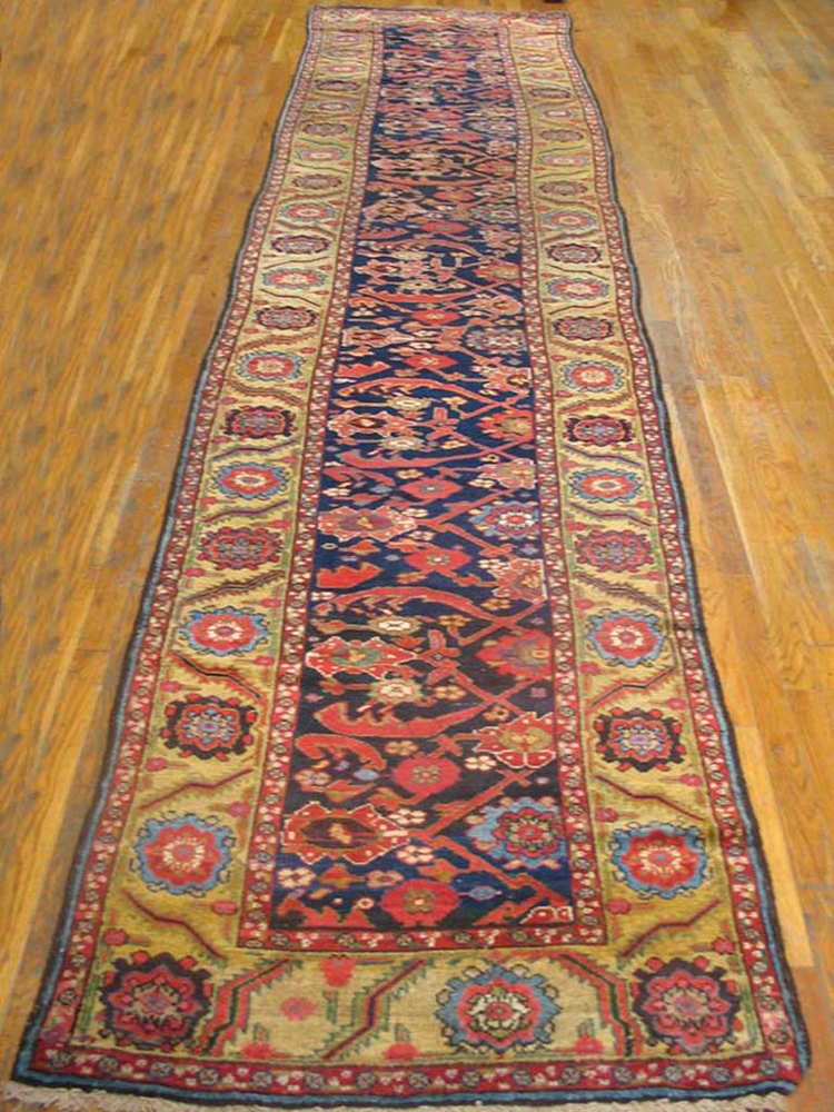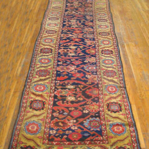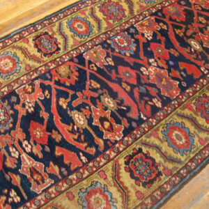 The field of the antique tribal rug is defined by a deep blue ground, a color that brings both visual depth and soothing presence to the pattern. Against this backdrop, expressive tribal motifs — rendered with confident geometry and rhythmic spacing — create a sense of movement and architectural balance along the rug’s elongated format. These designs reflect the dynamic aesthetic that distinguishes Northwest Persian carpets, where bold forms and purposeful repetition work together to produce rugs that are both visually engaging and compositionally disciplined.