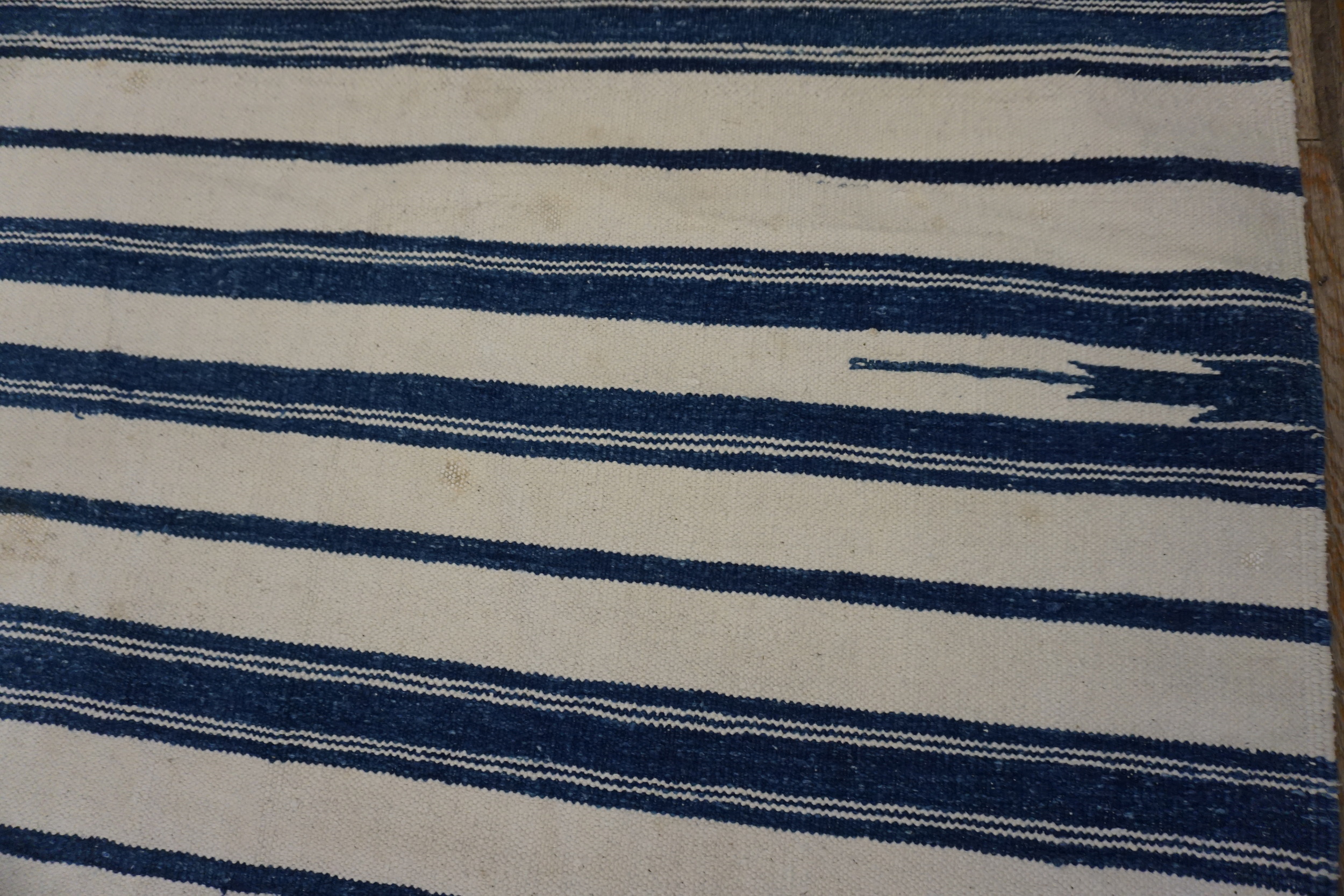 The palette is defined by crisp contrast, utilizing a field of soft, aged ivory and cream against bold, horizontal bands of indigo blue. This sophisticated combination allows the textile to function as a neutral foundation while still offering visual depth, making it an excellent choice among ivory beige cream white color rugs.