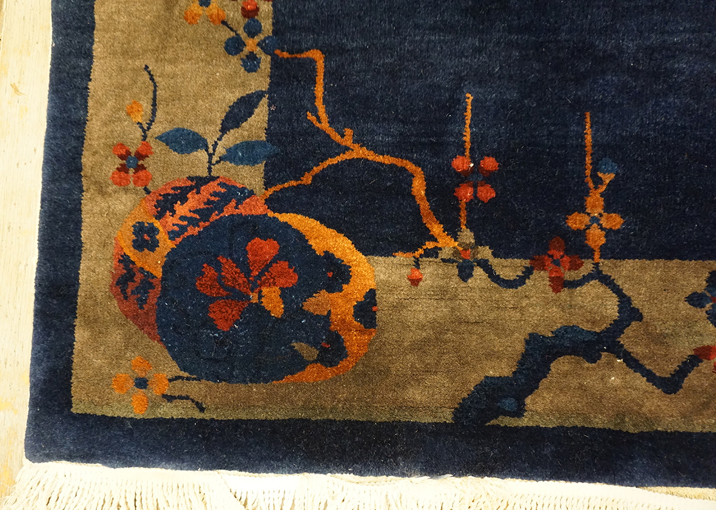 Hand-knotted from high-quality wool, the pile retains a luxurious density and sheen that beautifully captures the light, enhancing the tonal variations within the deep blue field. This rug represents the pinnacle of early 20th-century Chinese weaving, offering both historical significance and enduring decorative appeal for the discerning interior.