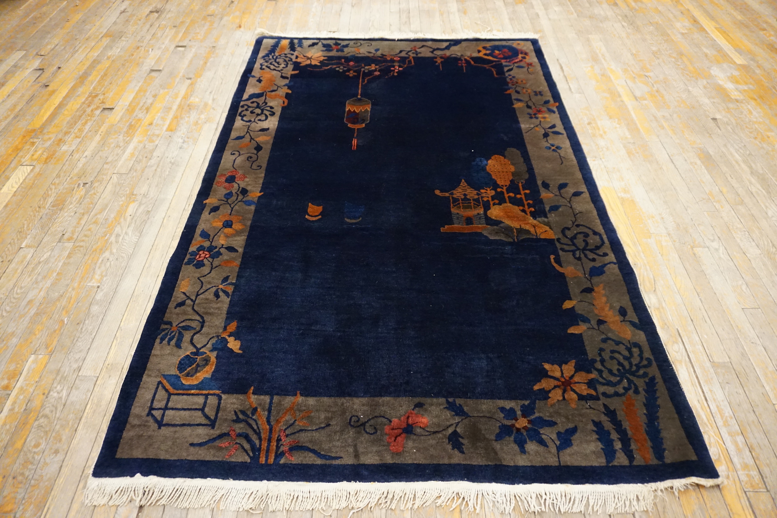 The commanding field is rendered in a saturated, almost midnight hue, characteristic of the finest 1920s production. This rich blue color rugs provides a dramatic backdrop for the stylized pictorial elements. Given its dimensions, this piece functions perfectly as a versatile small scatter size rugs, ideal for defining intimate spaces or serving as an accent piece in a larger room.