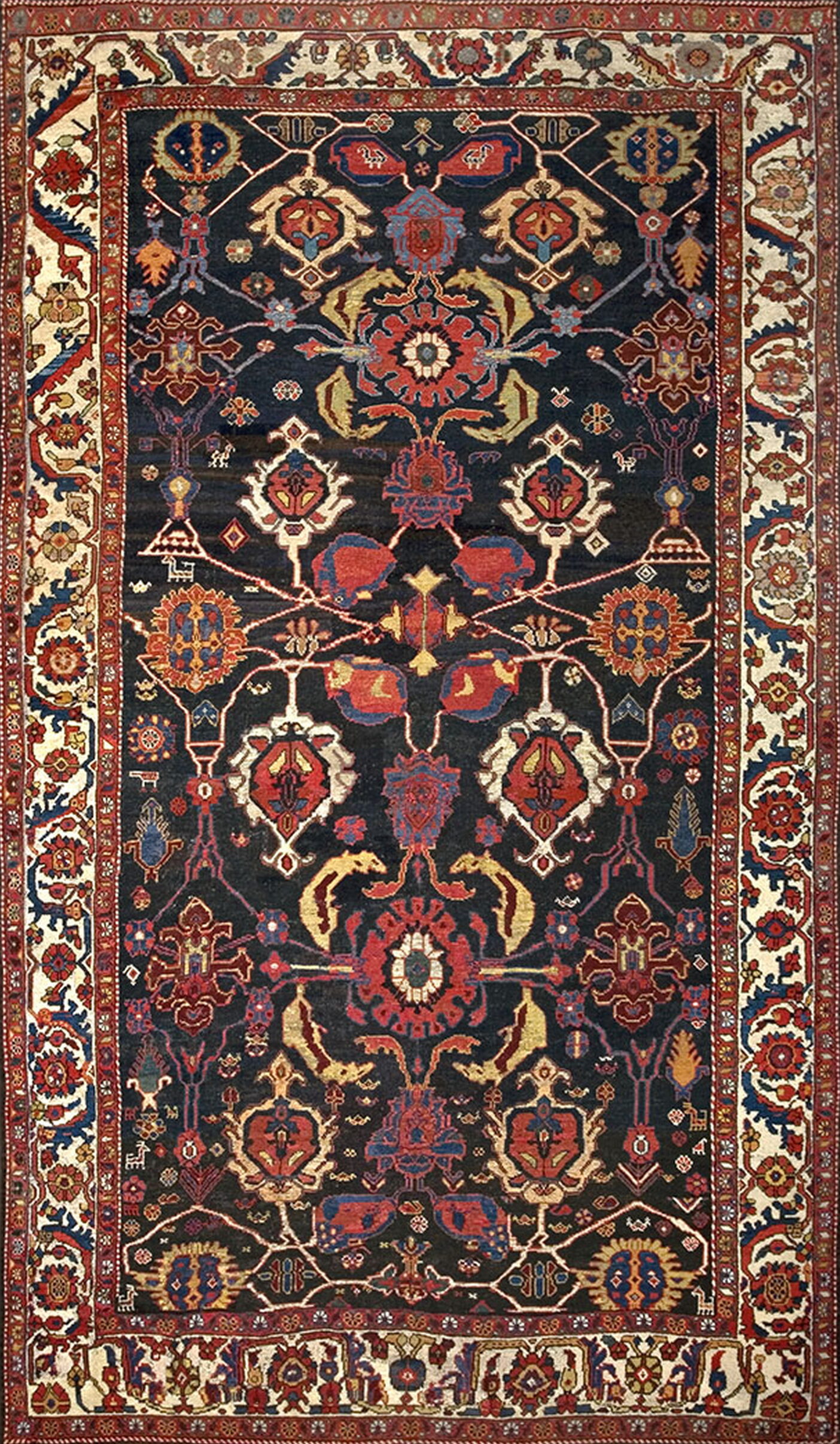 The dense, allover pattern features a dramatic interplay of stylized palmettes, vinery, and rosettes set against a magnificent, near-black color rugs ground. This dark field allows the rich secondary colors—vermilion, saffron, and deep indigo—to emerge with striking clarity, lending the piece a monumental presence.