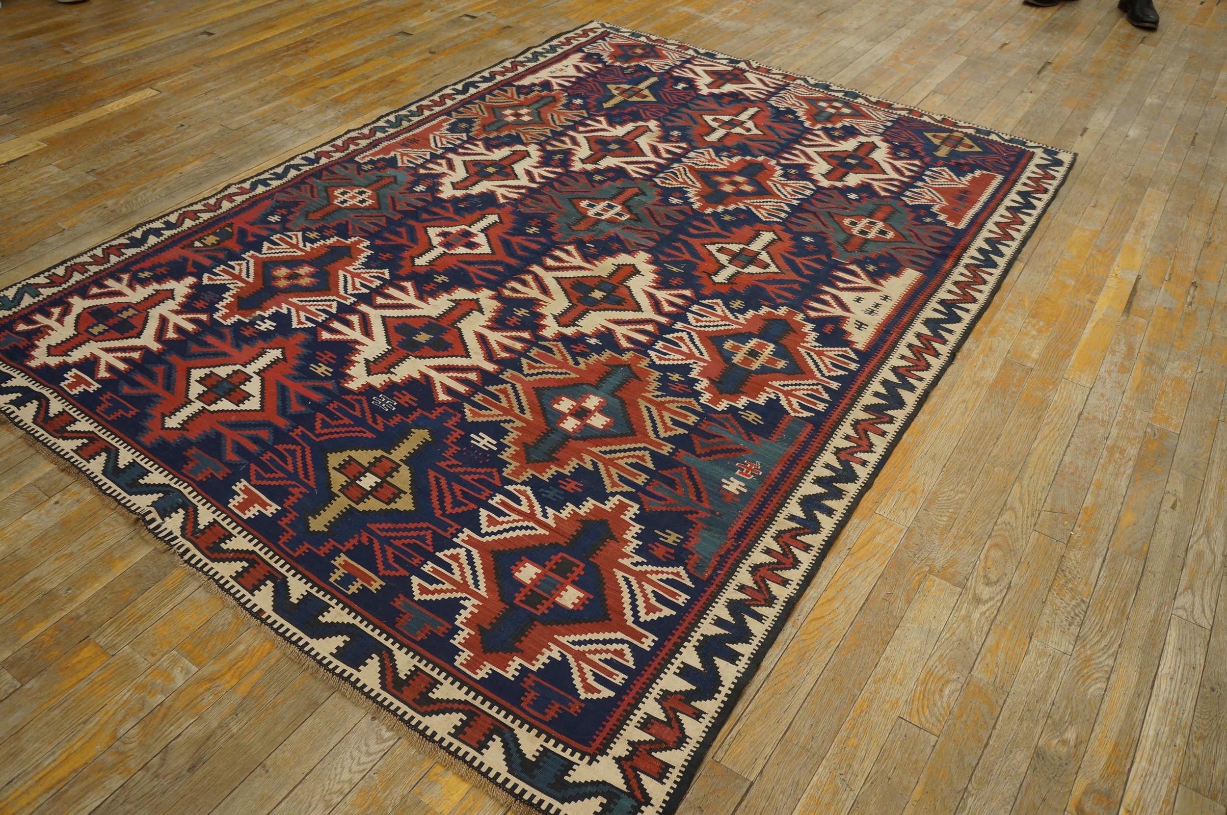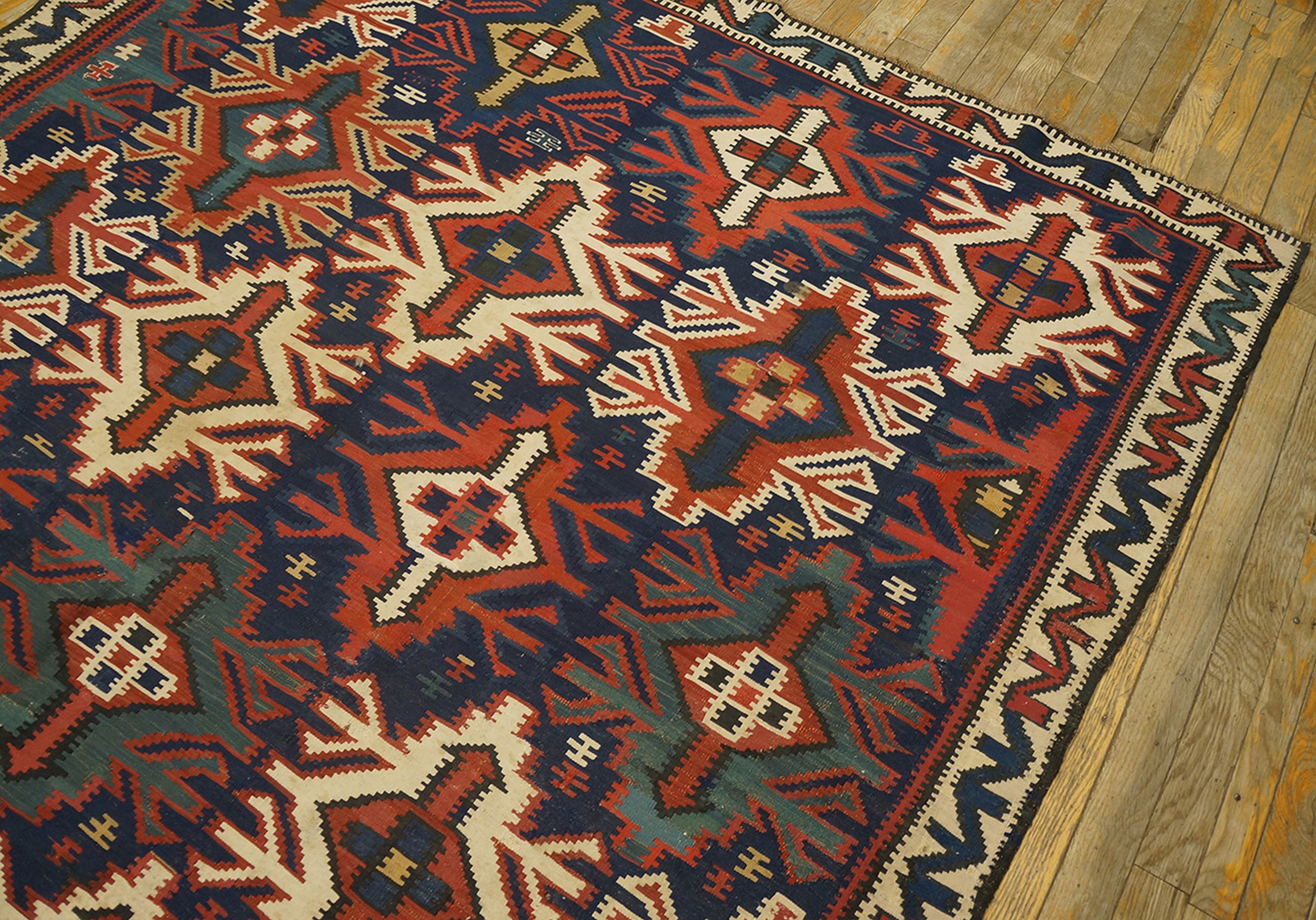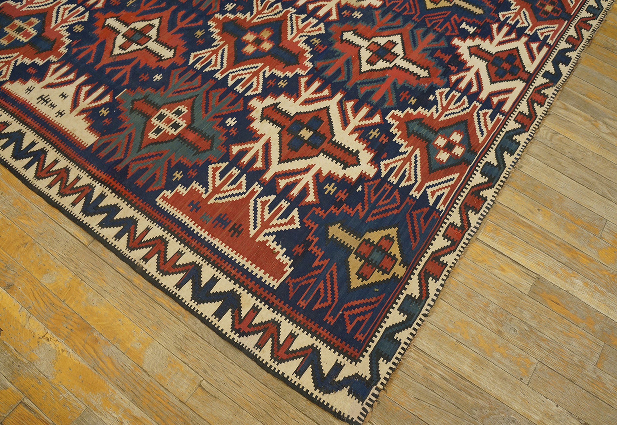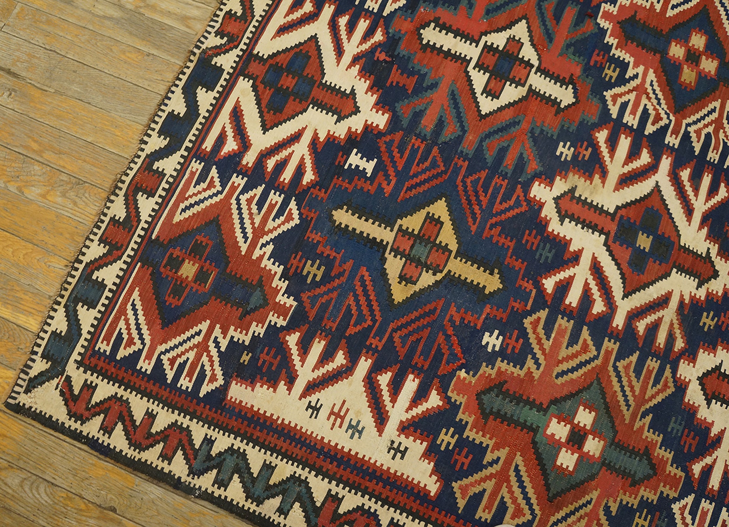 This piece is a testament to the enduring quality and powerful visual impact of tribal flatweaves. As a genuine example of antique rugs from the Caucasus region, it offers collectors a vibrant, structurally sound piece of textile history, rich with cultural significance and decorative versatility.