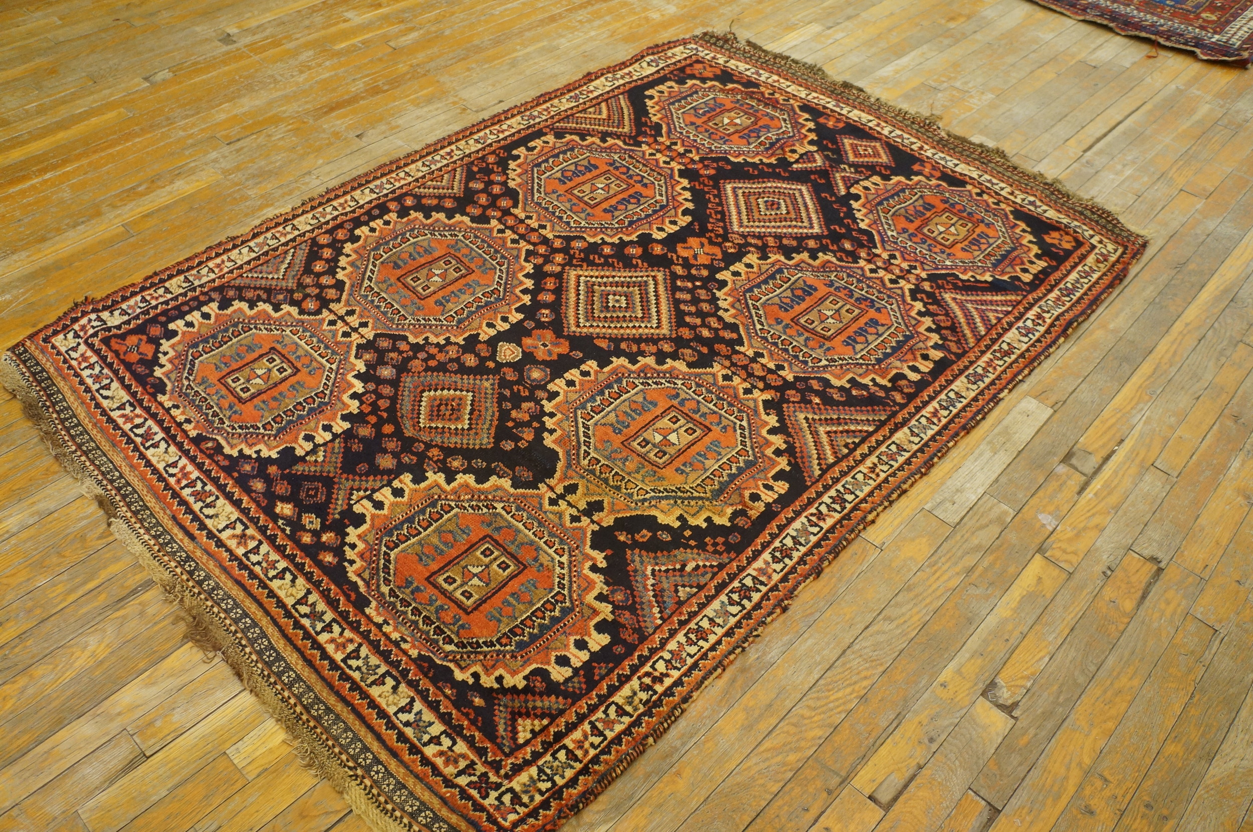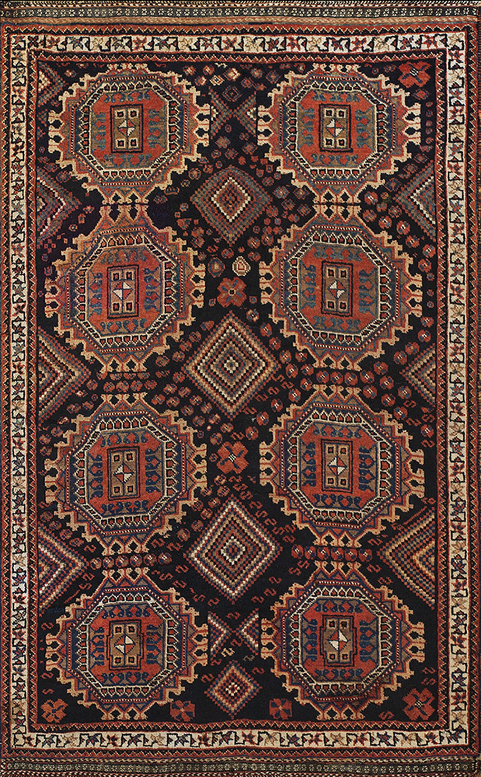 Woven by the semi-nomadic people of the Afshar tribe in the mountainous regions of Southeast Persia, this piece exemplifies authentic Iranian Persian craftsmanship. The dark, saturated indigo field serves as a dramatic canvas for the repeating, highly stylized octagonal medallions, a hallmark of afshar weaving.