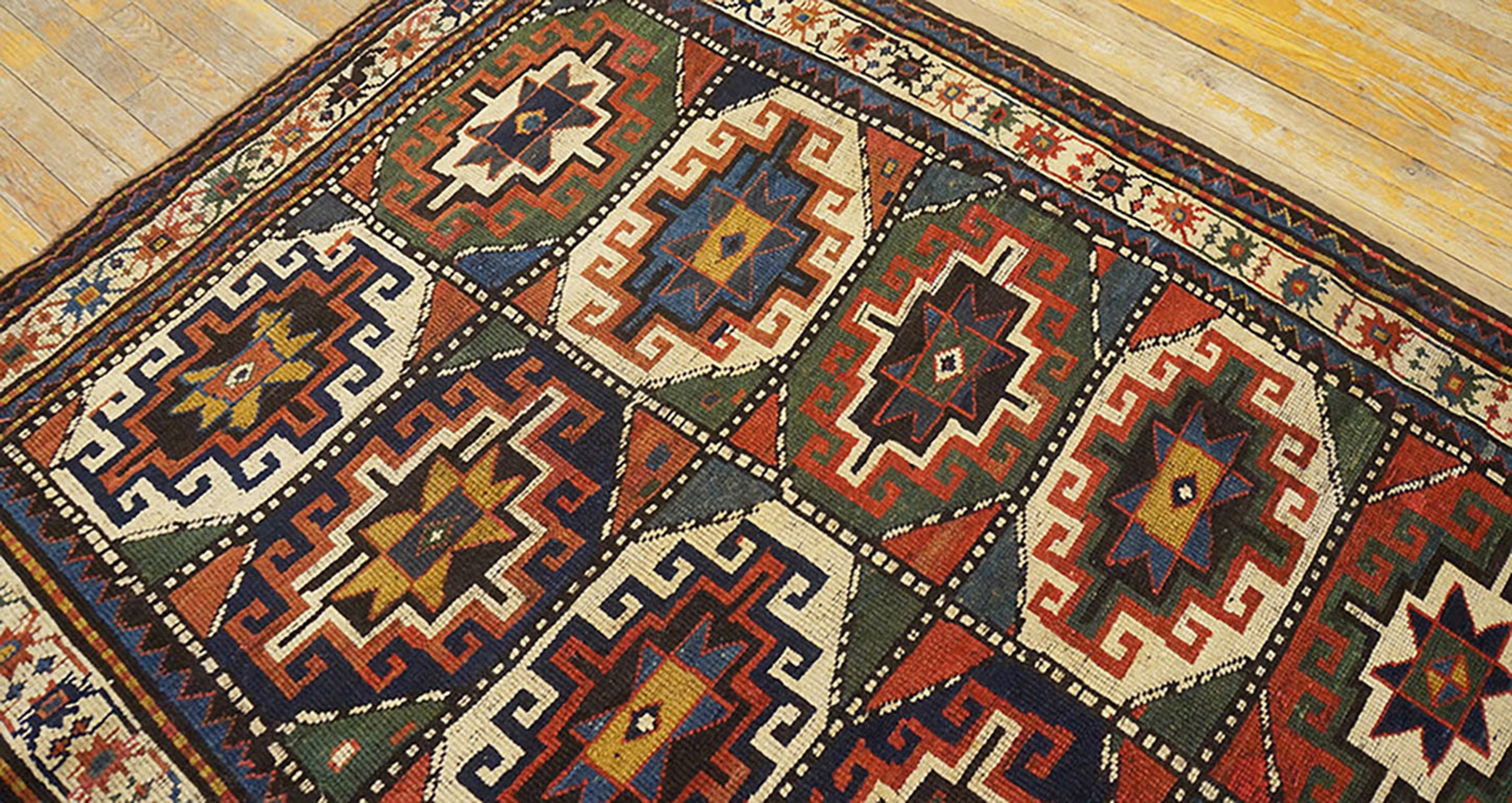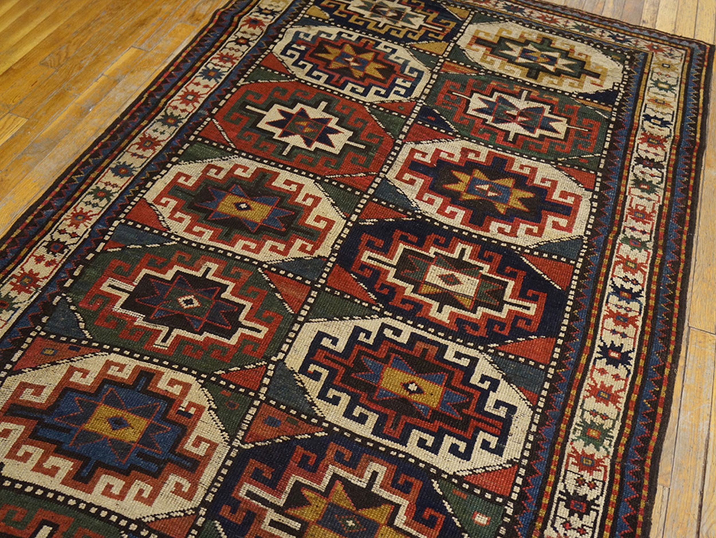 Characteristic of tribal Caucasian production, the field features a highly organized series of repeating octagonal and stepped medallions. This dense arrangement creates a dynamic allover design, where each geometric motif is framed by contrasting colors and bold, stylized hooks and meander borders, showcasing the weaver’s masterful command of space.