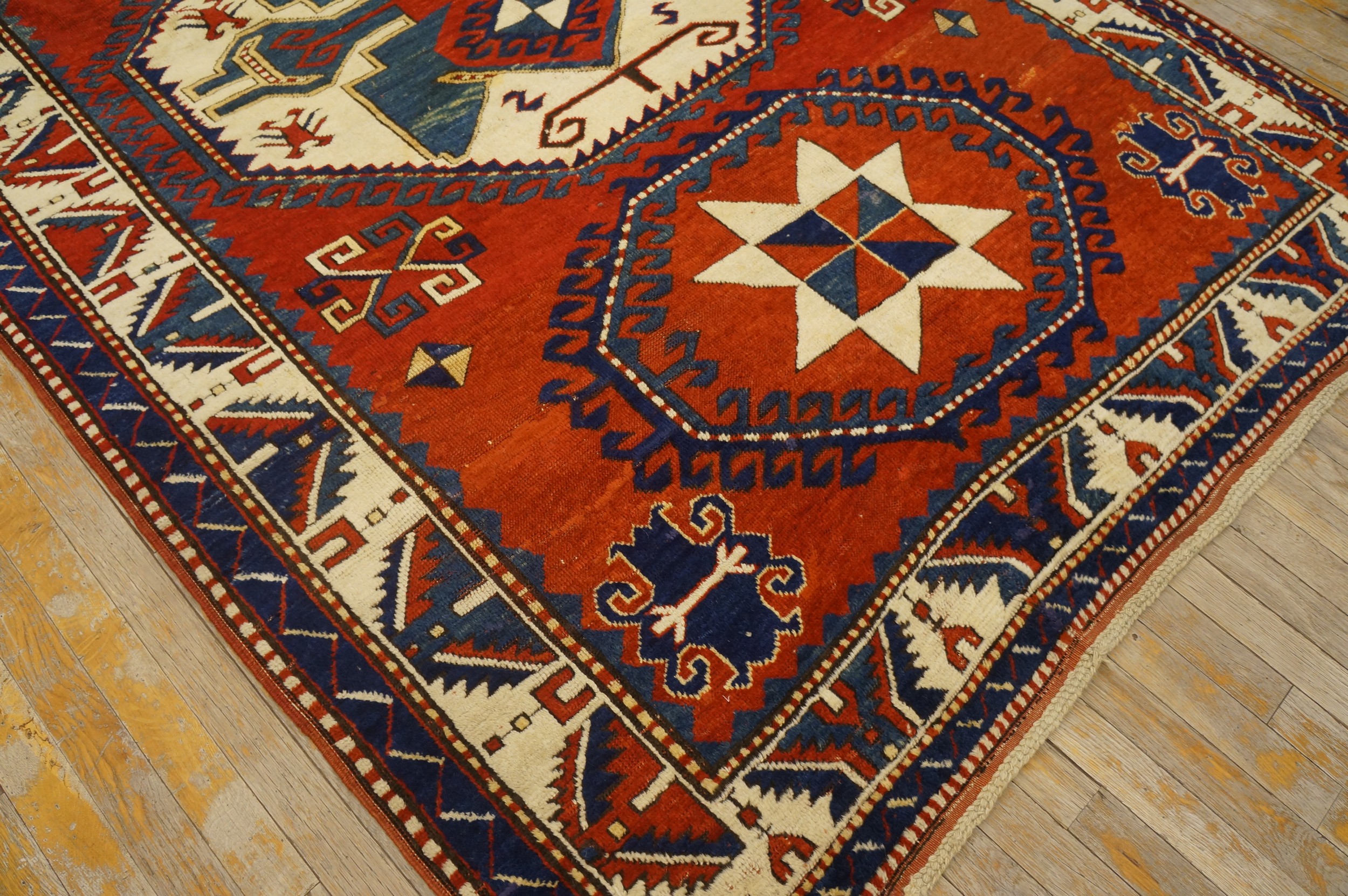 The field is dominated by a rich, saturated rust hue, achieved through high-quality natural dyes. This vibrant ground provides a dramatic contrast to the stark white and dark blue elements of the central motifs. The intensity of the color palette is a hallmark of the finest tribal antique rugs from this period.