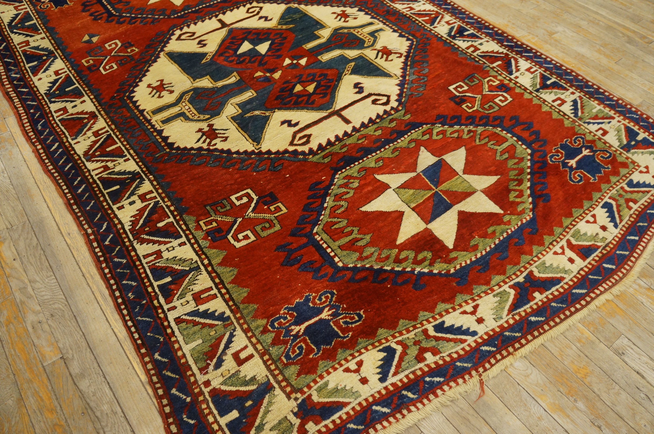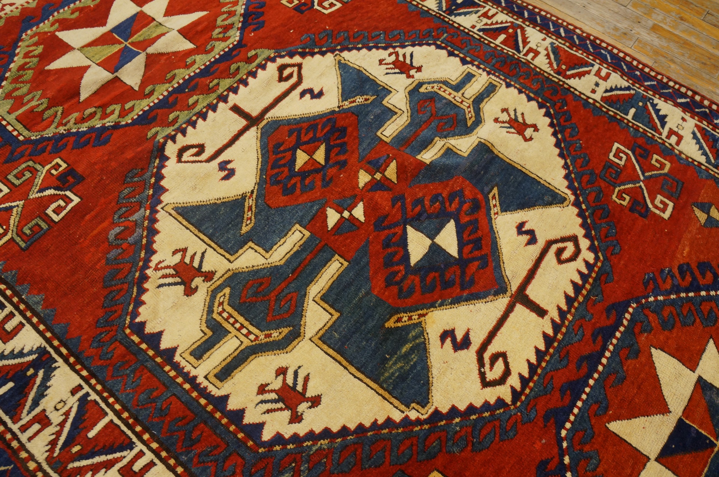 The rug is framed by multiple guard borders featuring serrated leaf and geometric hook designs, which tightly contain the energy of the central design. This piece remains in remarkable condition for its age, preserving the clarity of its bold design and the integrity of its hand-knotted structure, making it a powerful example of nomadic weaving heritage.