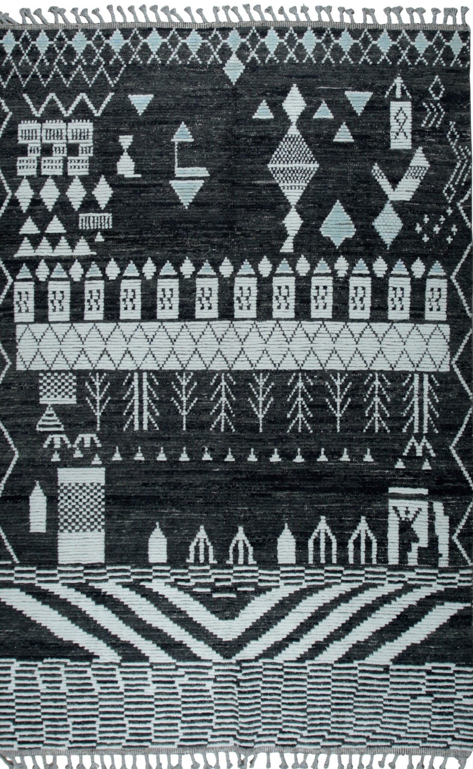 Marrakech Essence Black Berber Carpet, Country of Origin: Pakistan. This striking hand-knotted piece offers a sophisticated take on tribal design, translating traditional geometric symbolism into a modern, high-contrast textile. The dense field is dominated by a rich, saturated black, providing a dramatic backdrop for the intricate white and pale blue motifs. The quality and craftsmanship inherent in this piece exemplify the finest traditions of contemporary Pakistani rugs.