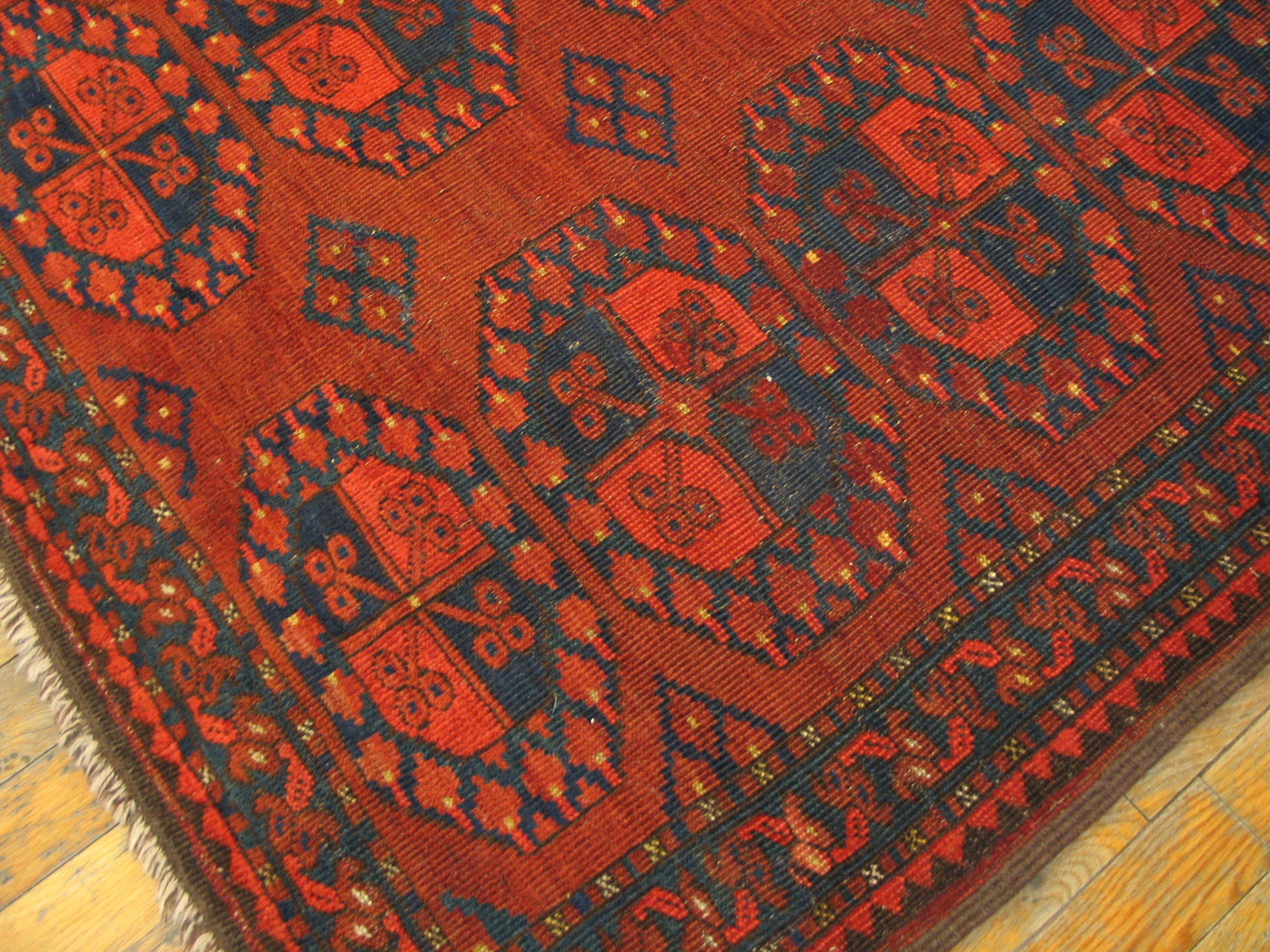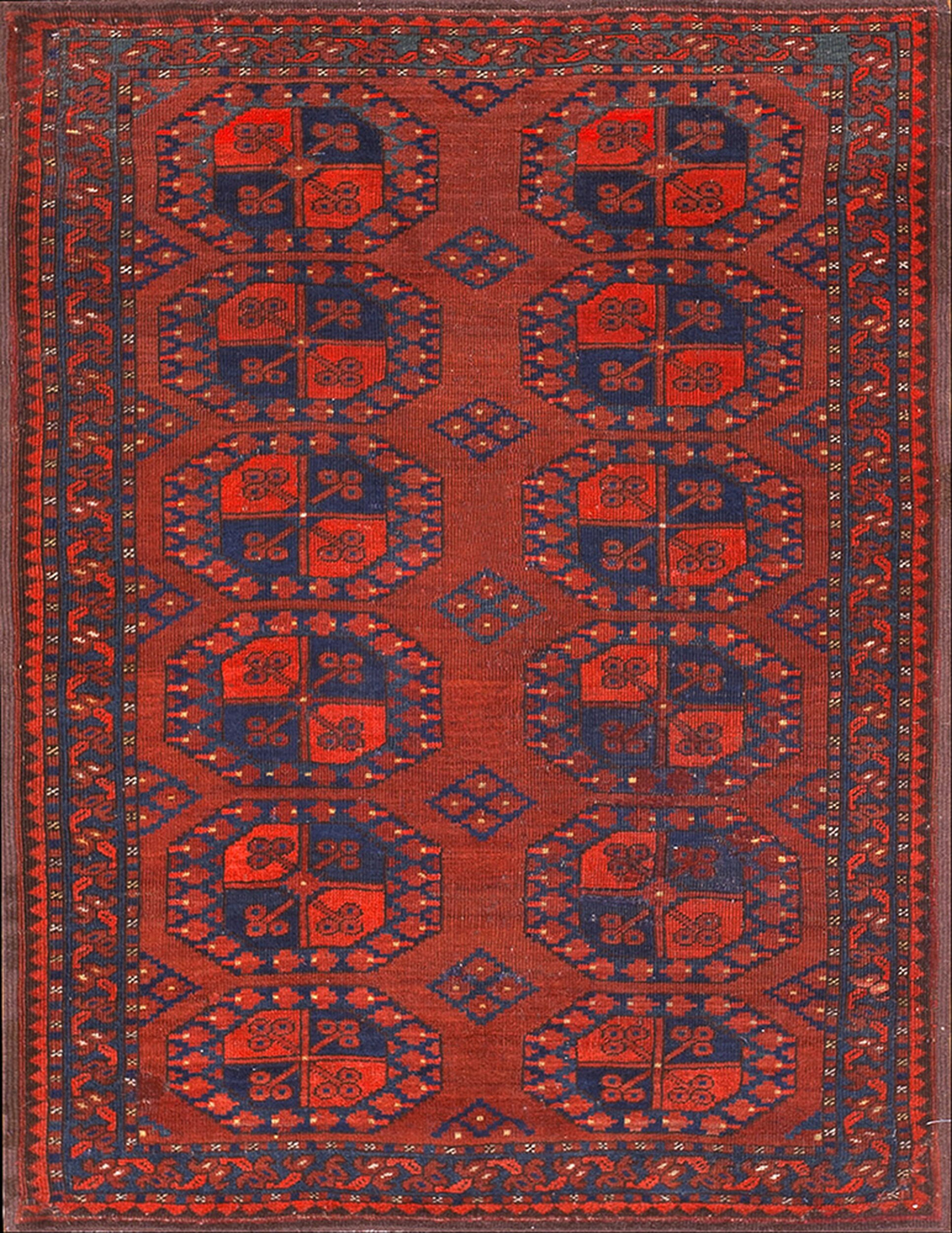 The design employs a classic repeating gul motif, presented in an allover rugs format that fills the entire composition without the use of a central medallion. This repetitive, geometric structure emphasizes the rhythmic quality of the weaving, typical of the regional aesthetic and Baluch artistry.