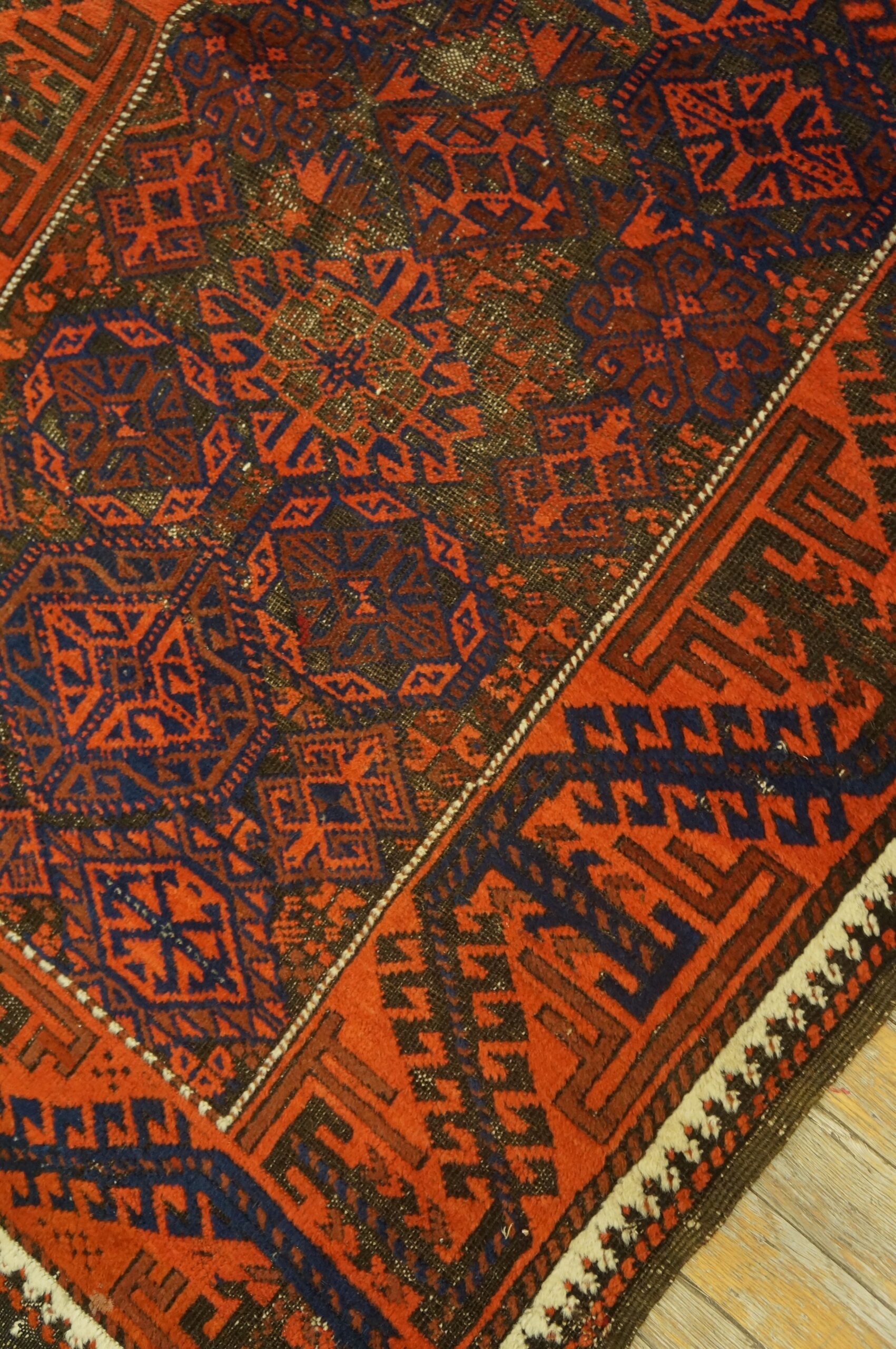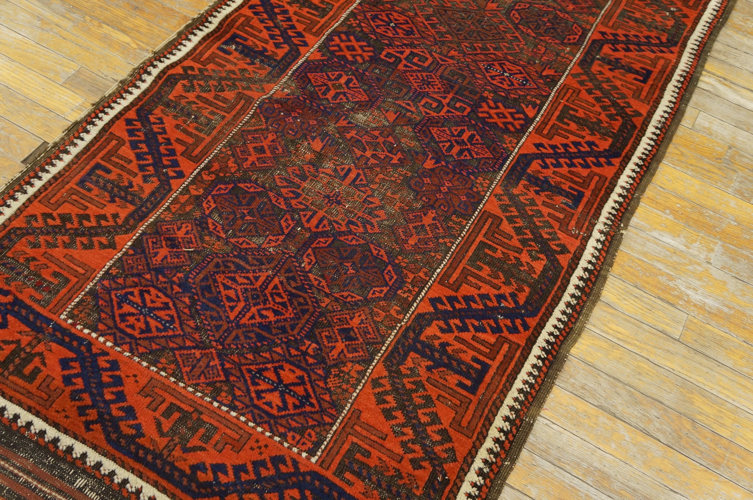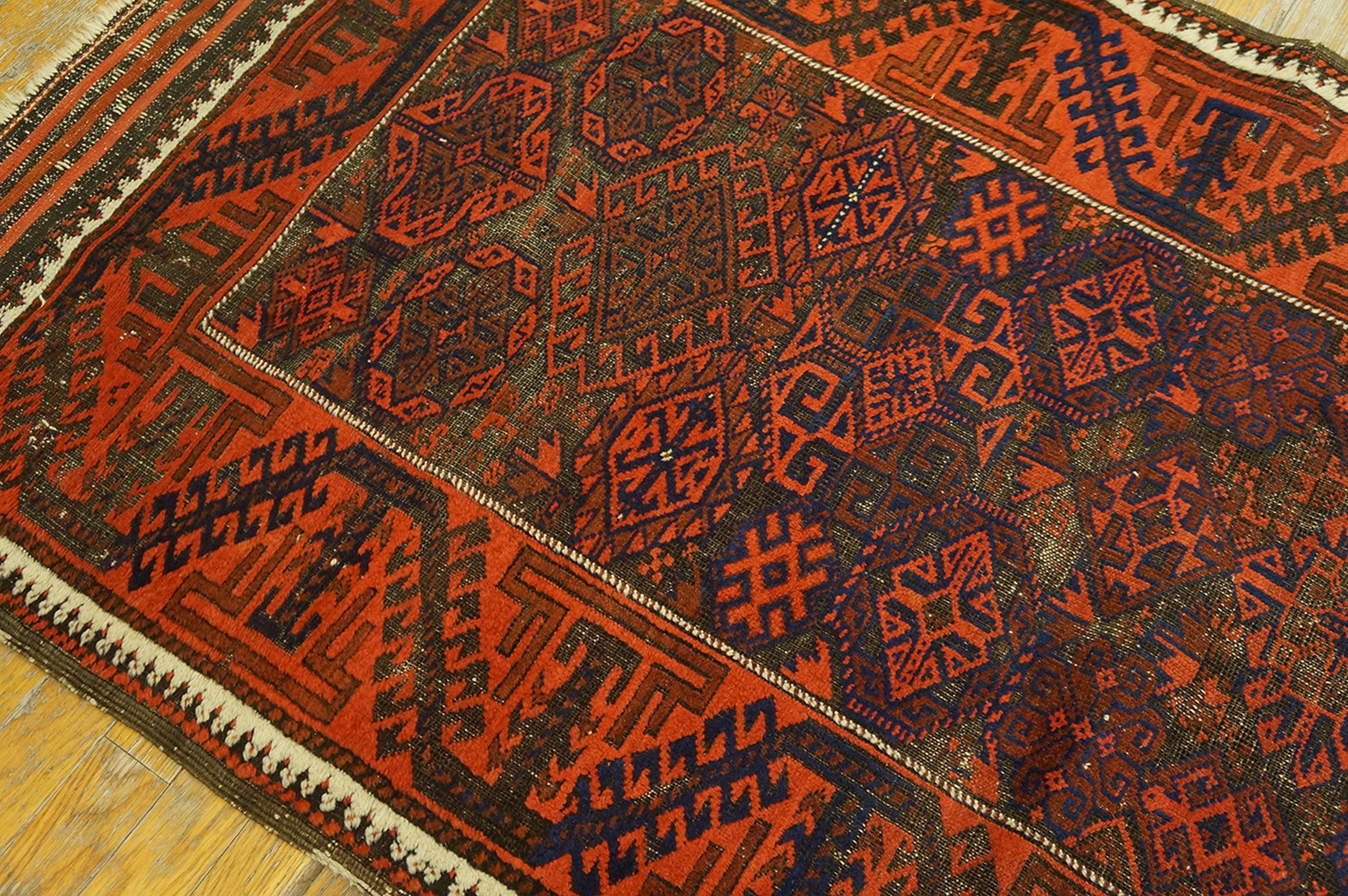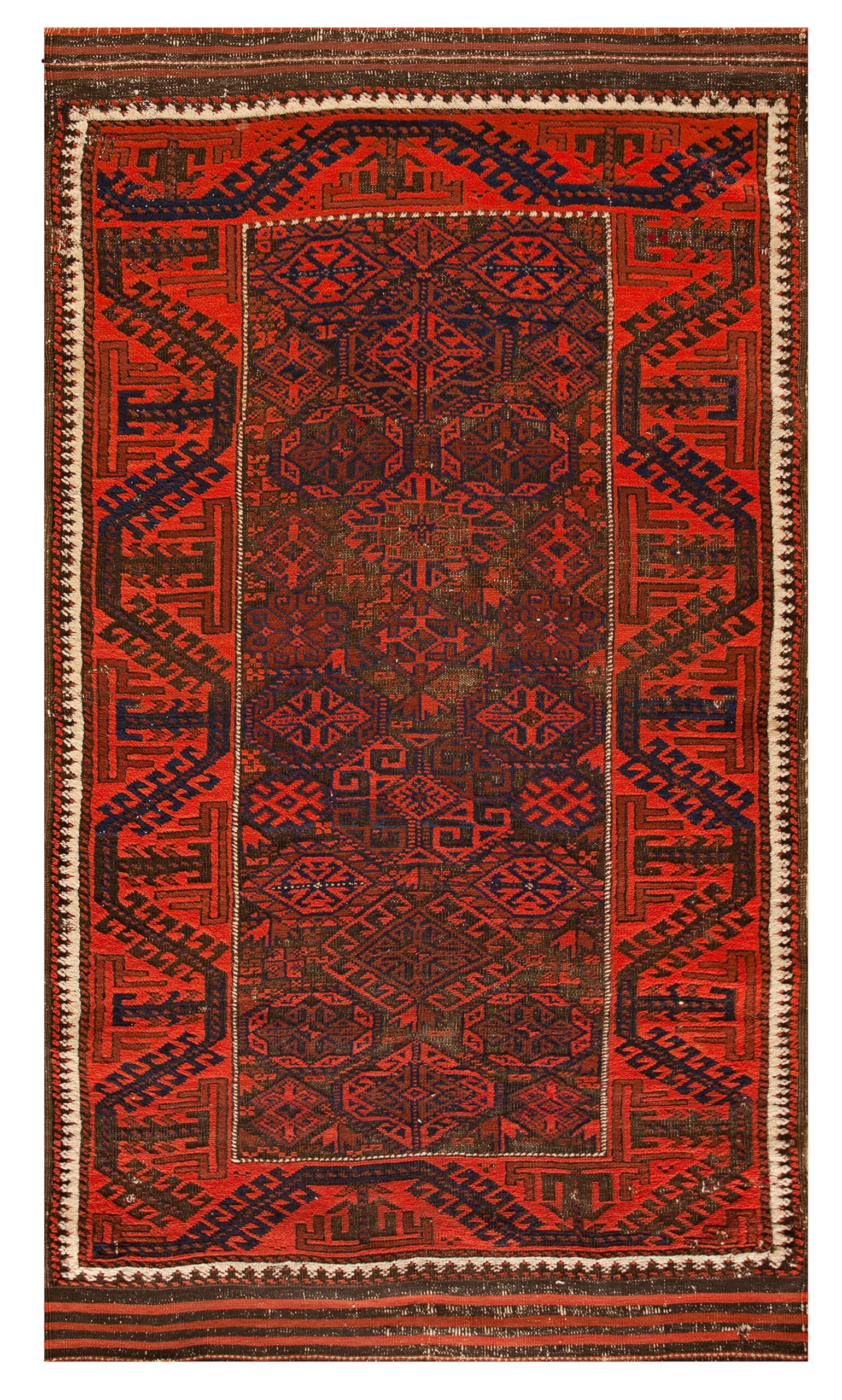 Antique Baluch Small Scatter Size Wool Red Rug, Circa Date: 1880s. This exceptional example of nomadic weaving embodies the rich, geometric tradition of the Baluch tribes who inhabited the borderlands of Iran and Afghanistan. Its dense wool pile and robust construction are characteristic features found across our collection of antique rugs.