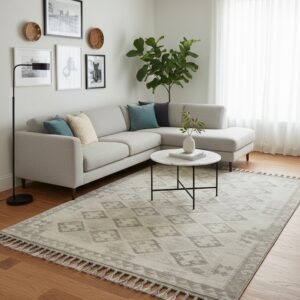 The palette is defined by subtle, layered shades of gray, ranging from pale silver to deep charcoal. This monochromatic approach lends itself beautifully to minimalist or transitional settings, offering visual depth without overwhelming existing decor. The slight abrash effect inherent in the wool enhances its organic, hand-crafted appeal.