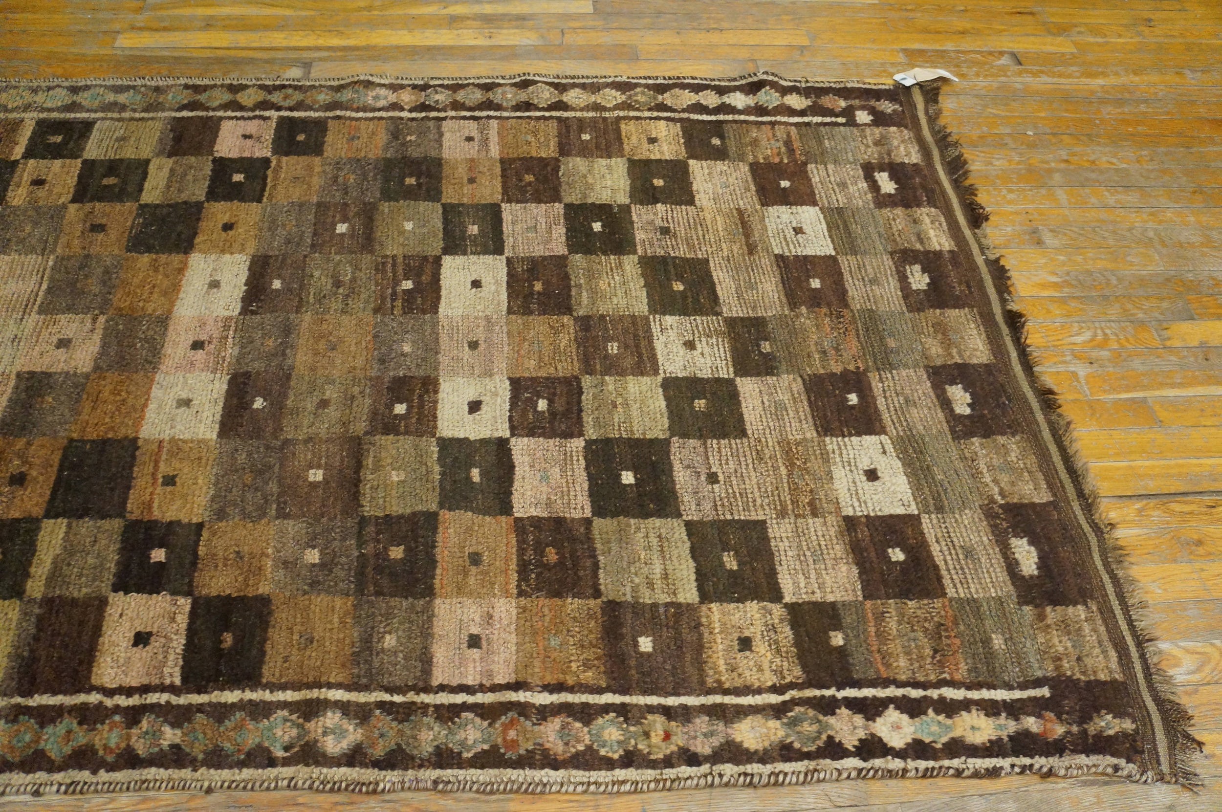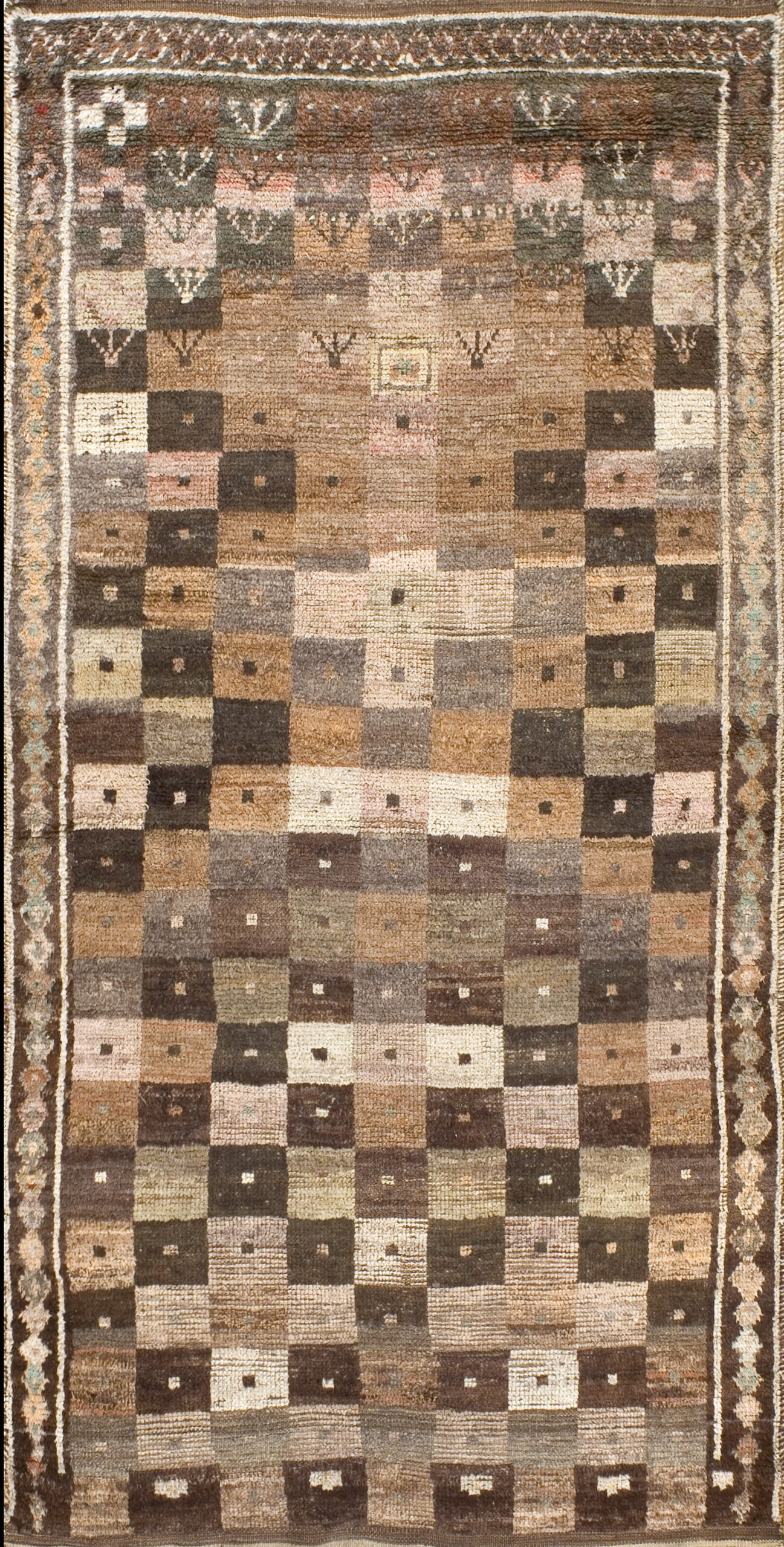 The design is characterized by a striking, yet subdued, checkerboard field composed of large, irregular squares. The palette shifts subtly between deep chocolate, taupe, and creamy off-white, creating a visual texture that speaks to the organic dyeing processes of the era. This geometric simplicity is a hallmark of early 20th-century Iranian / Persian rugs that moved away from highly detailed medallions.