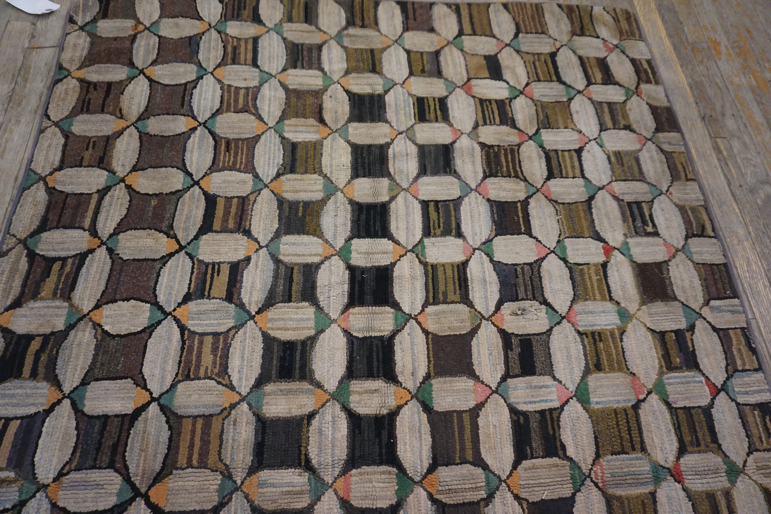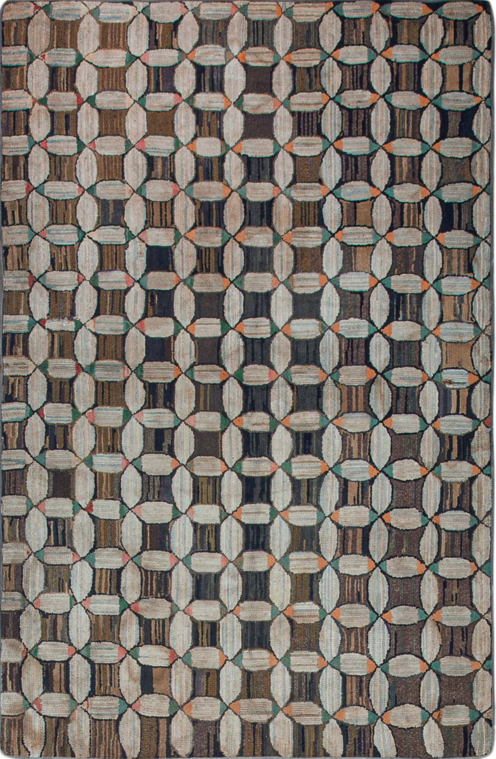The design features a compelling all-over repeat of interlocking ovals, creating a dynamic lattice effect across the field. The use of varied vertical striping within the dark sections contrasts sharply with the plain, lighter ovals, suggesting a sophisticated use of texture and repurposed materials typical of the era. This unique aesthetic is characteristic of the resourceful textile production found among American USA Rugs during the Victorian period.