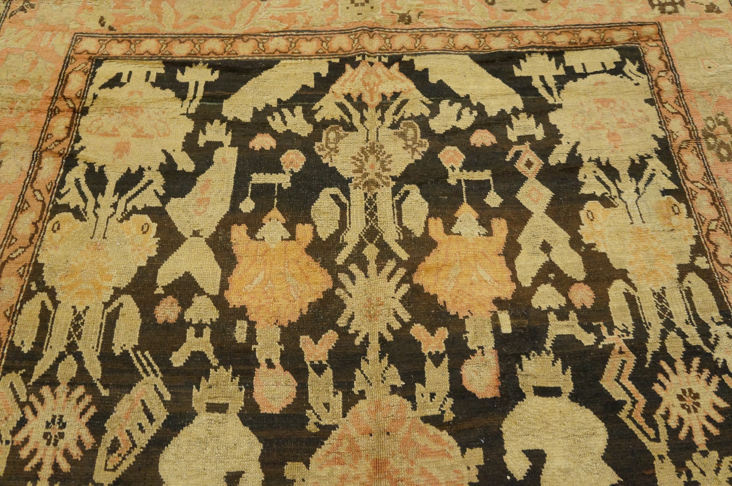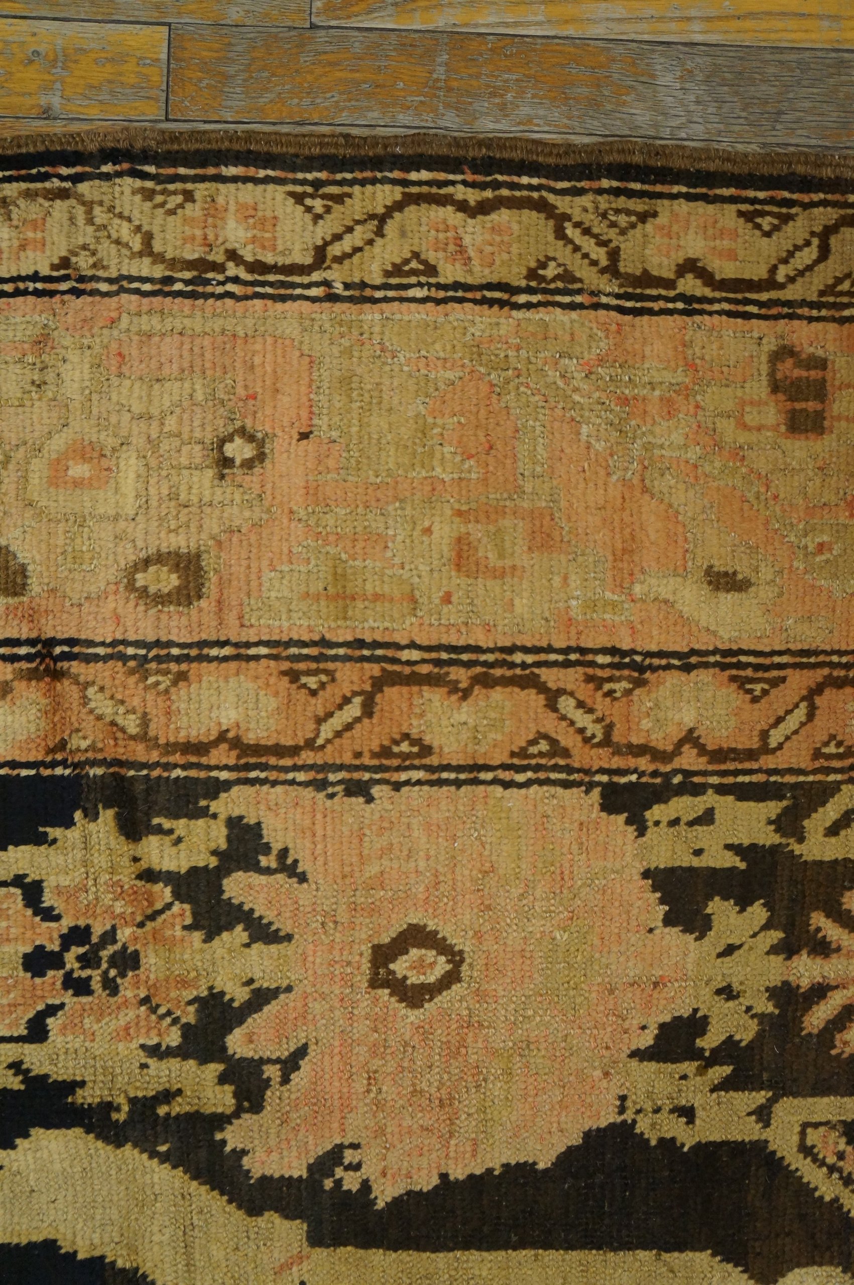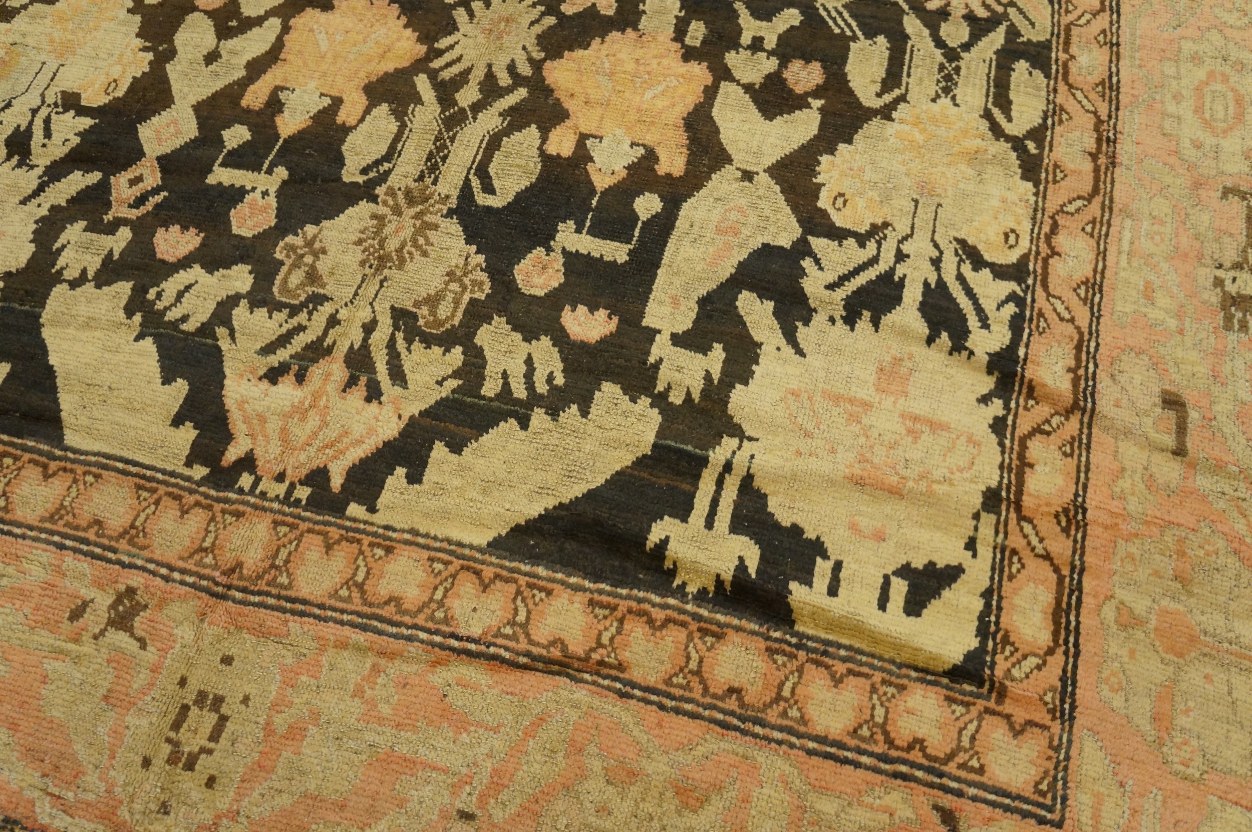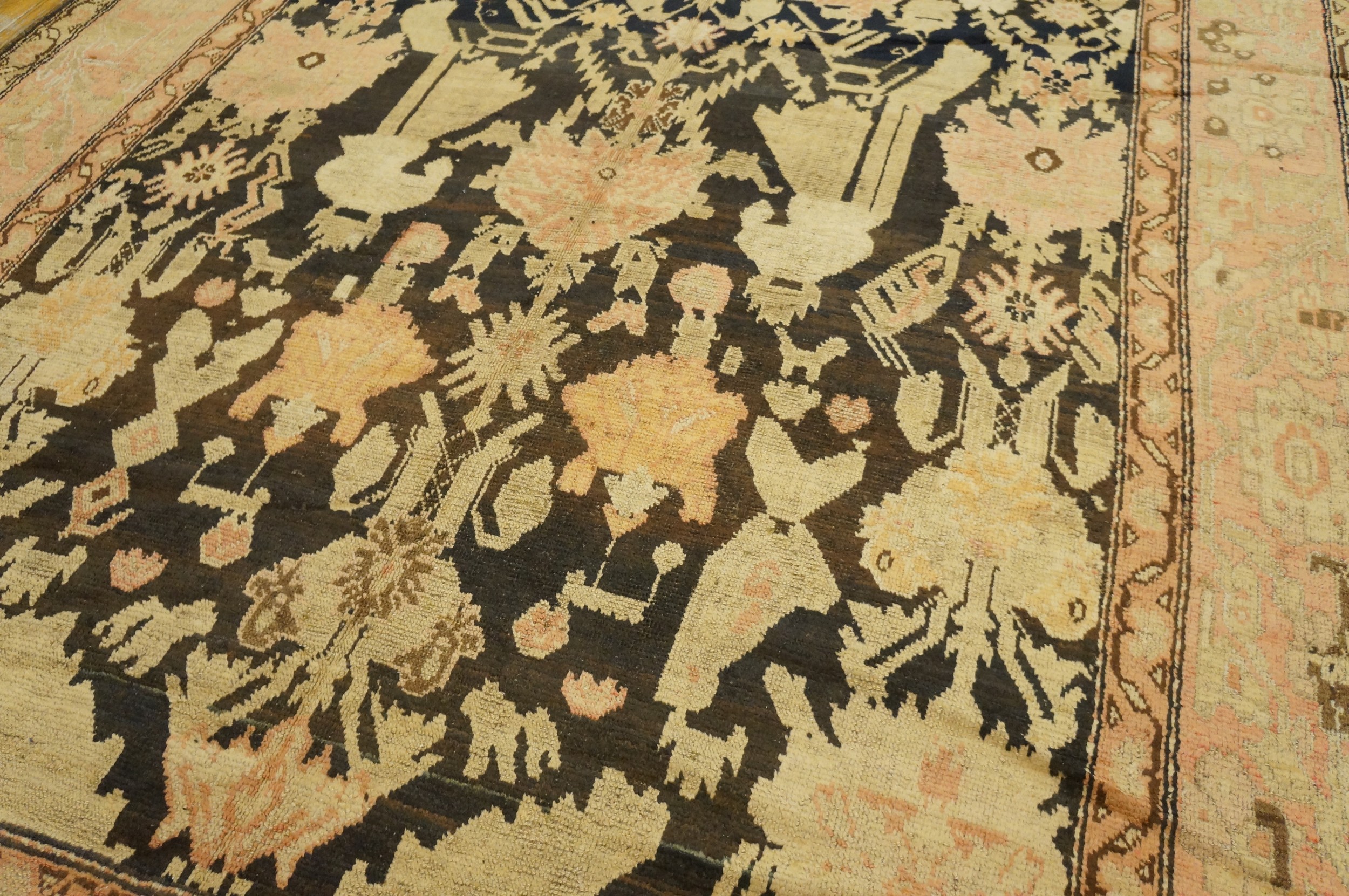 The borders are a virtuoso display of Caucasian symbolism, frequently featuring the “Crab” palmette, the “Running Dog” scroll, or stylized dragon motifs that speak to the region’s deep mythological roots. To possess a late 19th-century brown-ground Karabagh gallery carpet is to hold a monument to a vanishing world—a work that bridges the gap between nomadic tradition and aristocratic scale, transforming a transition space into a gallery of hand-wrought, tribal history and timeless, earthy opulence.