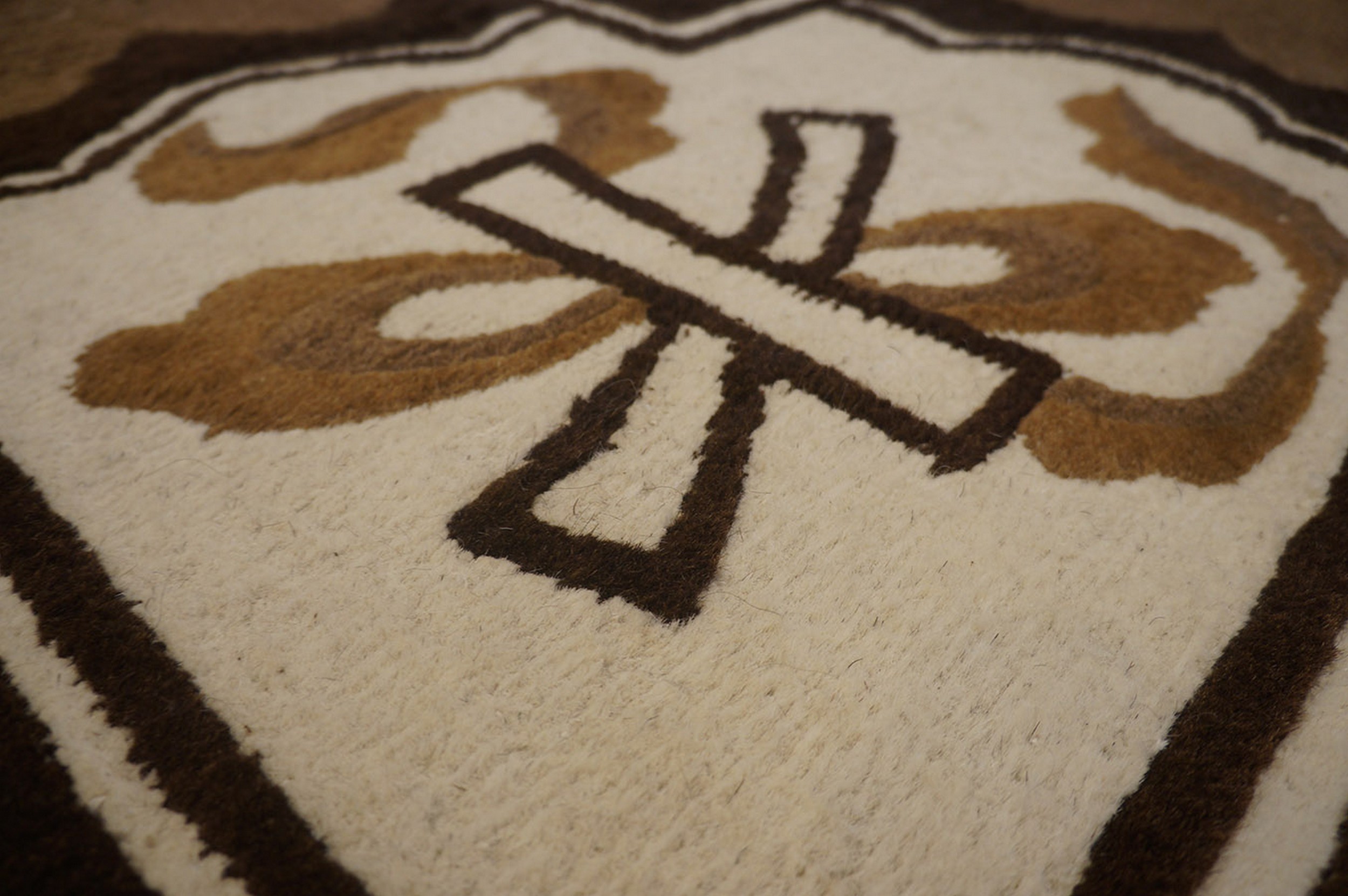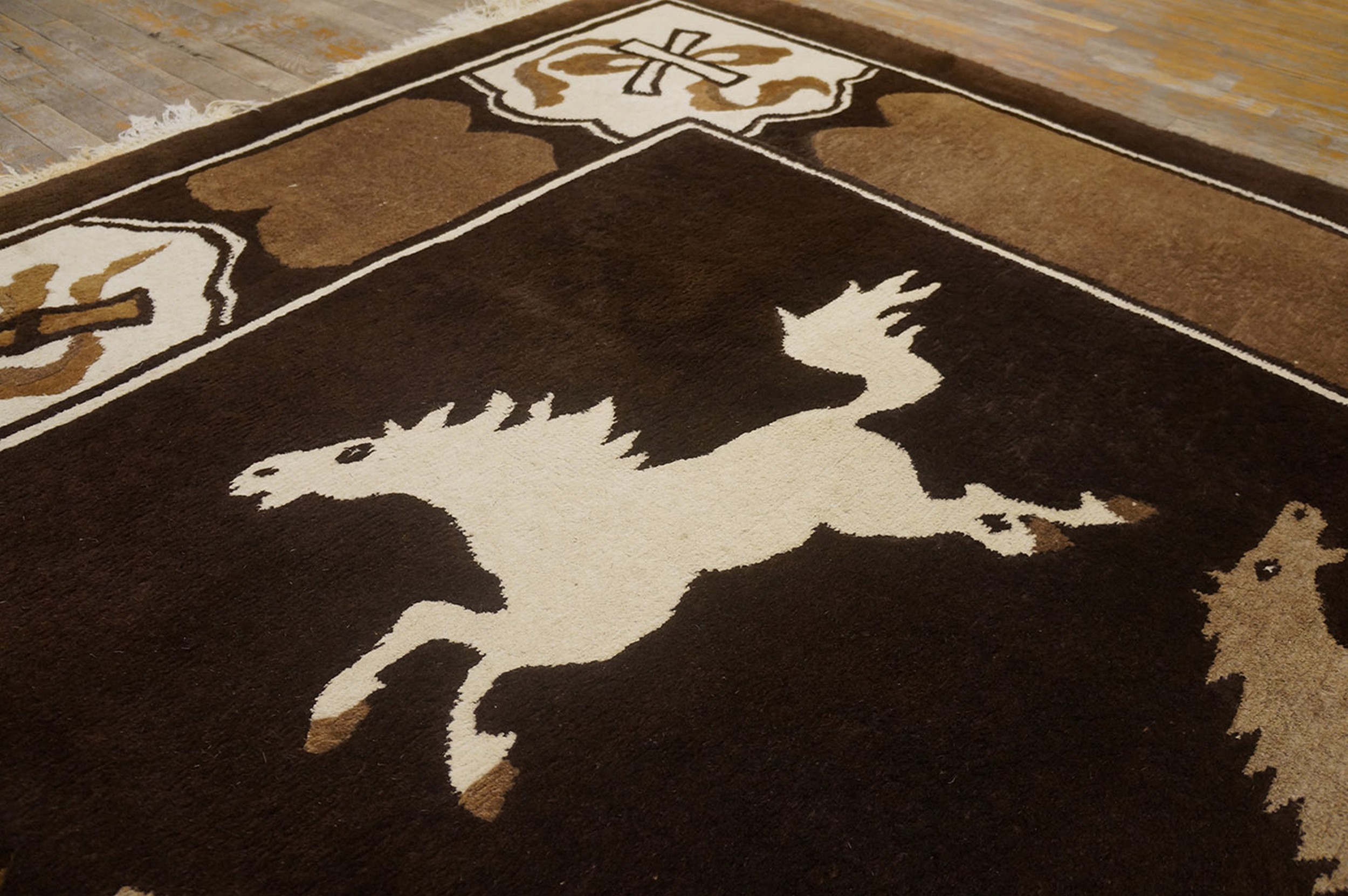 Antique Chinese Allover Knotted Rug, Circa Date: 1935. This exceptional piece exemplifies the dramatic aesthetic shifts occurring in Chinese weaving during the early 20th century. Dominated by a rich, nearly black ground, the design utilizes a limited palette of cream, taupe, and deep chocolate brown, characteristic of sophisticated earth tone color rugs.