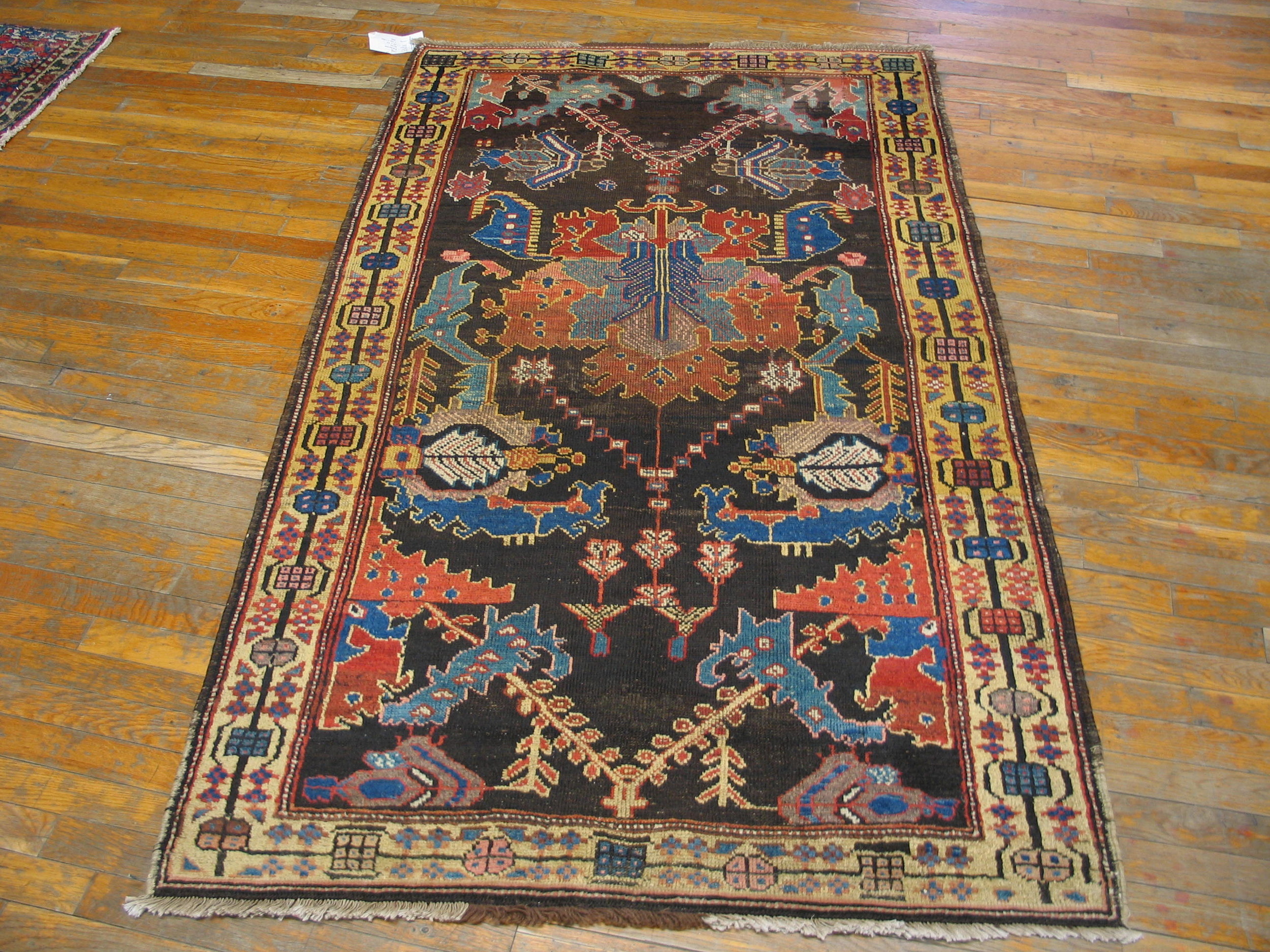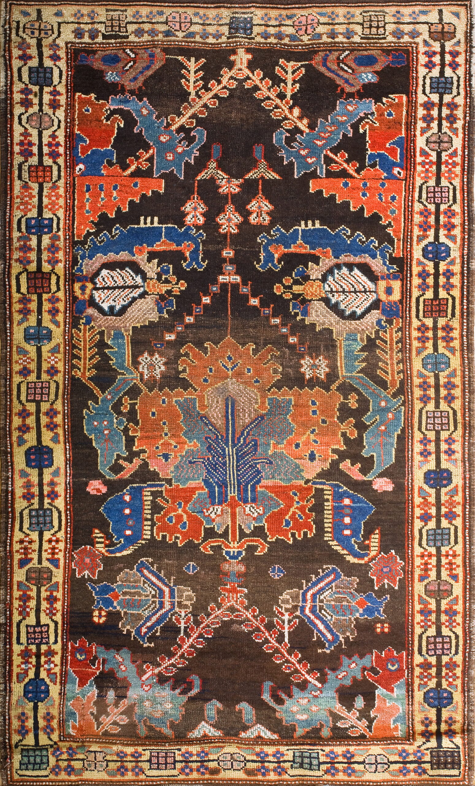 The central medallion features a highly stylized, totemic design, incorporating abstracted animal forms and bold, serrated leaves rendered in striking contrast. While many Bakhtiari pieces utilize garden panel designs, this example employs a powerful central axis built upon strong geometric patterns. The overall effect is primitive yet sophisticated, offering a genuine piece of textile history among antique rugs.