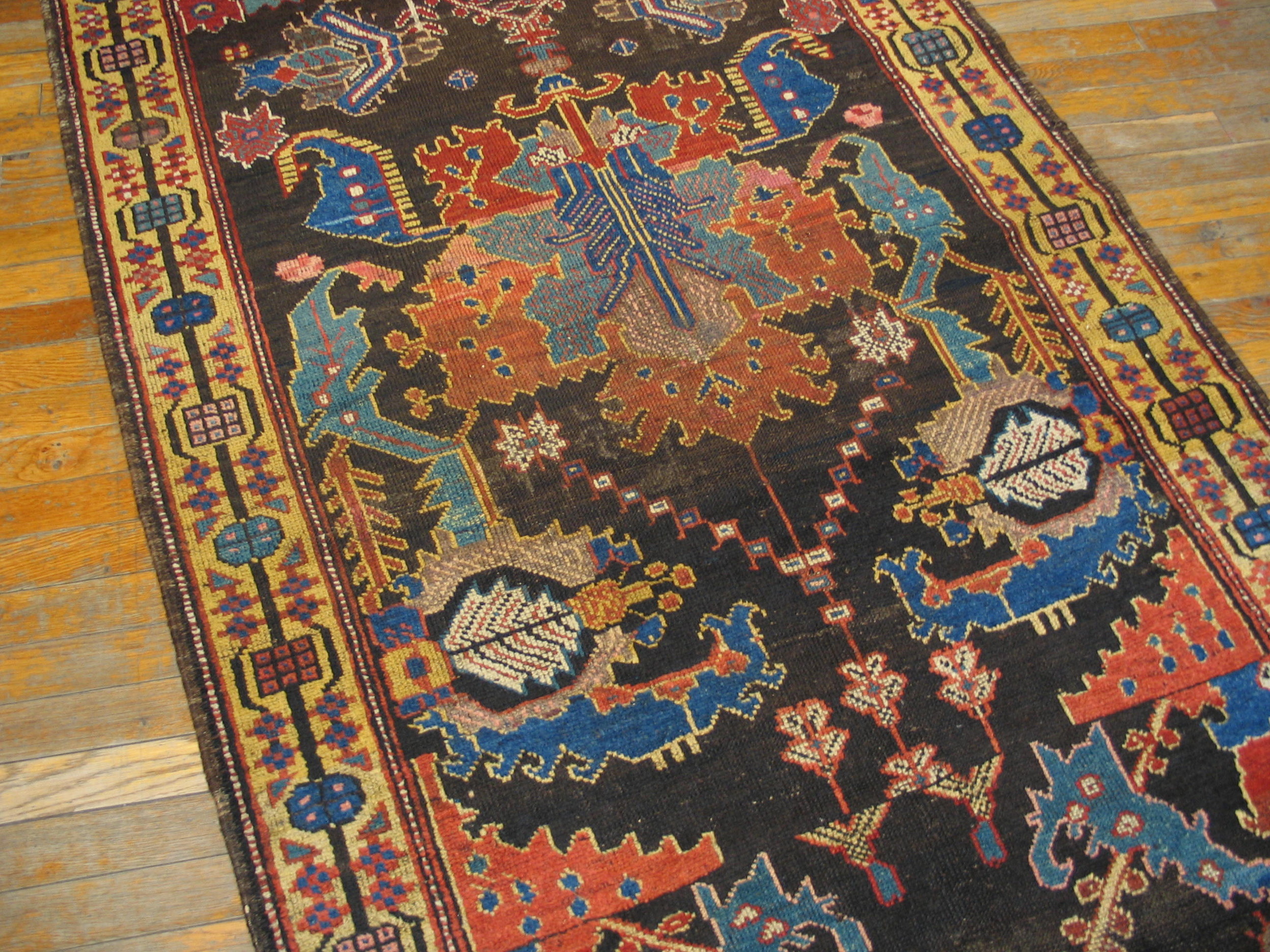 The multiple borders frame the composition with precision, utilizing alternating cartouches and small floral elements set against a light saffron ground, complementing the intensity of the field. This rug retains remarkable integrity for its age, displaying the patina and character expected of a genuine 1870s tribal weaving, making it a compelling acquisition for collectors seeking authenticity and powerful design.