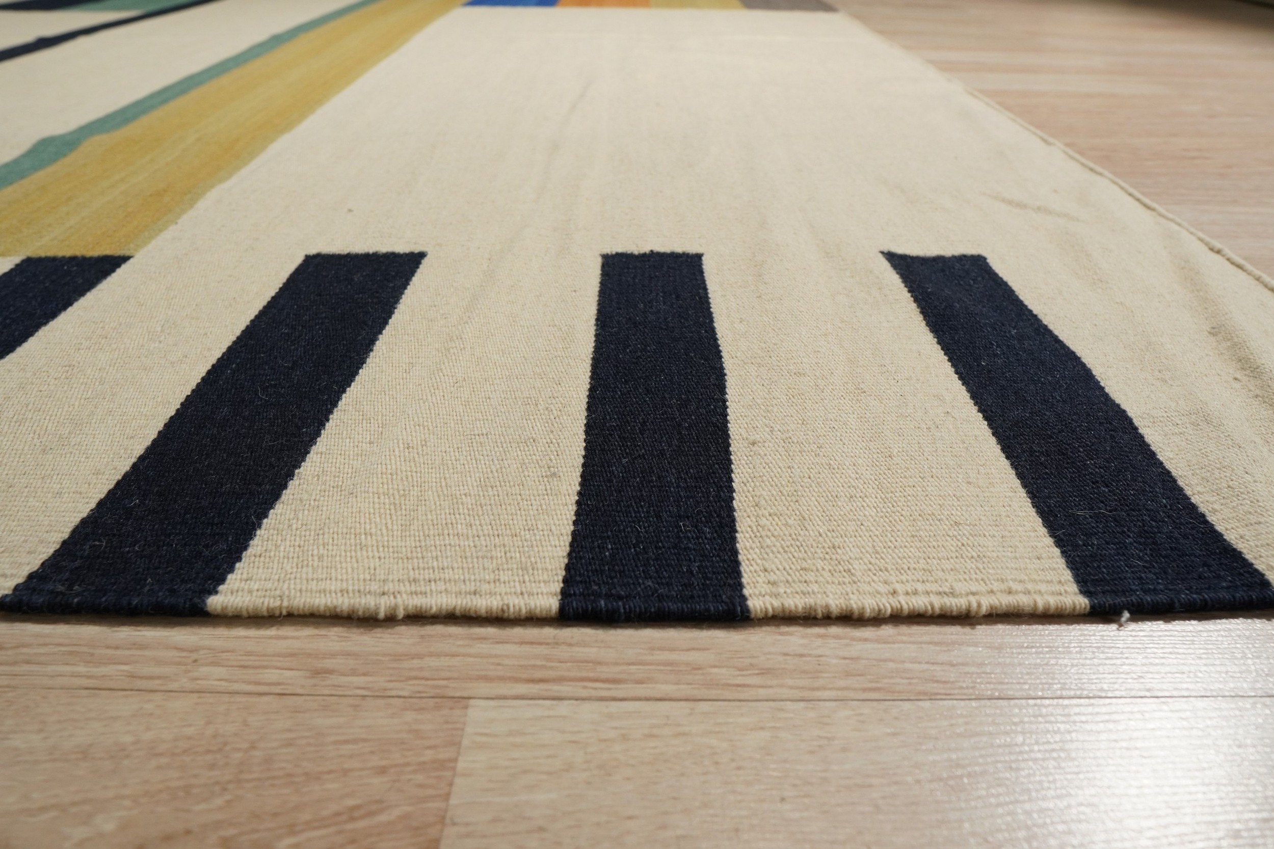 Celia Nadia Multicolor Flatweave Wool Rug, Country of Origin: India. This exceptional flatweave piece showcases the innovative spirit of contemporary design merged with the enduring weaving traditions found in Indian rugs. Crafted entirely from wool, the low-profile construction provides superior durability and a crisp, clean surface ideal for high-traffic areas.