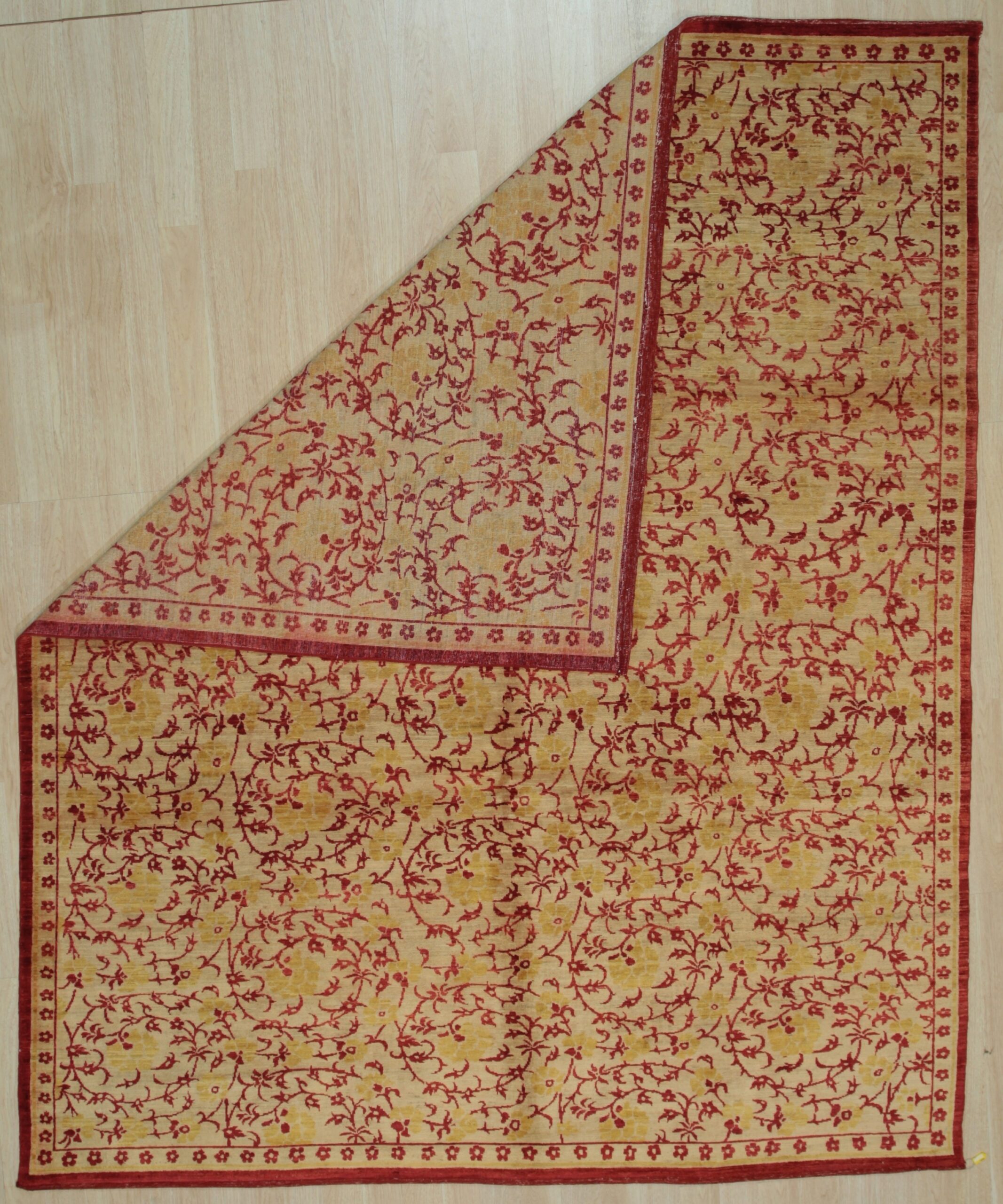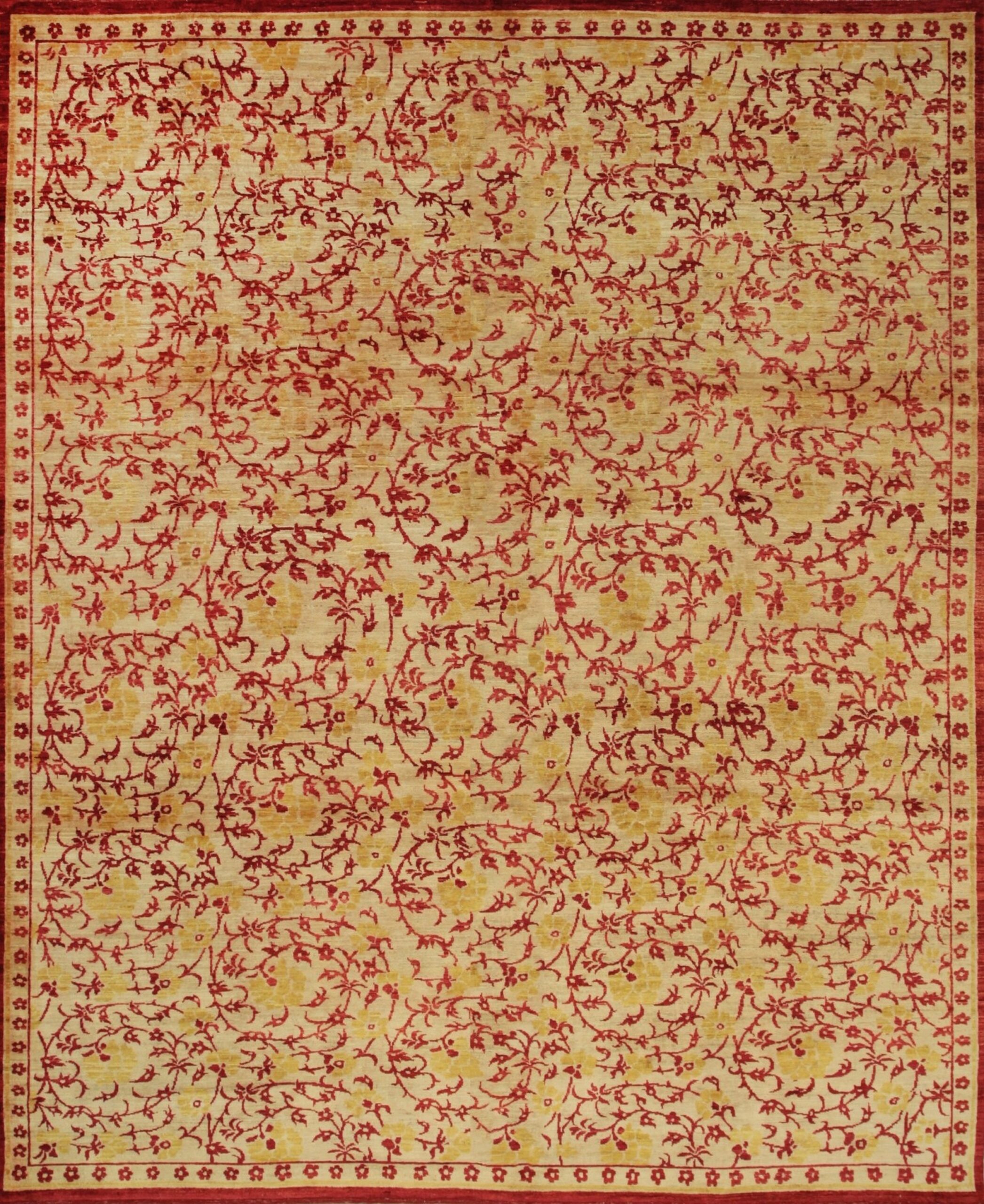 The continuous, meandering vine work offers a sophisticated transitional aesthetic, bridging traditional formality with modern fluidity. This dense, organic movement is contained by a bold, solid red main border featuring a delicate, repeating floral guard stripe, emphasizing the rug’s structural integrity. This particular design is often sought after for spaces requiring elongated dimensions, such as hallway runner rugs.