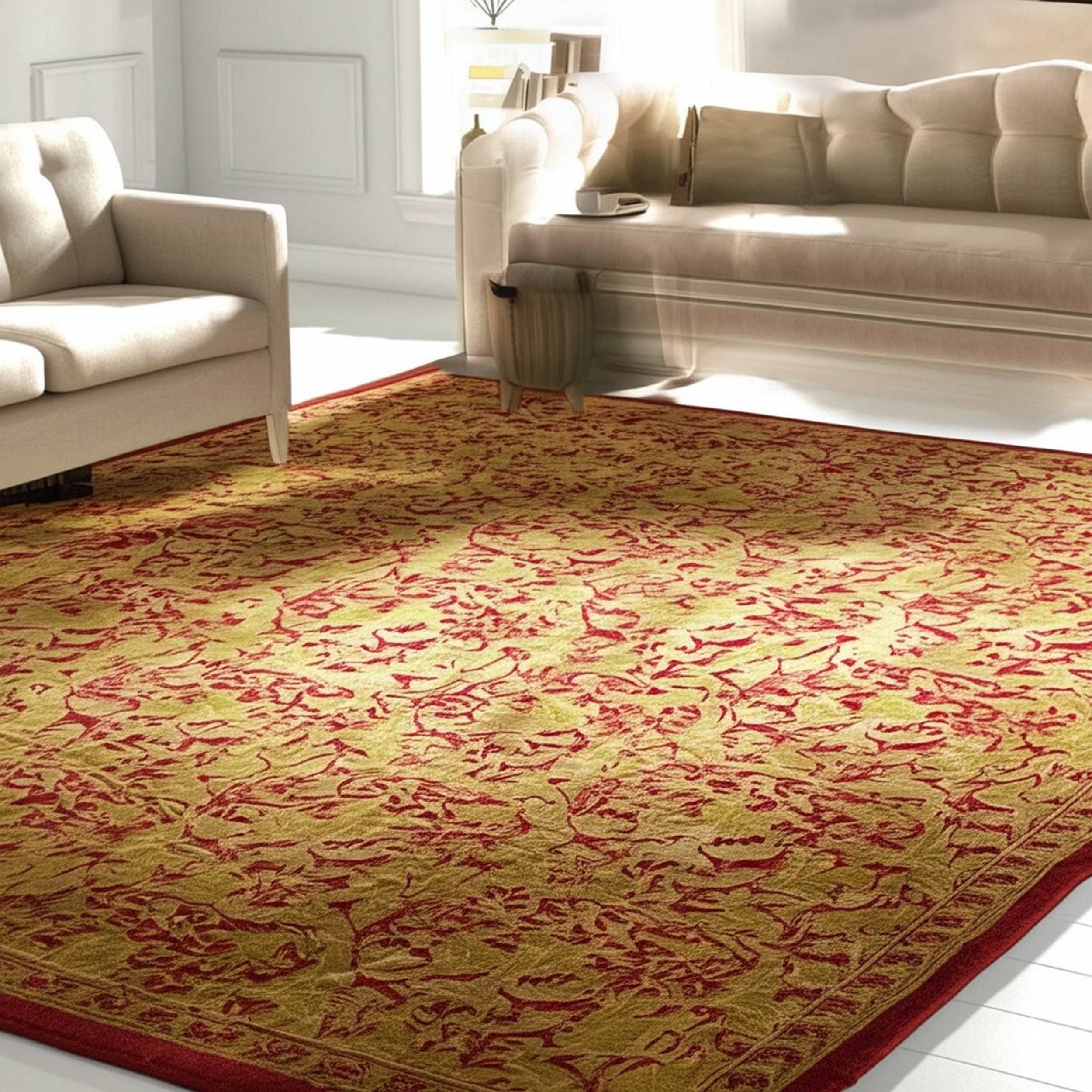 The design is characterized by a luminous field dominated by ivory beige cream white color rugs, providing a neutral yet rich foundation. Against this subtle ground, an intricate all-over pattern of scrolling vines and stylized blossoms is rendered in deep crimson and saffron tones, creating a dynamic visual rhythm that draws the eye across the entire composition.