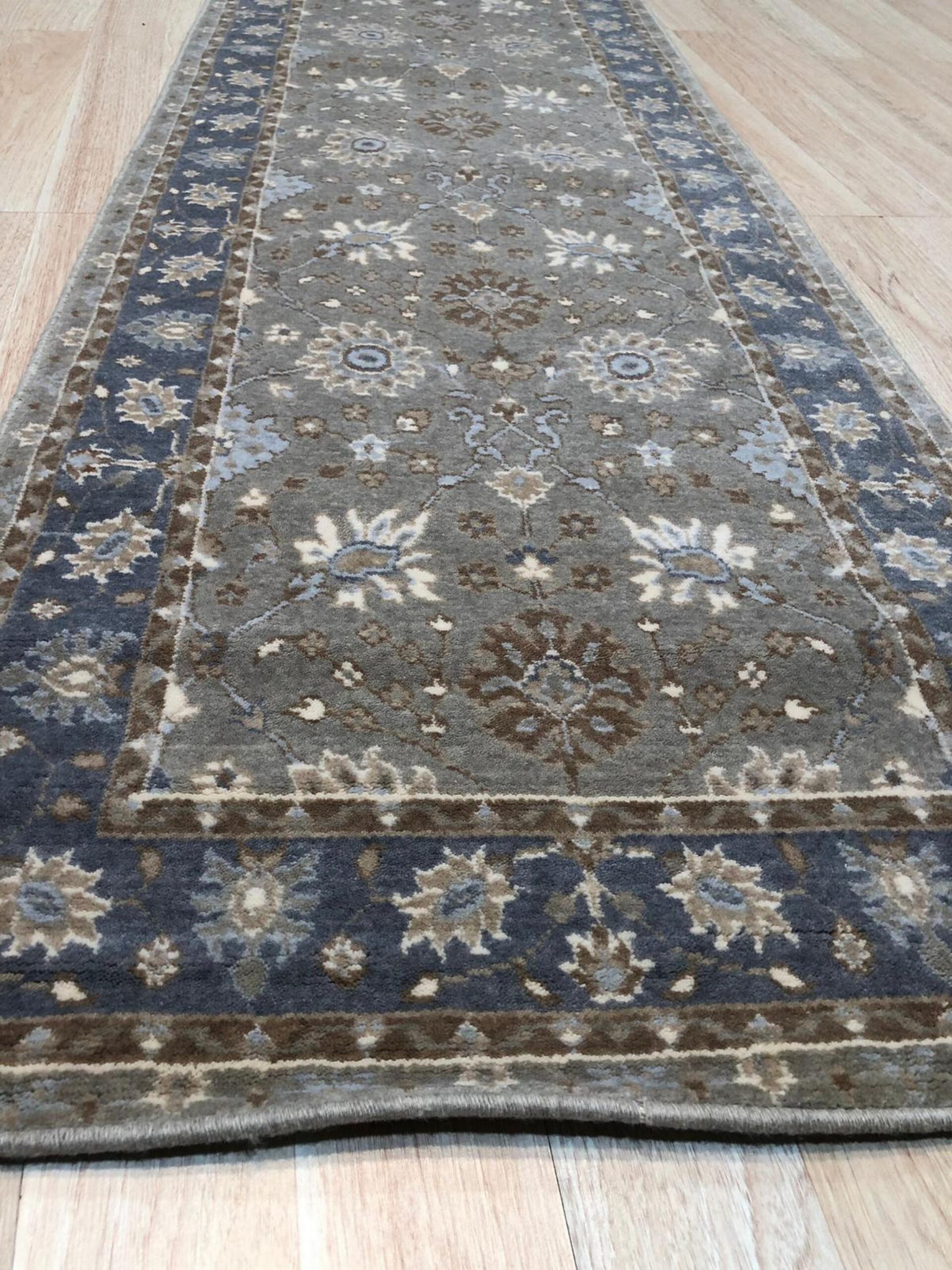 The design features an intricate, repeating trellis of stylized palmettes and delicate blossoms rendered in soft blue, rust, and cream. This all-over pattern avoids the formality of a central design, making it highly versatile for placement. Its elongated dimensions classify it perfectly among hallway runner rugs, ideal for defining corridors or transitional spaces with understated grace.