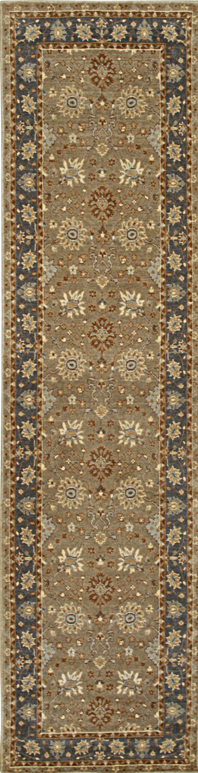 A striking, deep indigo border frames the composition, providing a necessary visual anchor against the lighter field. While many classical designs feature a prominent central medallion rugs, this Oushak interpretation utilizes a continuous, meandering vine pattern that allows the eye to travel smoothly along the length of the piece, emphasizing its linear form.