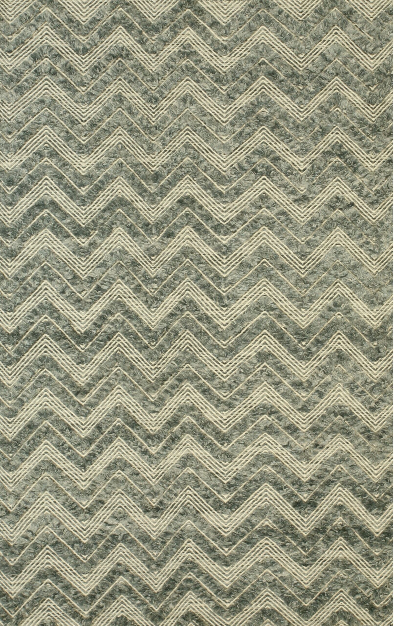 The palette is anchored by a sophisticated, muted Para Green, which provides a deep, textural background for the crisp, cream-colored zigzag lines. The high-low contrast in the weave—where the background is soft and shaggy, while the pattern lines are tightly woven—creates a dynamic visual and tactile experience, making this an exceptional example of green color rugs suited for contemporary interiors.