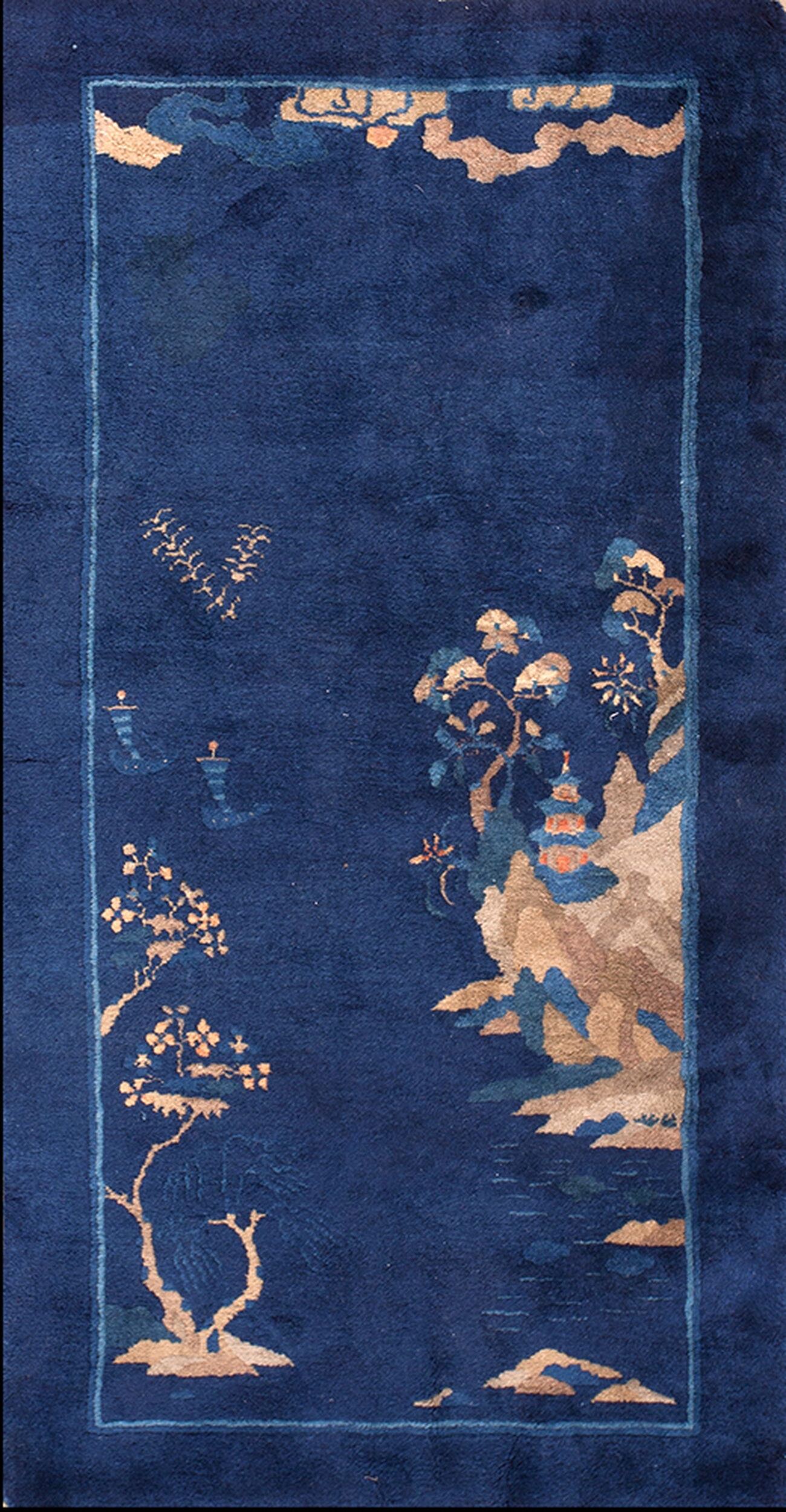 Chinese 1920s Blue – Peking Rectangle Small Scatter Size Knotted Wool Antique Rug, Circa Date: 1920s. This exceptional example of early 20th-century Chinese weaving is defined by its dramatic, saturated indigo field, a hallmark of the finest blue color rugs from the Peking region.