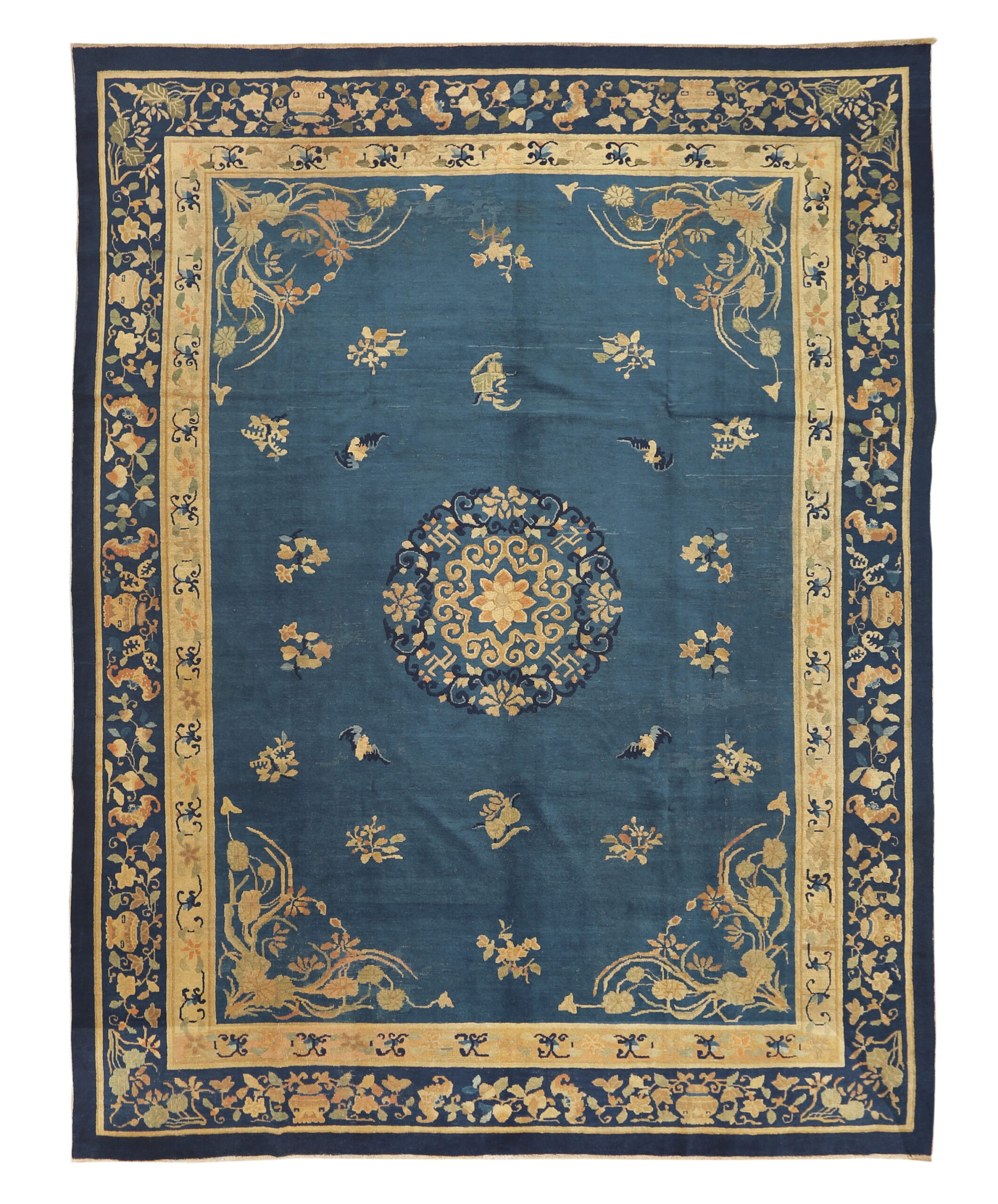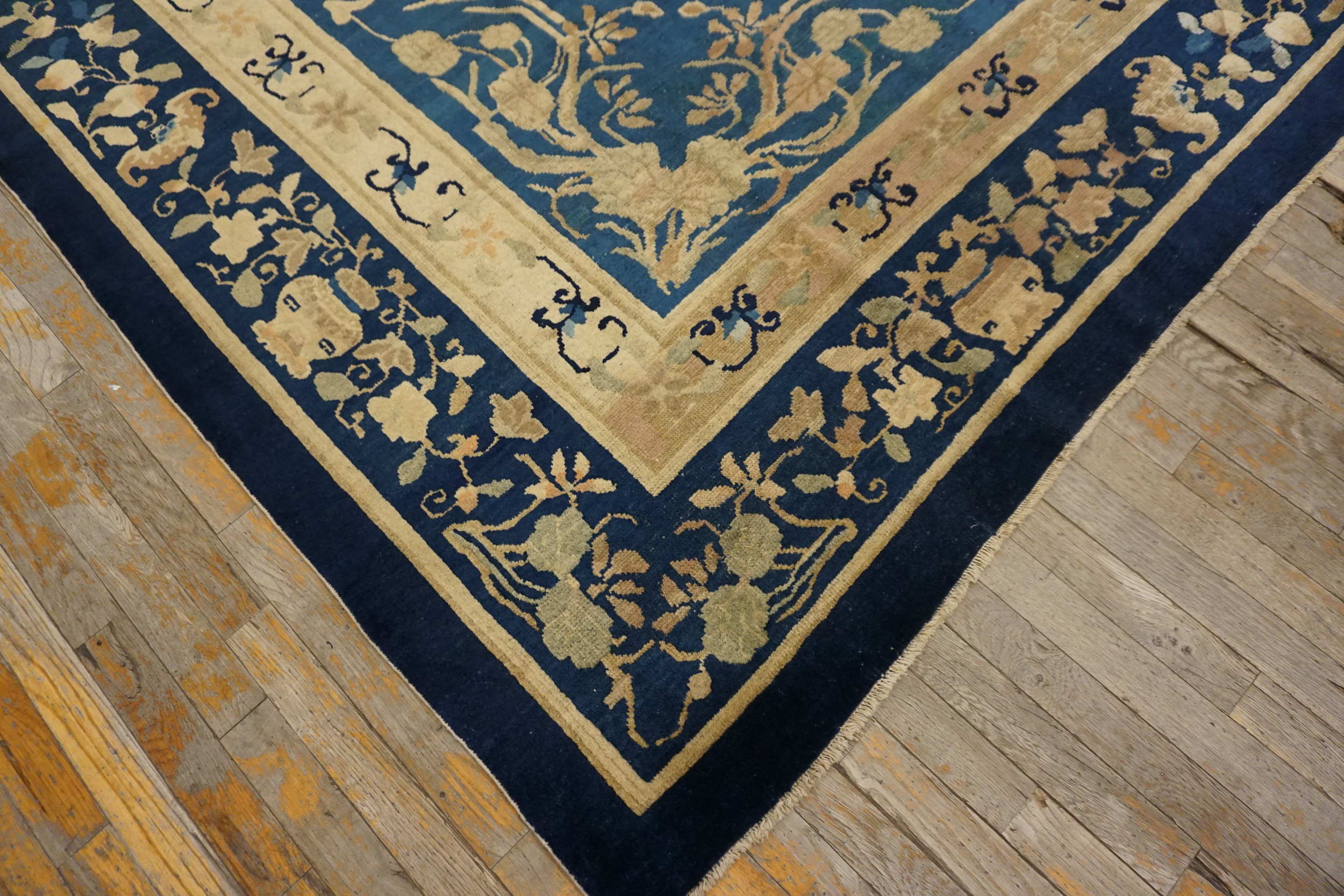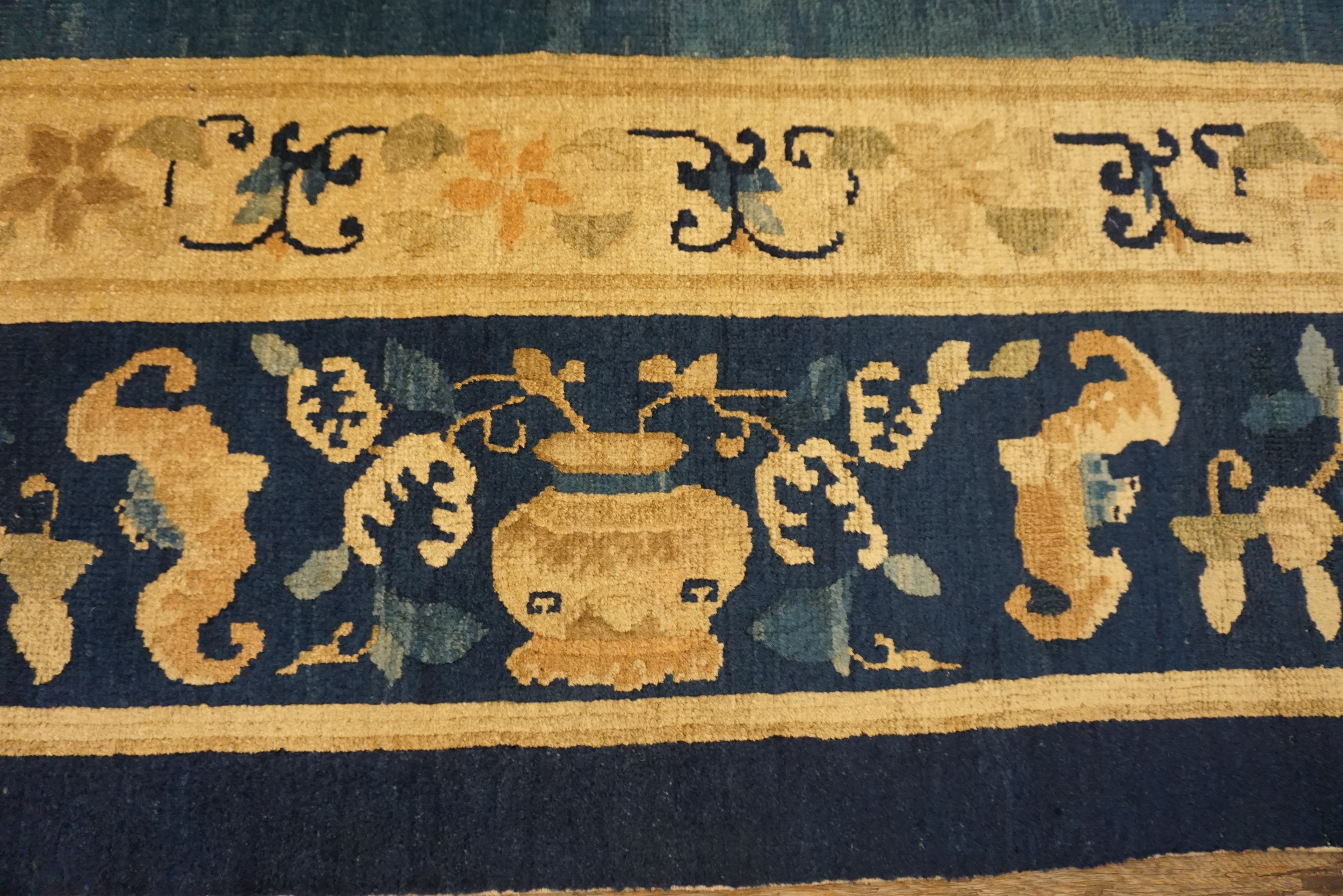 Chinese Antique Knotted 1930s Wool Rectangle Blue Room Size – Peking Rug, Circa Date: 1930s. This exceptional example of Chinese weaving presents a classic Peking aesthetic, characterized by its luxurious wool pile and masterful execution. Dating to the period of antique rugs, this piece captures the transition between traditional court designs and the more open, sophisticated compositions favored during the early 20th century.