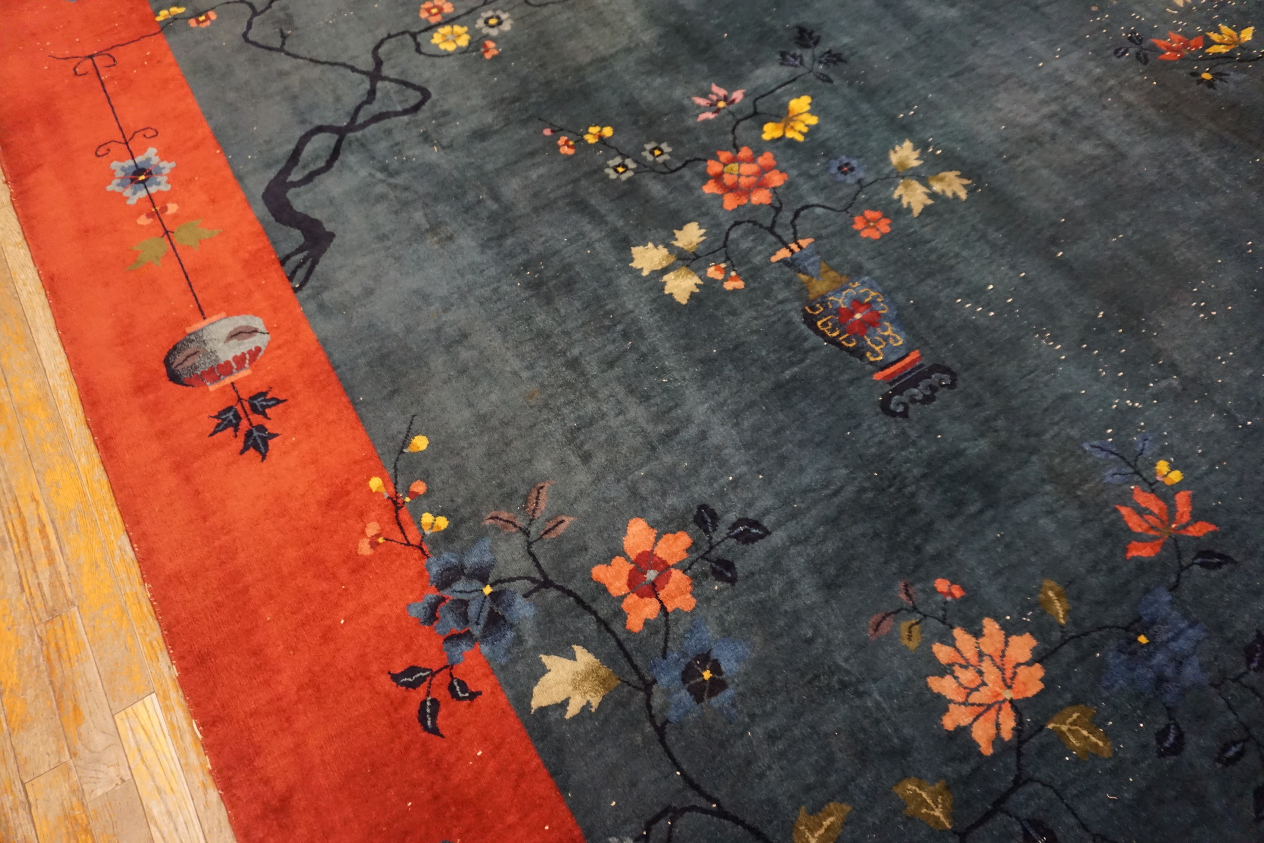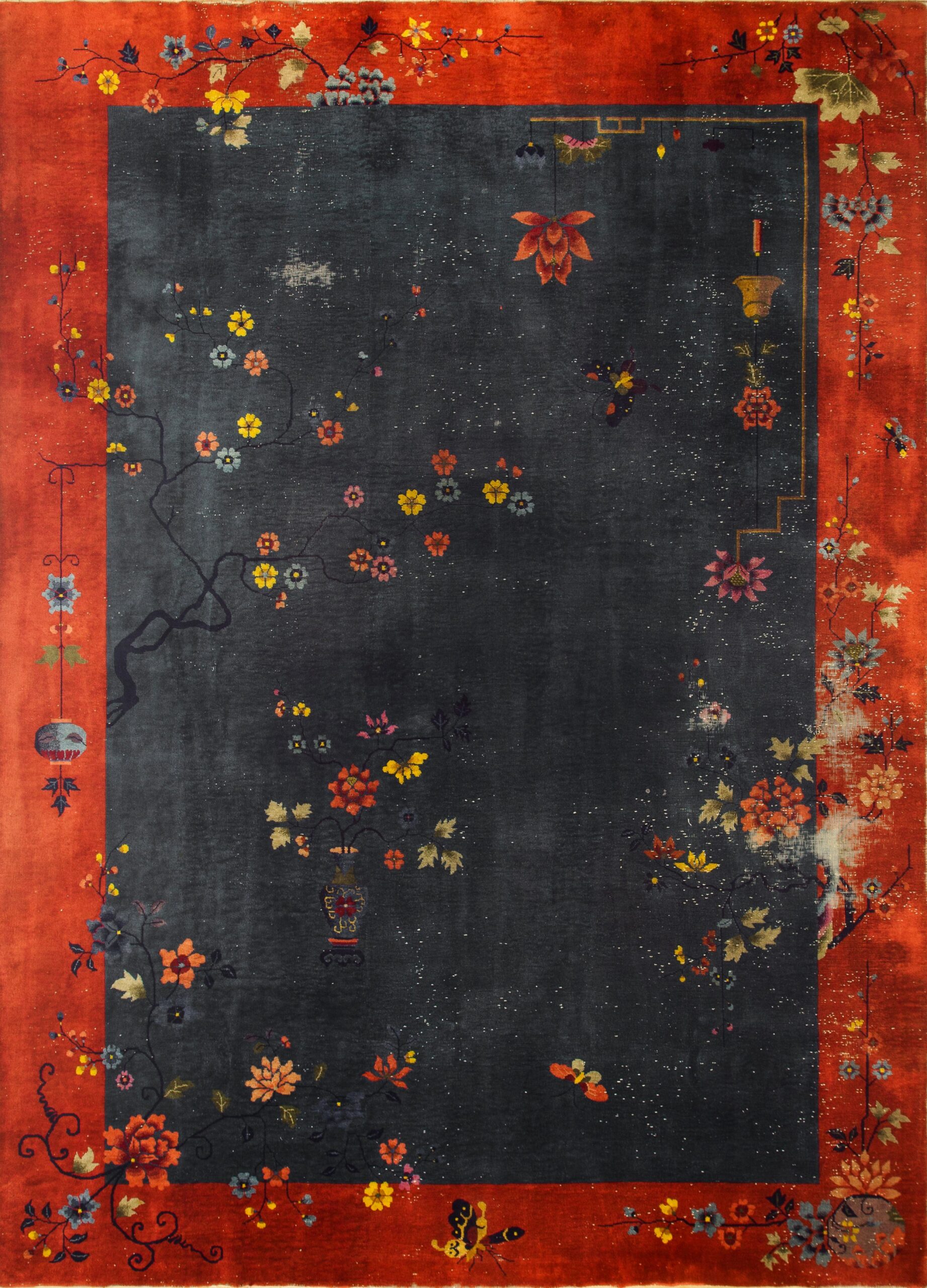 Chinese – Art Deco Rectangle 1920s Knotted Antique Blue Wool Room Size Rug, Circa Date: 1920s. This exceptional piece captures the transitional elegance of early 20th-century Chinese weaving, blending traditional craftsmanship with the nascent influence of Western Art Deco sensibilities. As a prime example among antique rugs, its construction and material quality speak to its enduring value and historical significance.