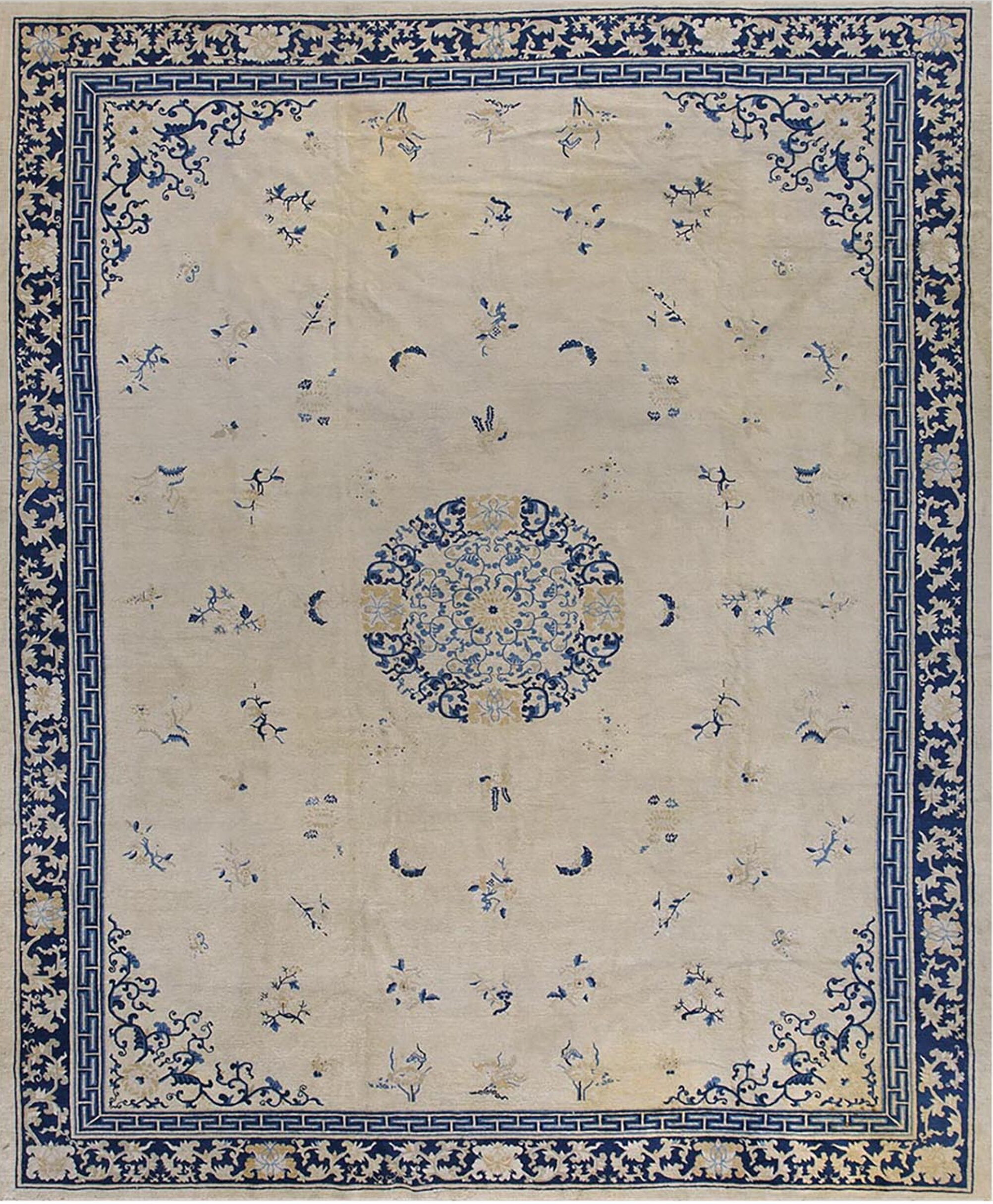 Chinese Ivory Knotted Room Size – Peking Antique Rectangle 1920s Wool Rug, Circa Date: 1920s. This exceptional example of early 20th-century Chinese weaving presents a sophisticated aesthetic typical of the Peking workshops. Its generous dimensions classify it among desirable room size rugs, making it an ideal anchor for a grand interior space.