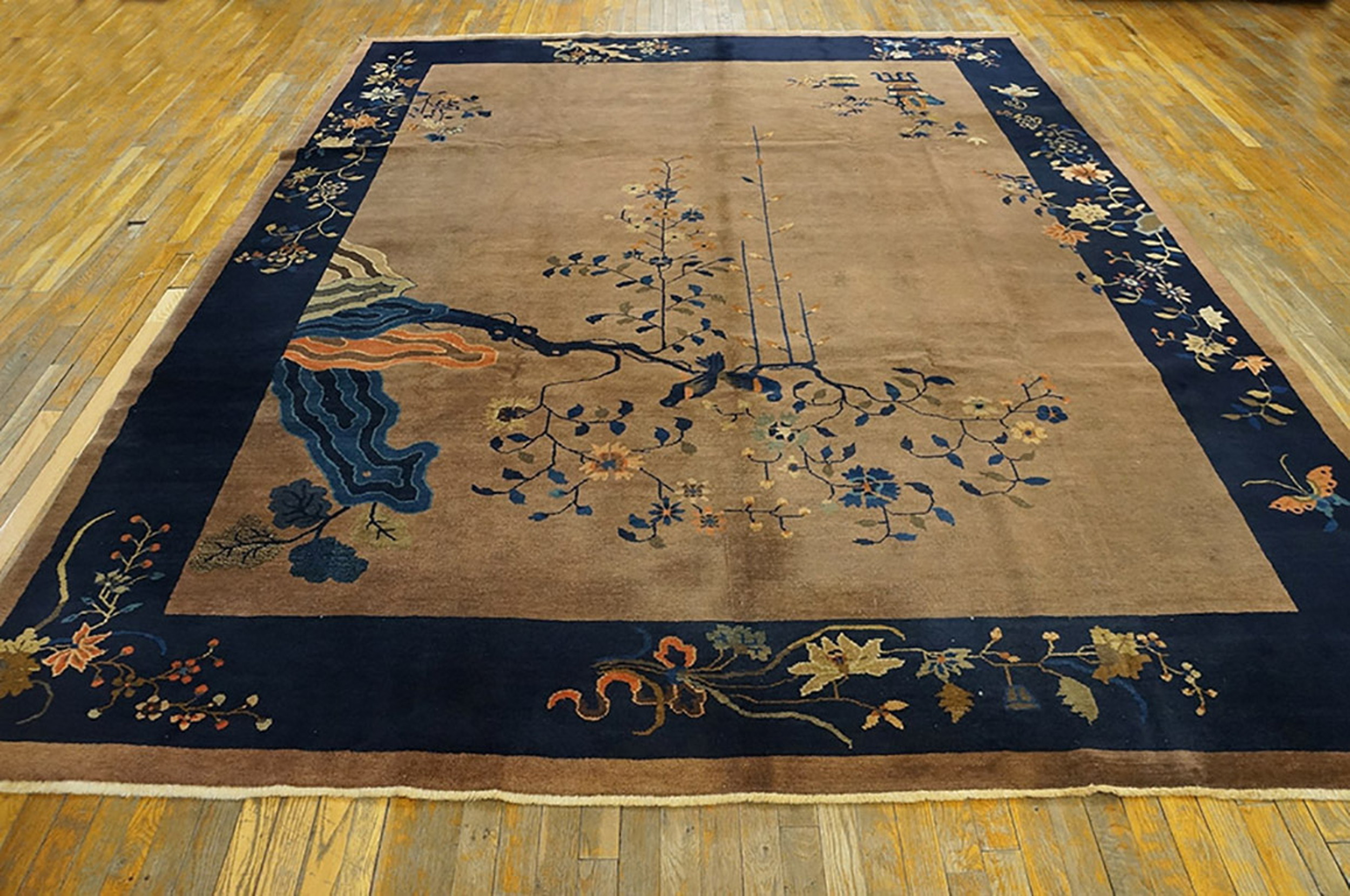 Characteristic of the period, the design features an asymmetrical arrangement dominated by a flowering branch where two birds perch, symbolizing harmony and longevity. The border utilizes classic Chinese floral rugs patterns, depicting various blossoms and trailing vines against the dark blue ground, maintaining visual interest without overwhelming the central space.