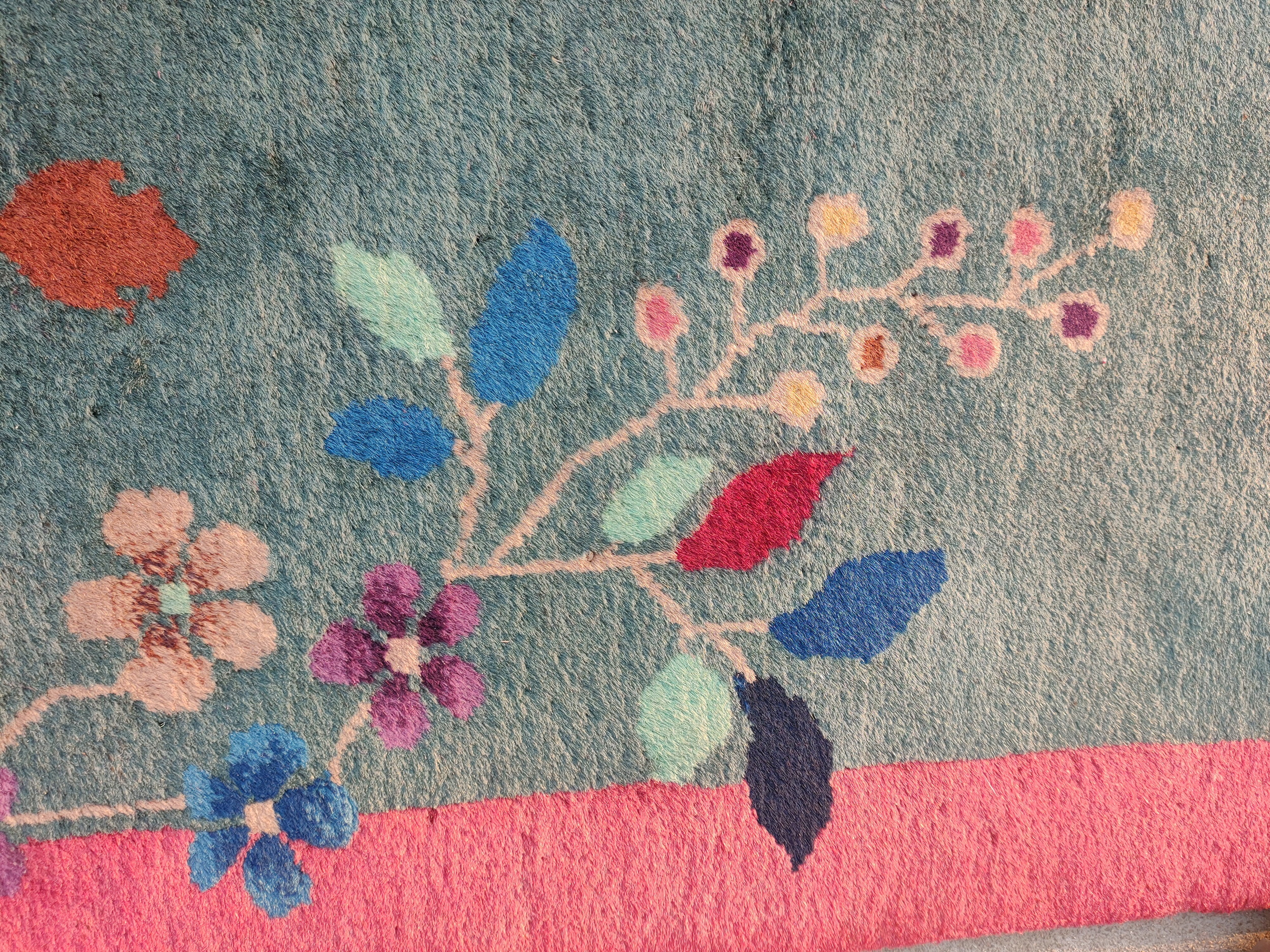 Chinese Knotted – Art Deco Rectangle Antique Wool Purple 1920s Room Size Rug, Circa Date: 1920s. This exceptional example of Chinese Art Deco weaving represents a pinnacle of early 20th-century design, blending traditional Eastern iconography with the bold, modern aesthetics of the West. As one of our finest antique rugs, its condition and saturation are remarkable given its age and provenance.