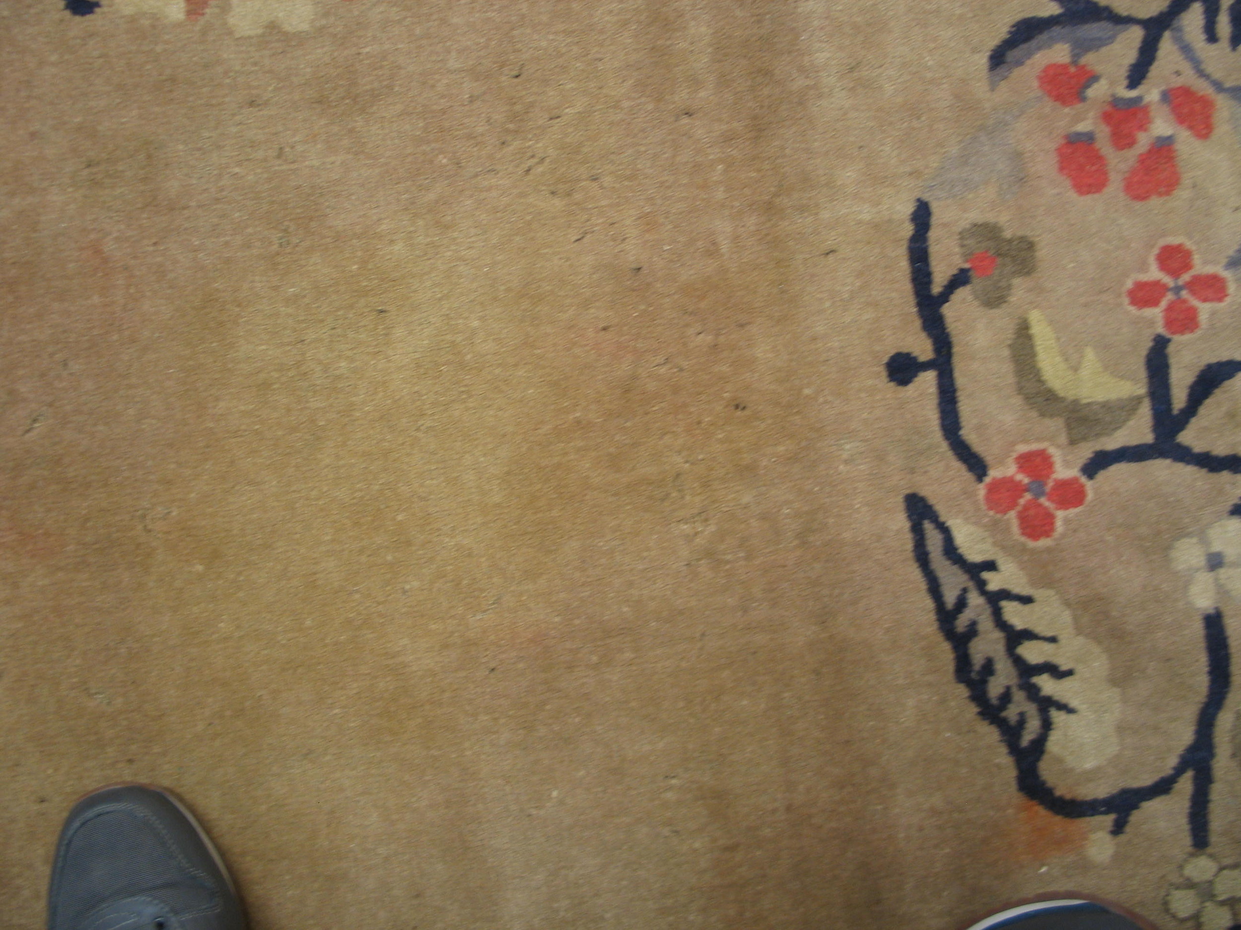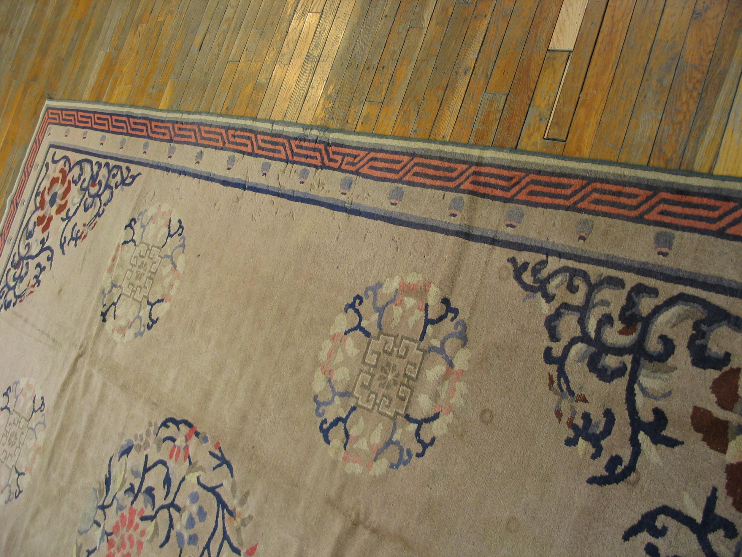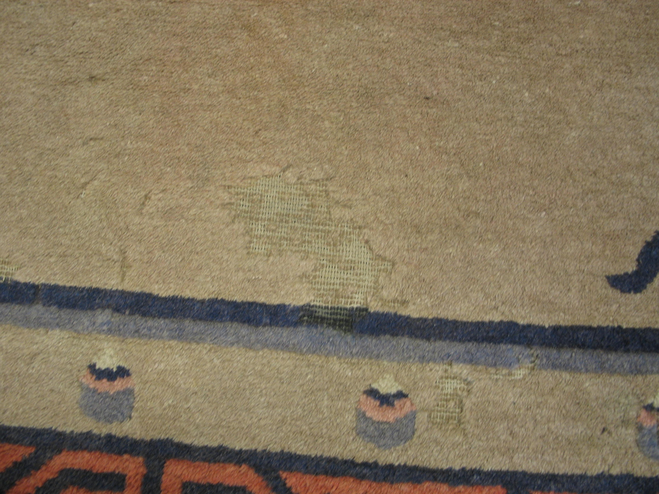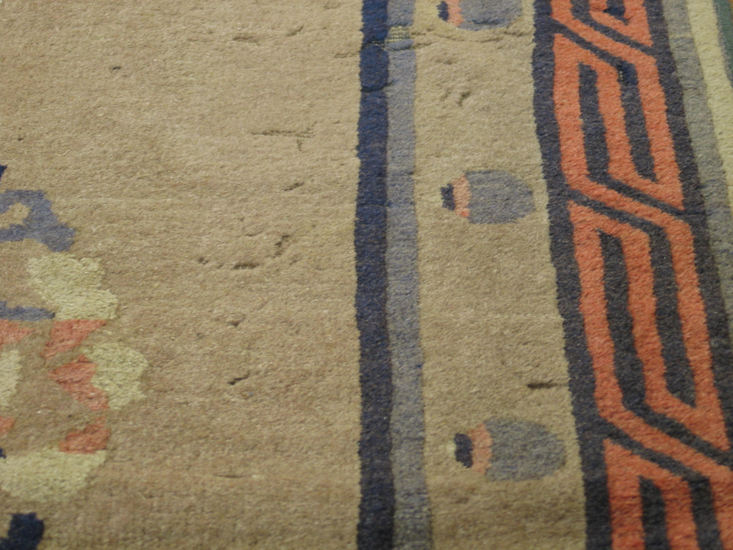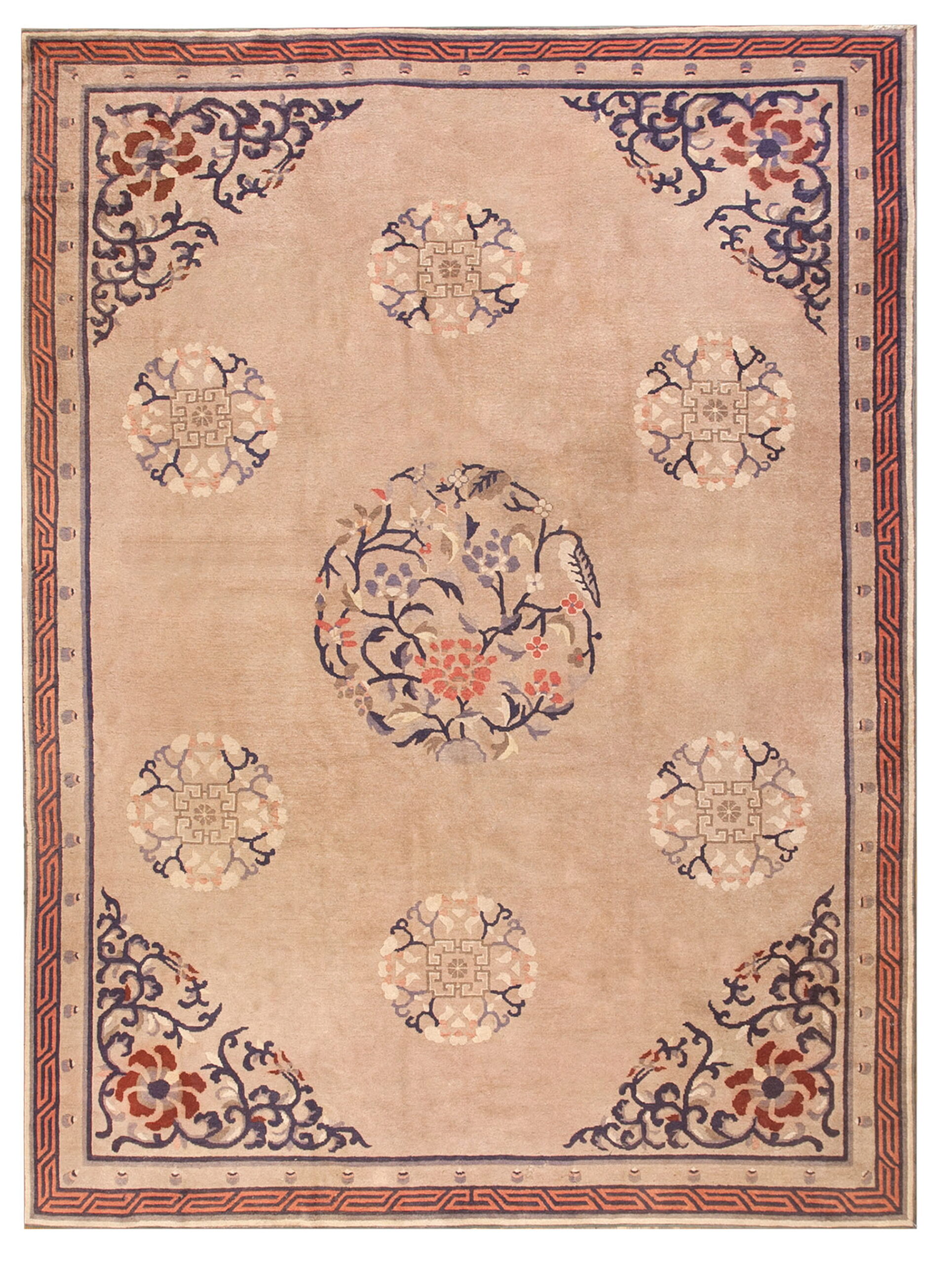 The expansive field is rendered in a subtle, warm ivory color rugs, providing a serene backdrop that highlights the detailed motifs without overwhelming the eye. This restrained palette is characteristic of the finest Peking productions, which often prioritized soft, natural dyes to achieve a harmonious and calming effect within the composition.