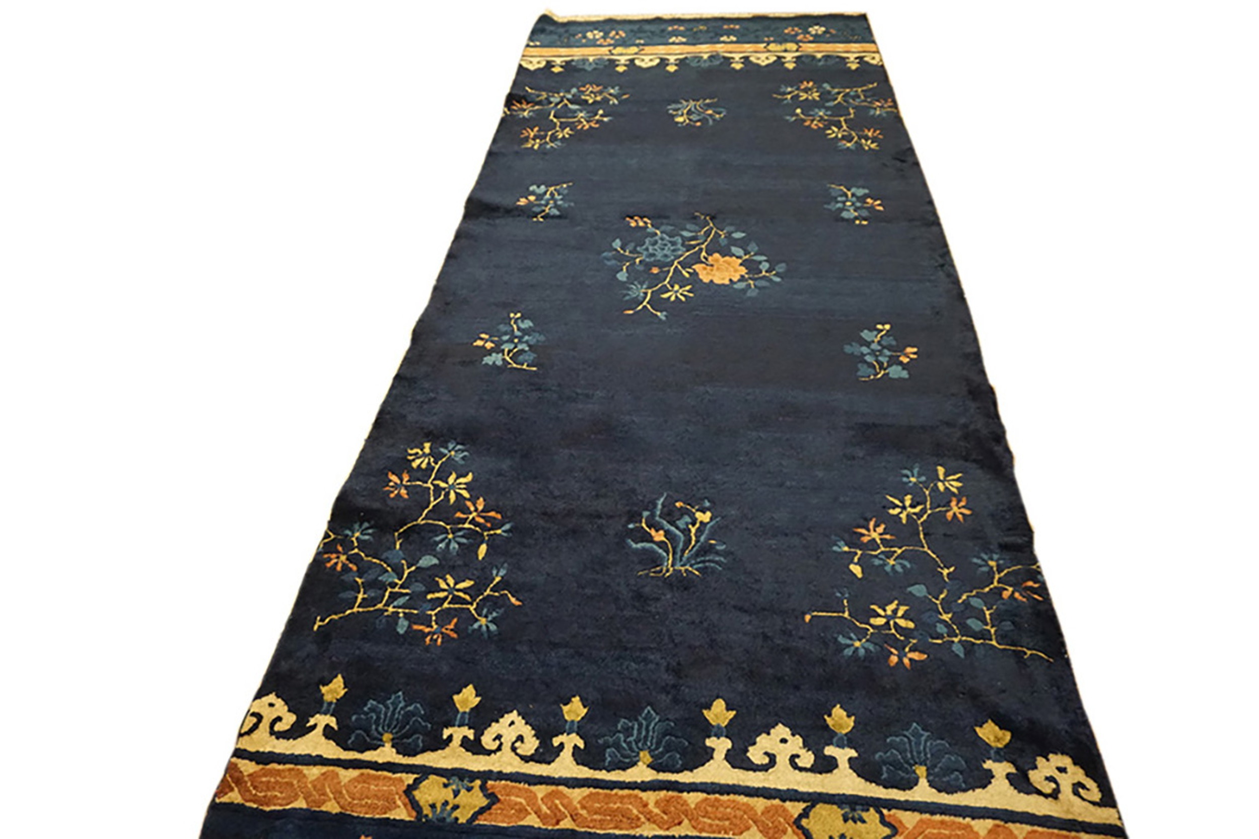 Chinese – Peking 1920s Antique Rectangle Wool Hallway Runner Knotted Blue Rug, Country of Origin: China, Circa Date: 1920s. This exquisite piece exemplifies the refined aesthetic of early 20th-century Chinese rugs, specifically embodying the distinct, often minimalist, design characteristics associated with peking rugs. Woven from high-quality wool, the runner presents a deep, saturated indigo field that allows the delicate floral and vine motifs to float gracefully across the surface.