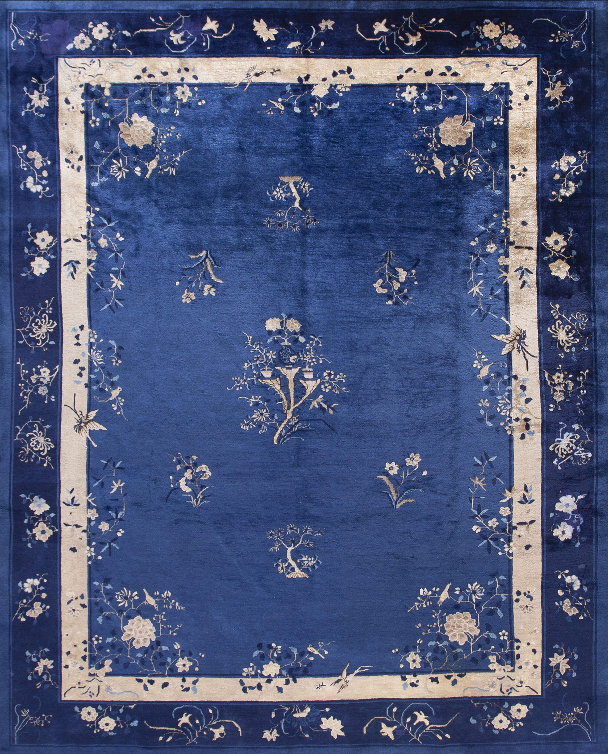The rug features a breathtaking deep blue field that provides a luxurious, velvety backdrop for the sparse, naturalistic design elements. The use of this vibrant hue, characteristic of the best Peking production, establishes a sense of tranquility and depth, perfectly complementing the soft, undyed ivory and pale gold accents used in the primary border and scattered motifs.