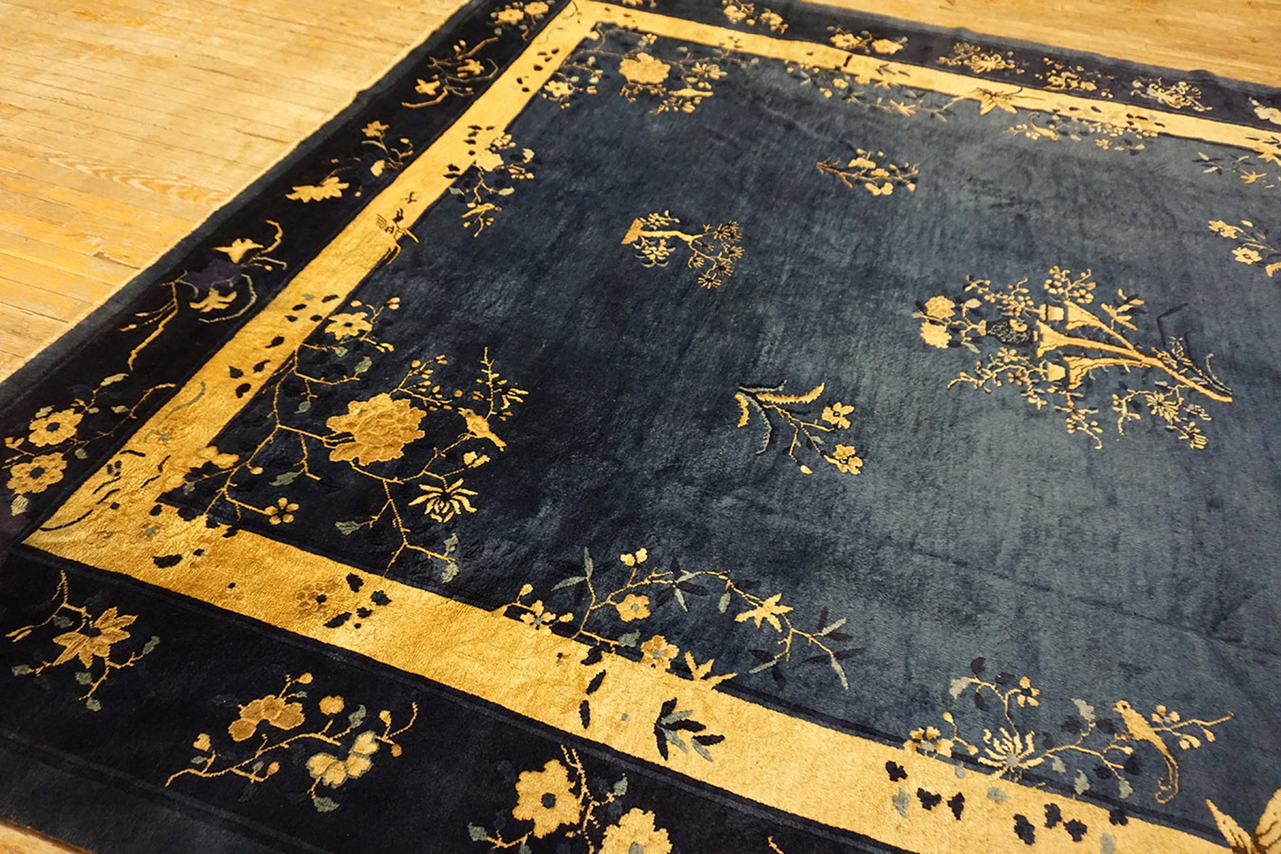 Chinese – Peking 1920s Blue Wool Knotted Antique Room Size Rectangle Rug, Circa Date: 1920s. This exceptional example of early 20th-century Chinese weaving presents a striking aesthetic defined by its saturated color palette and elegant composition. Its generous room size format makes it an ideal centerpiece for a grand interior space, reflecting the luxurious scale of the period’s design sensibilities.