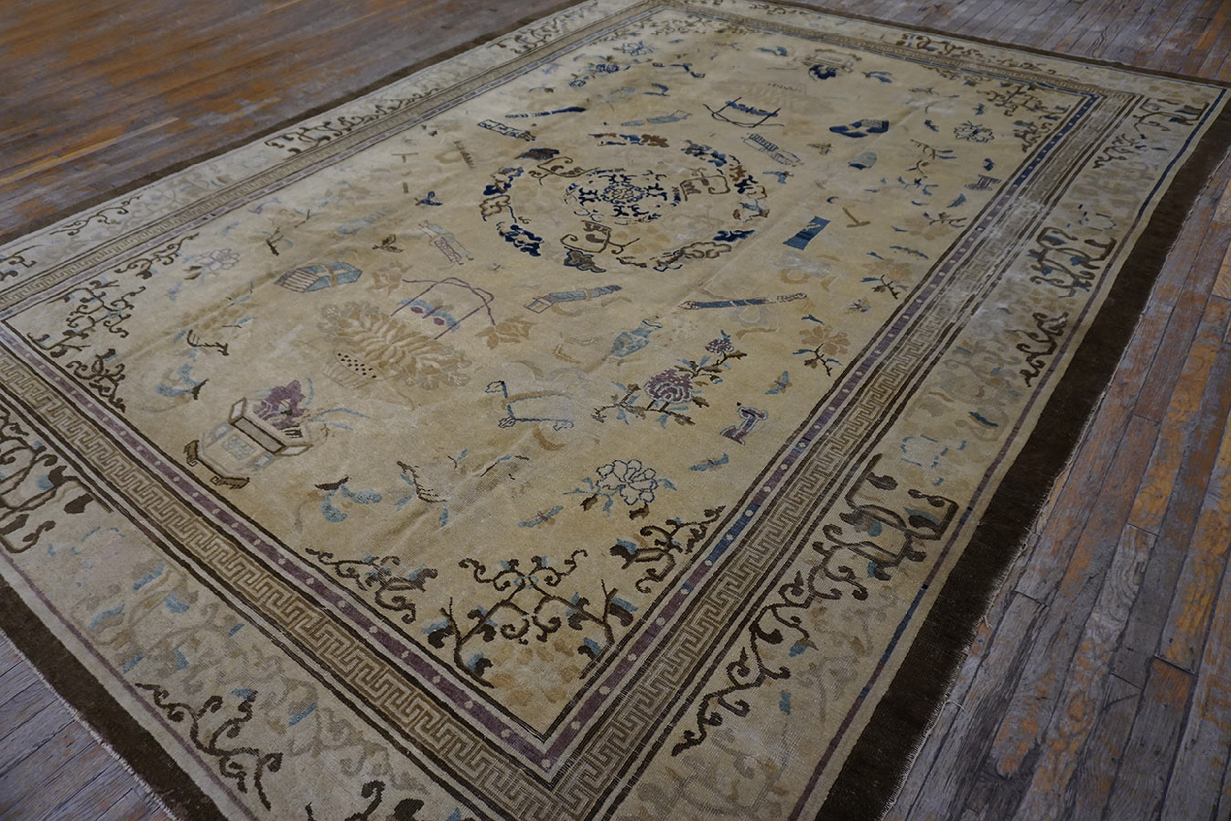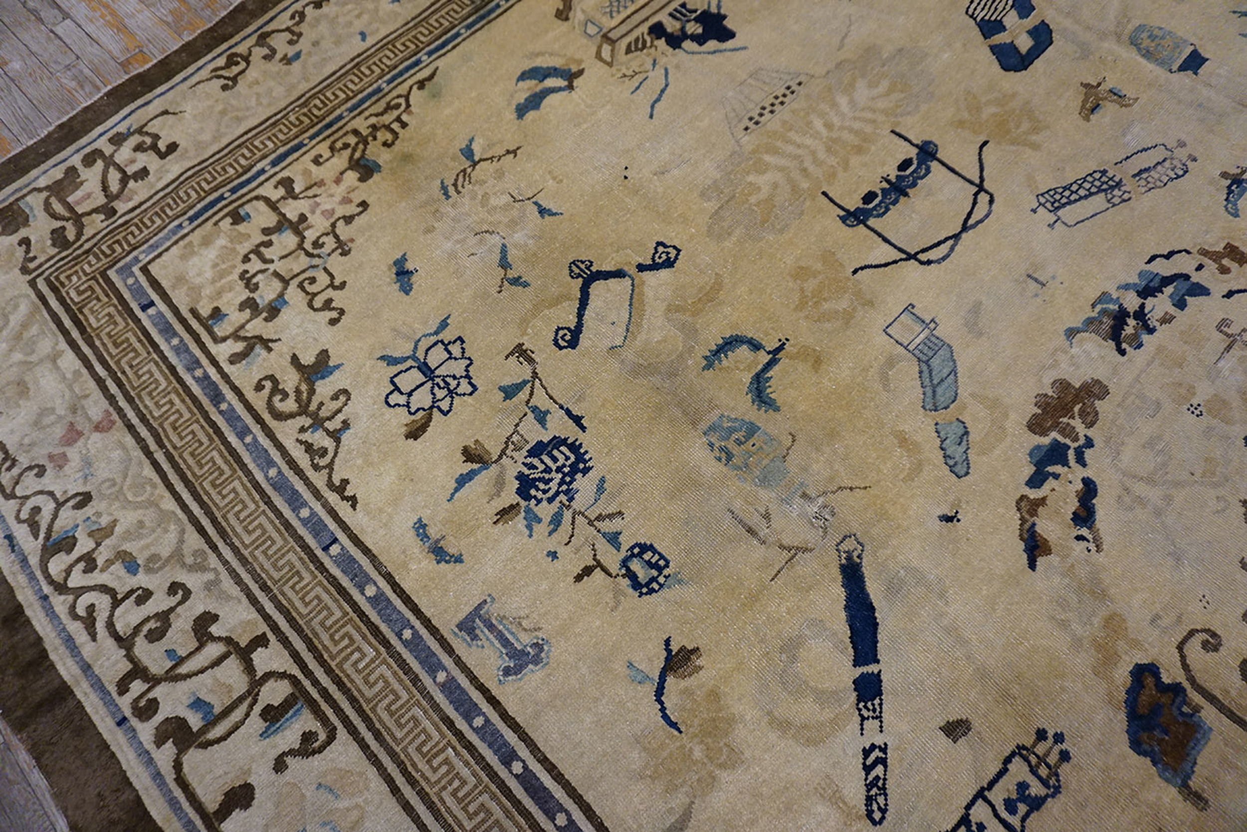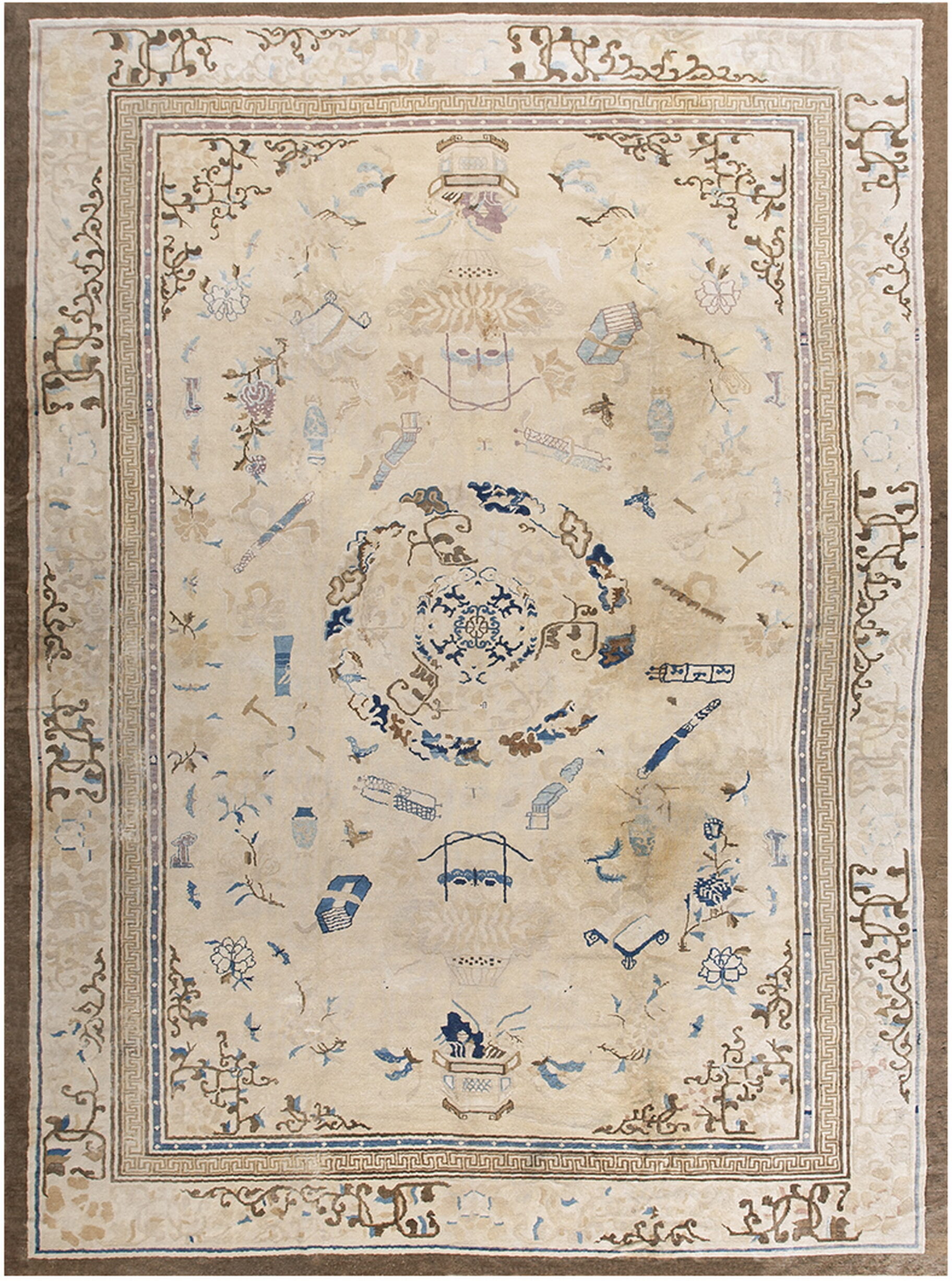 The border system utilizes classic Chinese fretwork and scrolling vine patterns in muted browns and pale blues, neatly containing the expansive field. As a genuine piece from the 1880s, this rug represents a significant investment in textile history and remains highly sought after by collectors of exceptional antique rugs.