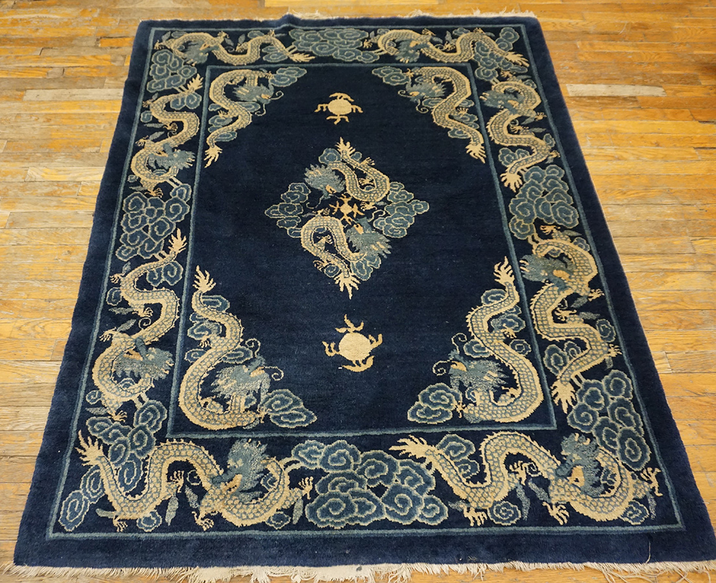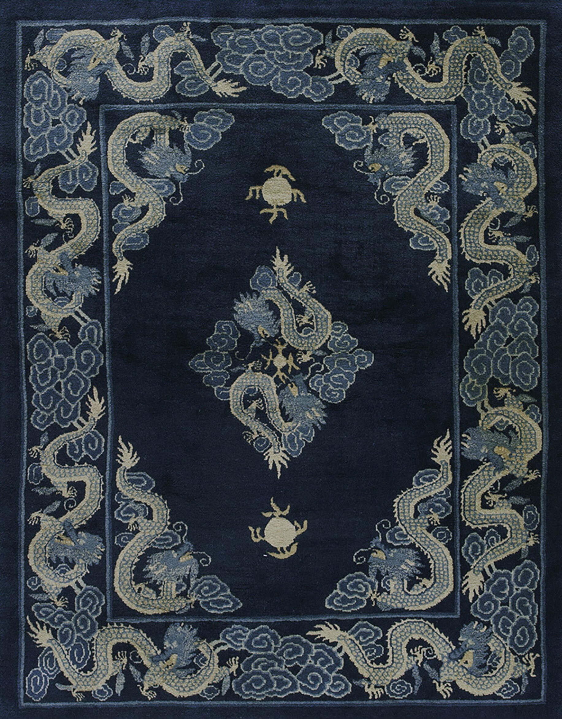 The palette is dominated by a rich, saturated indigo, creating a dramatic deep blue field that serves as a powerful backdrop for the contrasting motifs. The use of blue in Peking rugs of this era often signified status and tranquility, lending the piece a reserved yet authoritative presence. Secondary colors are subtle, utilizing pale ivory and lighter shades of azure to define the intricate details of the border.