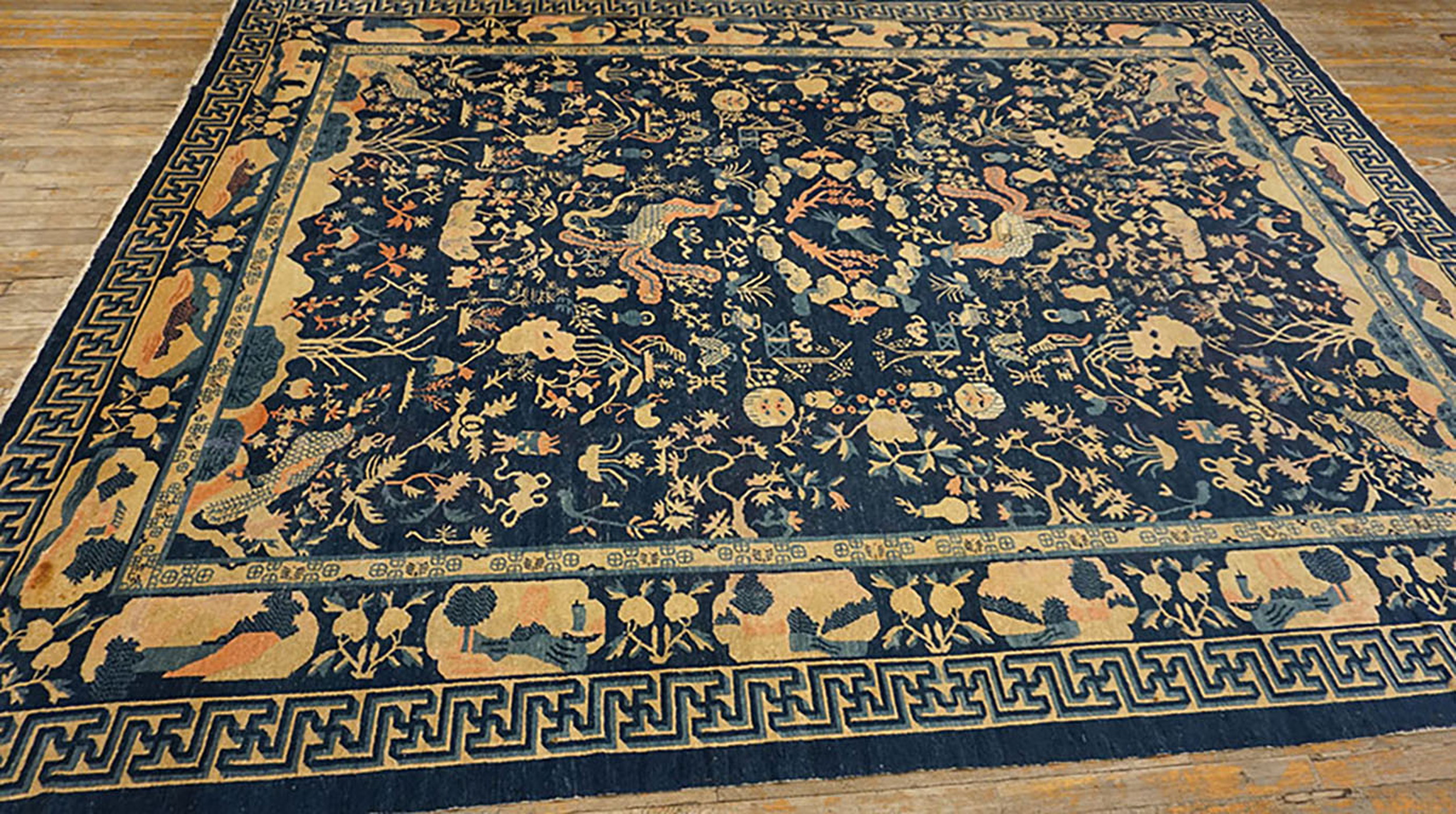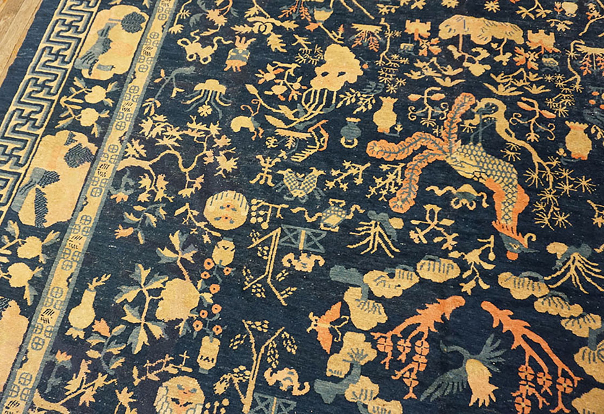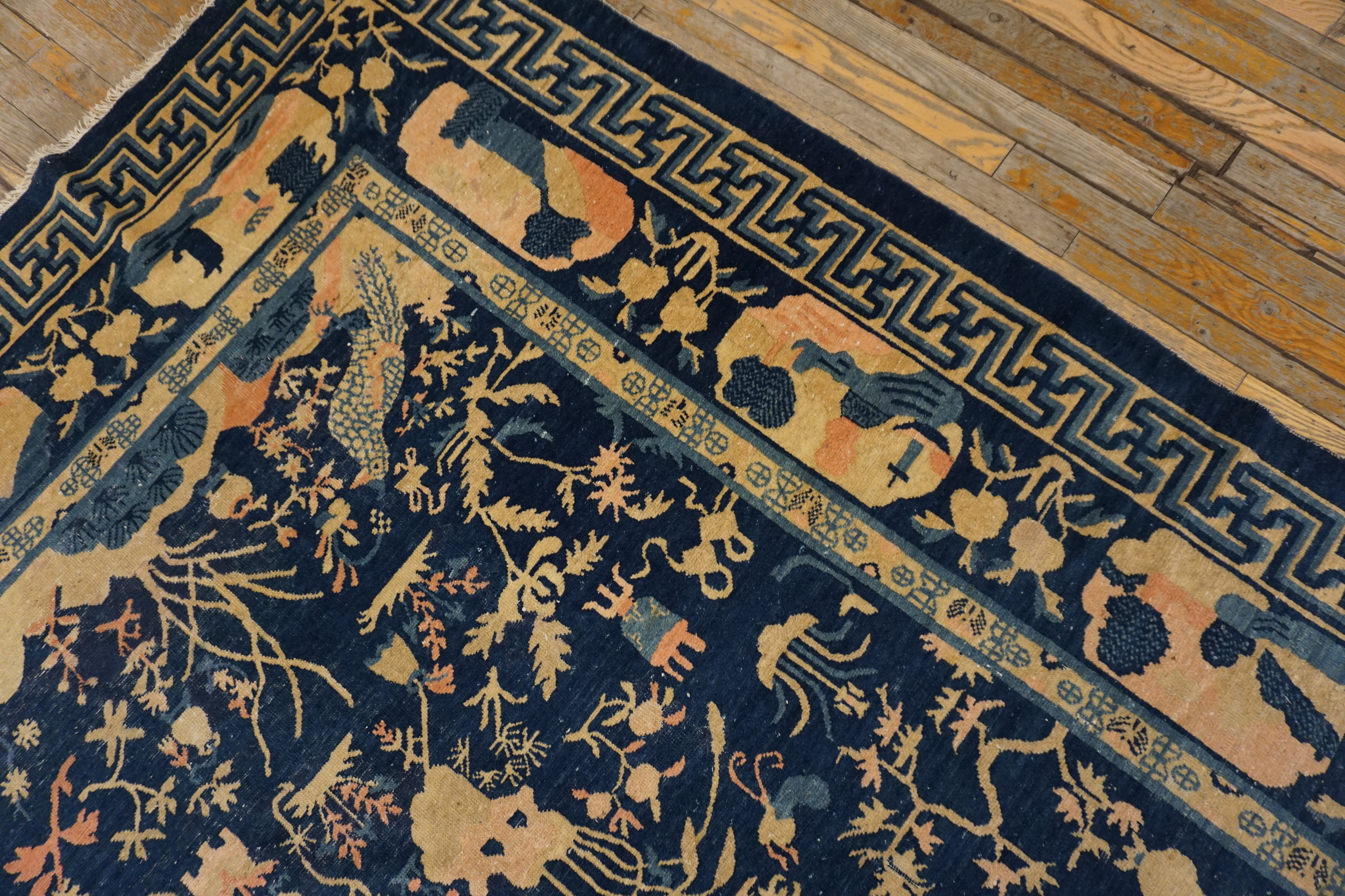 Chinese – Peking Knotted Wool Room Size Antique Rectangle Blue 1930s Rug, Circa Date: 1930s. This exceptional example of early 20th-century Chinese weaving embodies the refined aesthetic of the Peking tradition. Its dense, hand-knotted wool construction and sophisticated design confirm its status as a highly desirable antique rug.