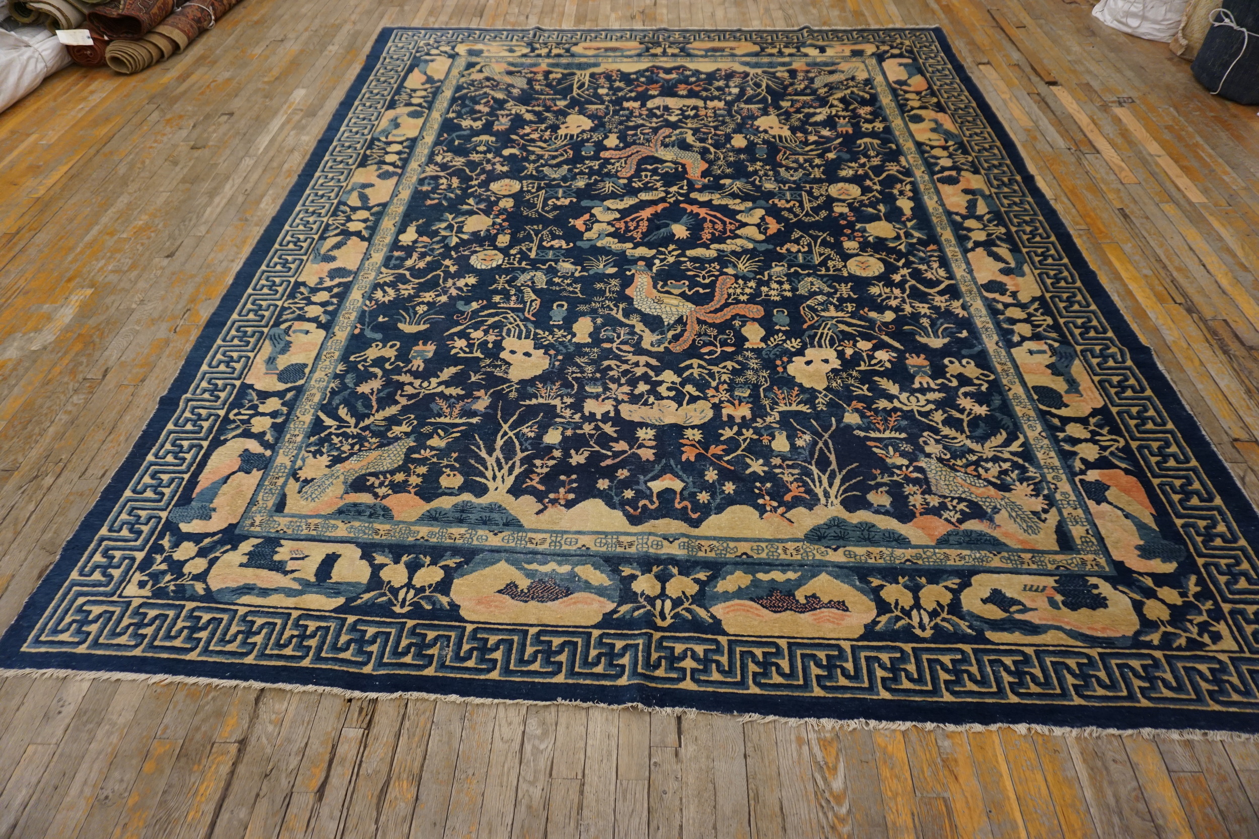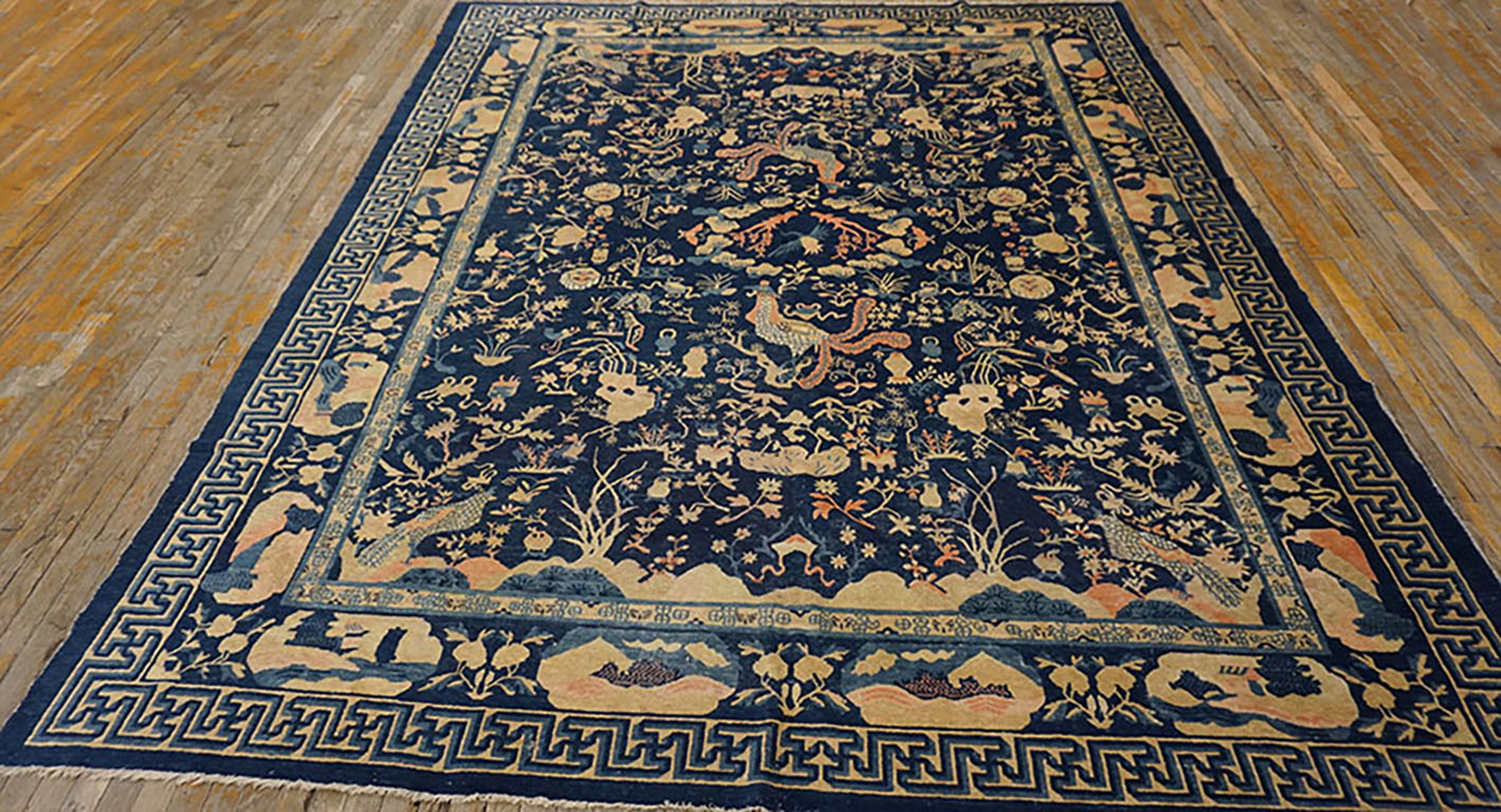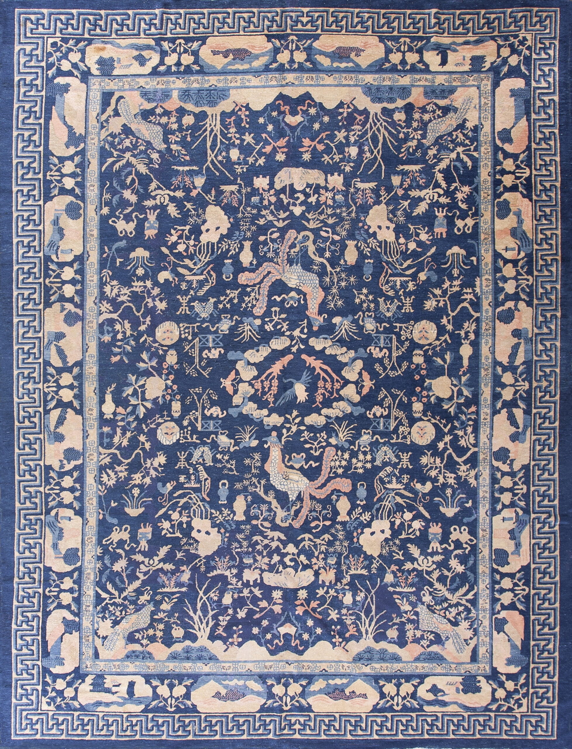 Chinese – Peking Knotted Wool Room Size Antique Rectangle Blue 1930s Rug, Circa Date: 1930s. This exceptional example of early 20th-century Chinese weaving embodies the refined aesthetic of the Peking tradition. Its dense, hand-knotted wool construction and sophisticated design confirm its status as a highly desirable antique rug.