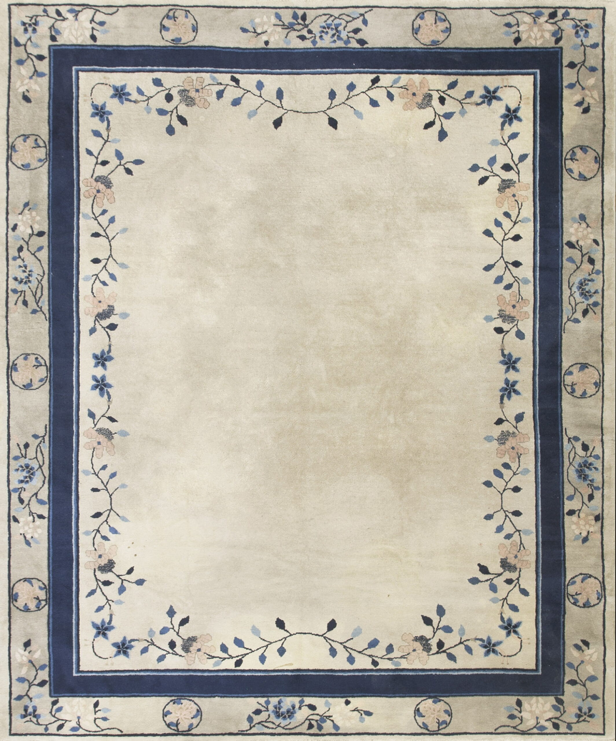 The expansive central field utilizes a serene palette of ivory beige cream white color, allowing the natural texture of the hand-knotted wool pile to shine. This light, neutral ground provides a striking contrast to the deep, saturated indigo frame that defines the rug’s perimeter, creating a clear visual structure.