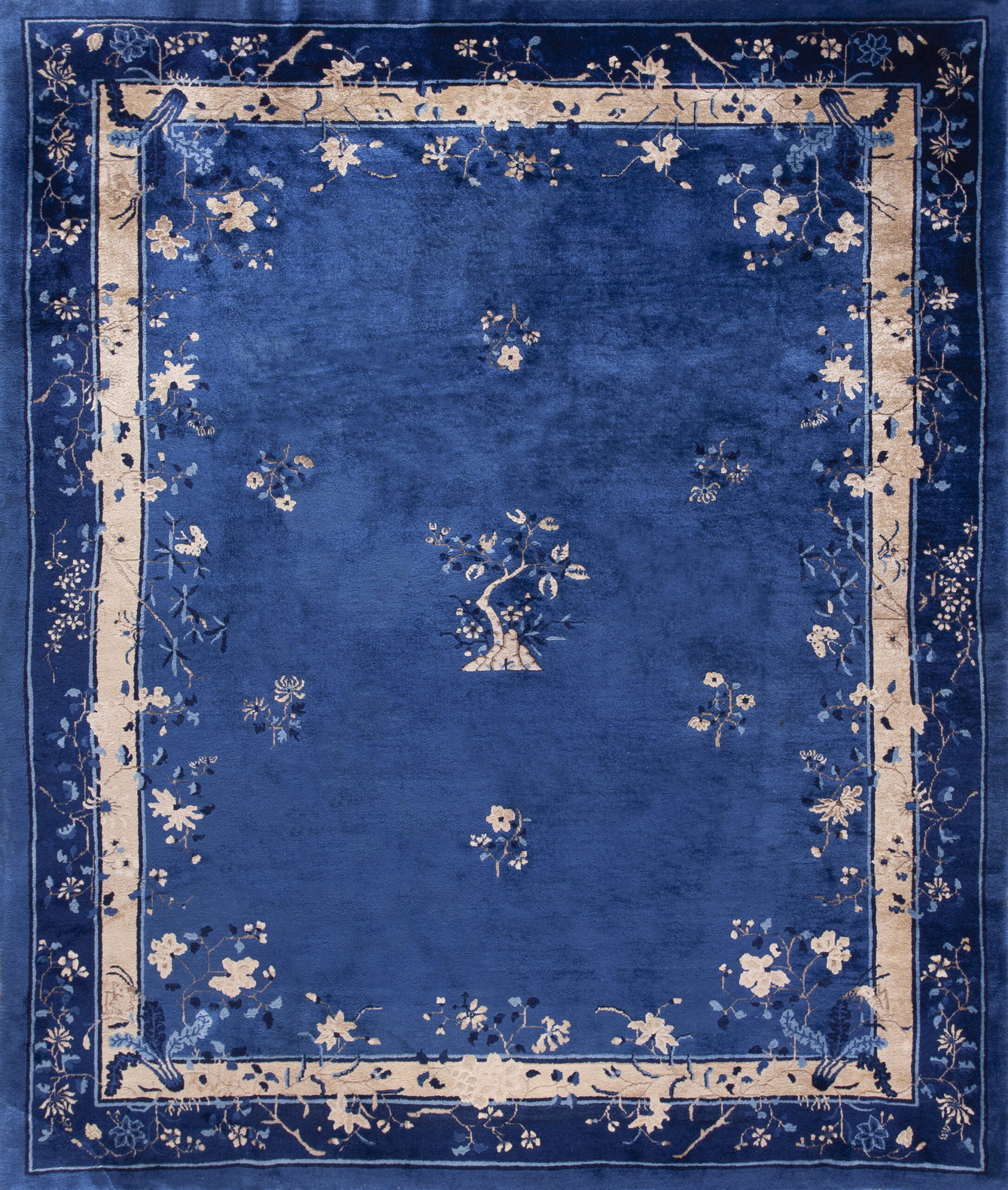 The field is dominated by a rich, deeply saturated cobalt, a striking blue color that provides a dramatic backdrop for the delicate motifs. The open composition allows the velvety texture of the wool to shine, creating a sense of depth and tranquility typical of high-quality Peking production.