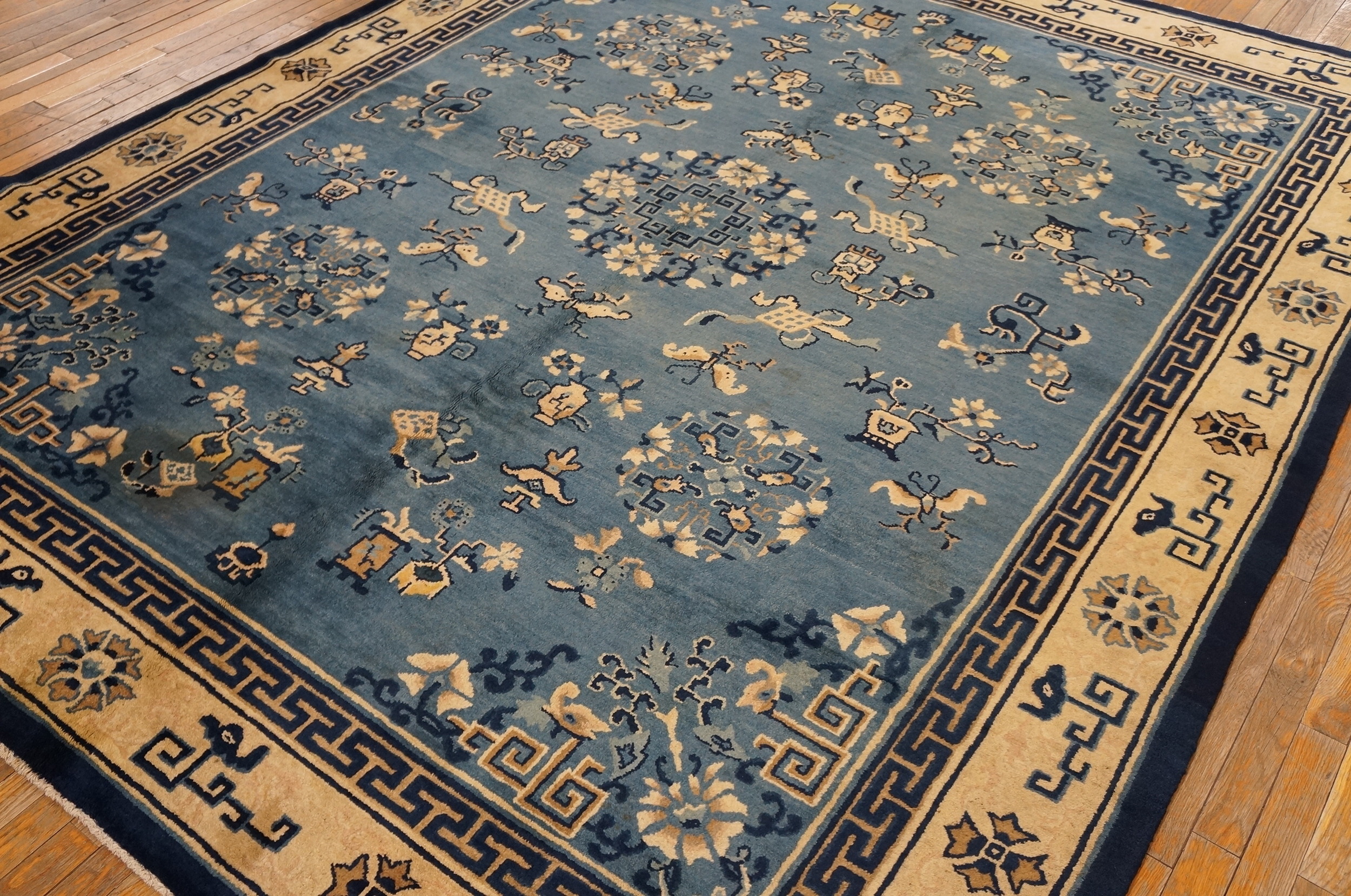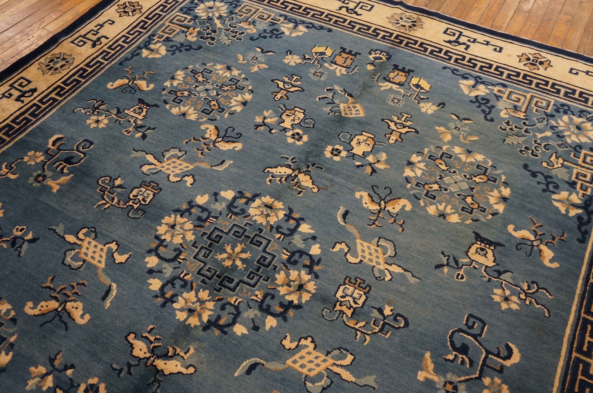 Framing the dynamic field is a classic Chinese border featuring the geometric meander or “Greek key” pattern, rendered in deep navy and set against a contrasting ivory ground. The substantial dimensions of this piece classify it among the most desirable room size rugs, pesyd scale.