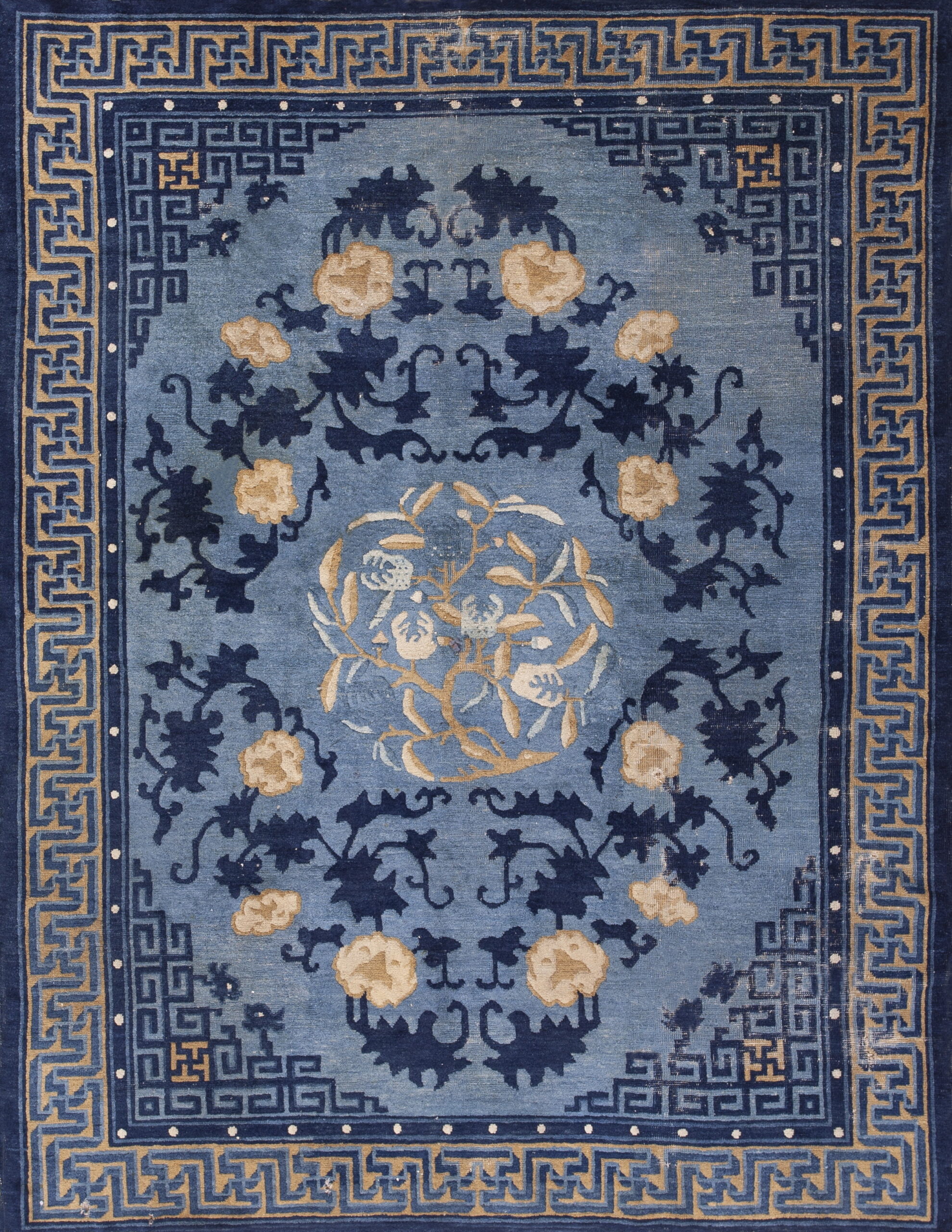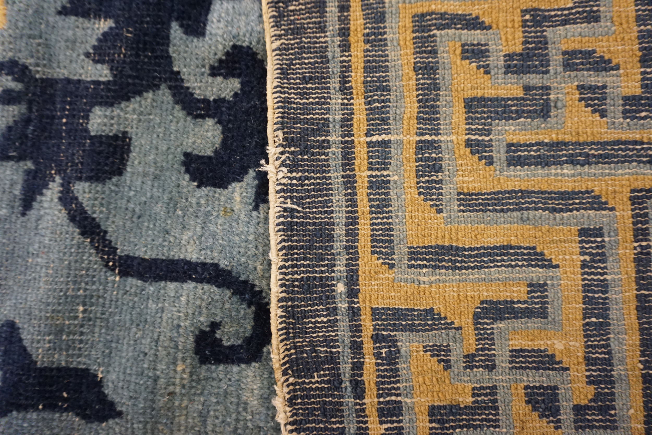 The striking visual appeal of this piece is rooted in its sophisticated use of color. A deep, saturated indigo forms the primary field, providing a dramatic backdrop for the lighter, almost powder-blue secondary tones. This masterful deployment of the blue color rugs palette is characteristic of the finest Chinese court textiles of the period, emphasizing serenity and depth.