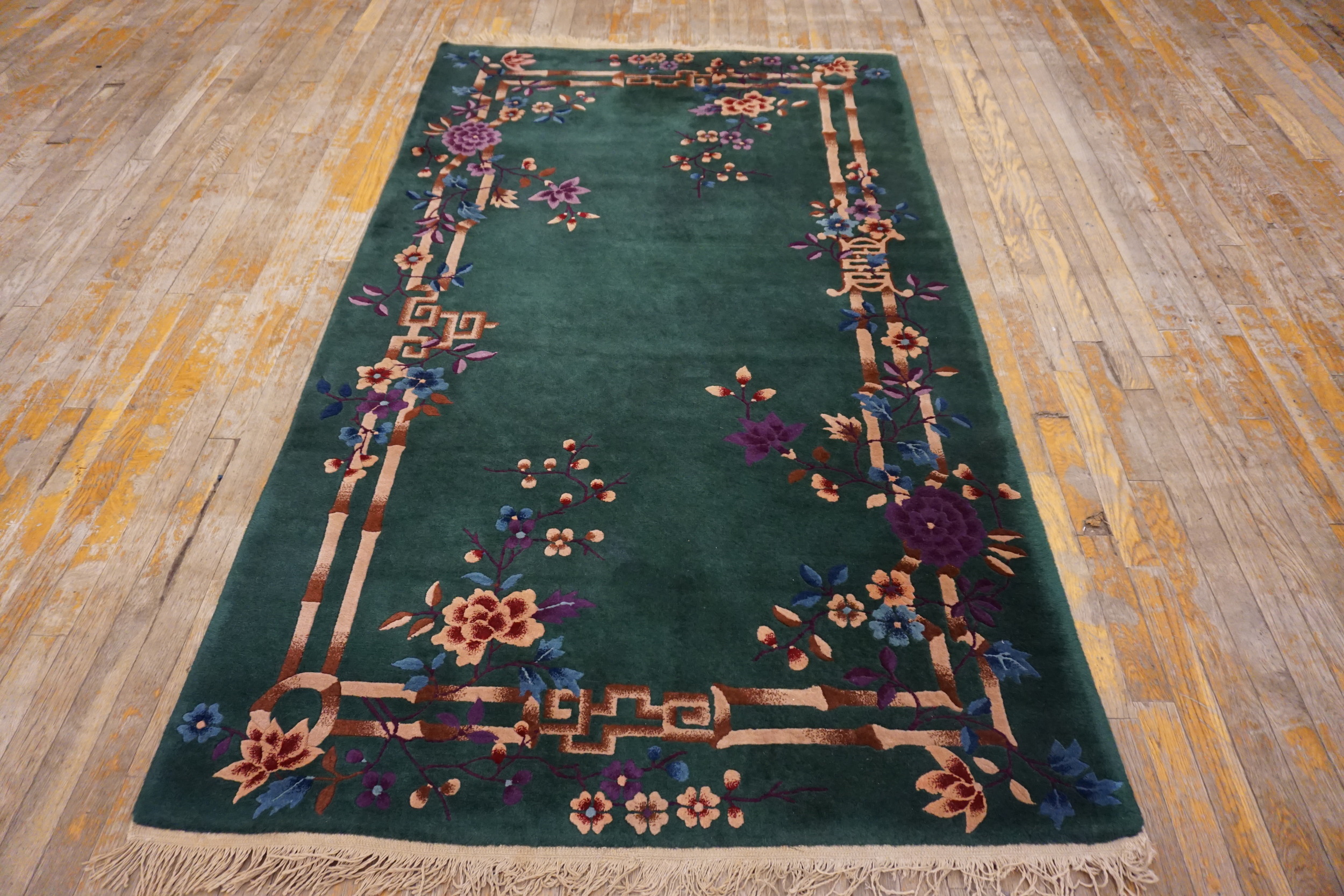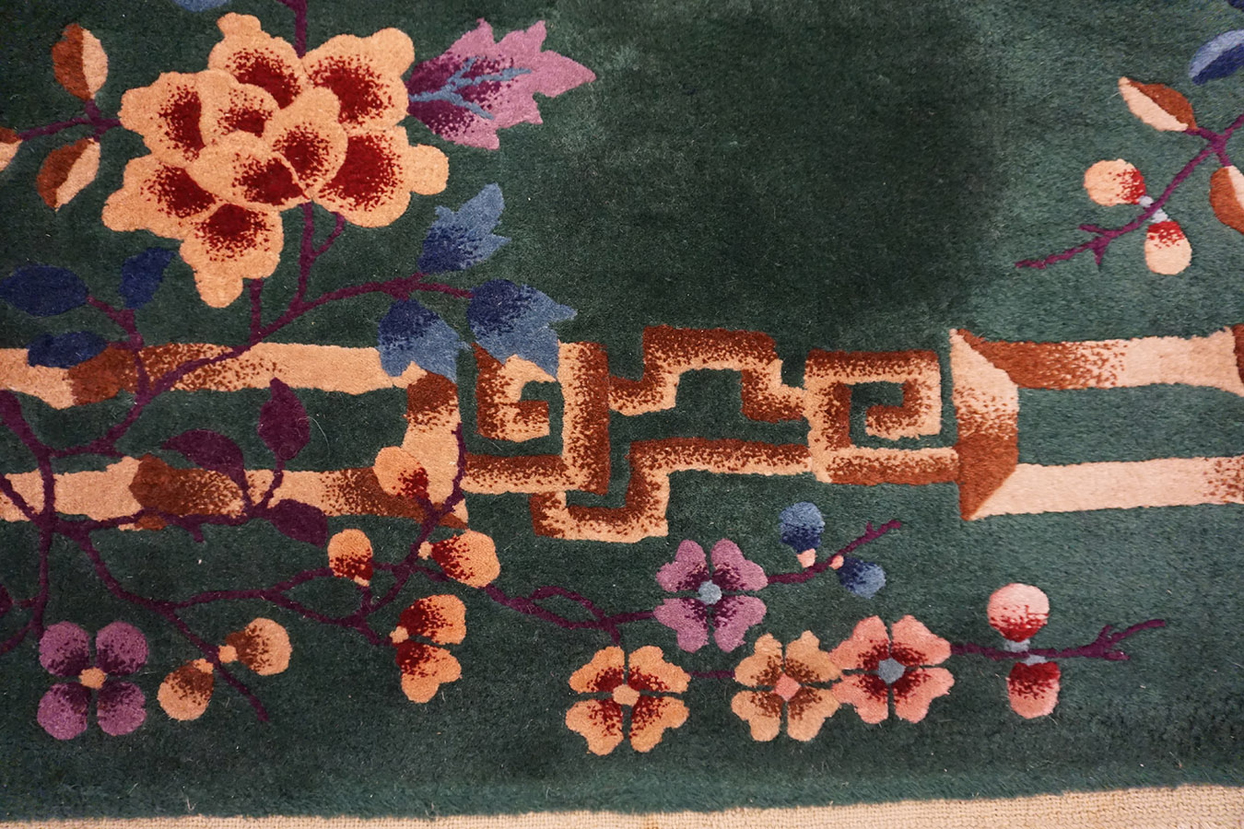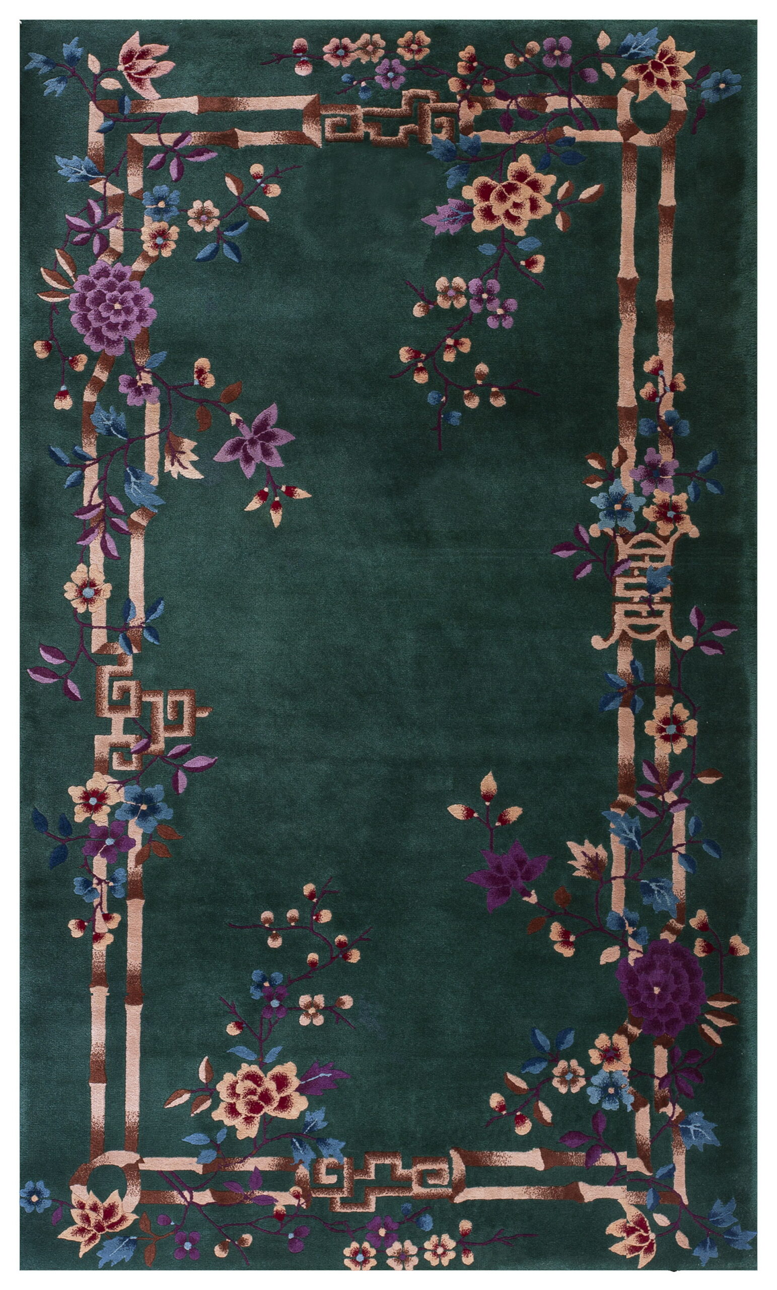 Woven in the tradition of Chinese rugs, the rug features a field of intensely saturated forest green wool, providing a dramatic backdrop for the stylized natural elements. The design is dominated by a striking border composed of bamboo stalks and stylized vines, characteristic of the period’s fascination with nature. The use of varied purples, blues, and creams creates a sophisticated palette, typical of high-quality floral rugs.