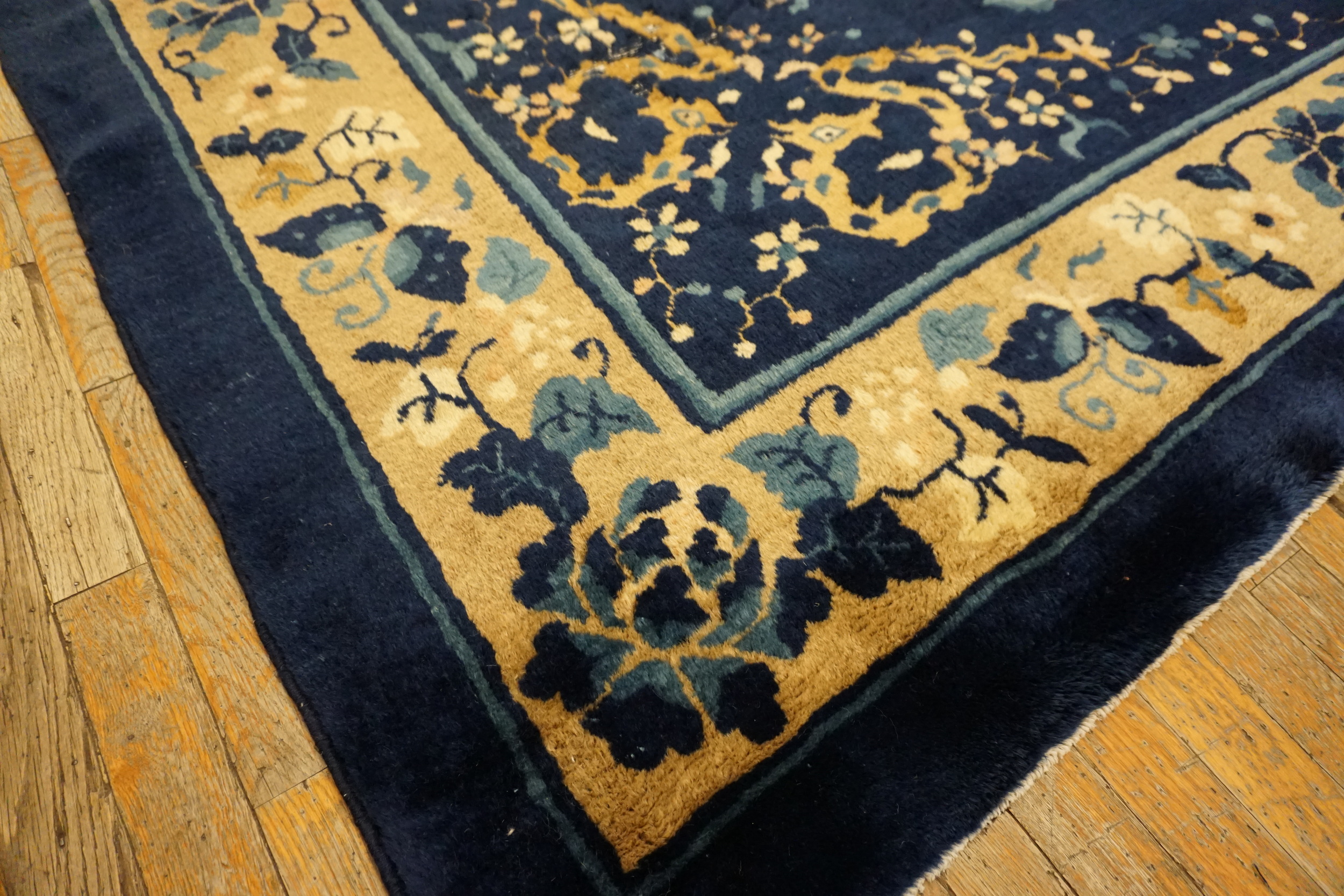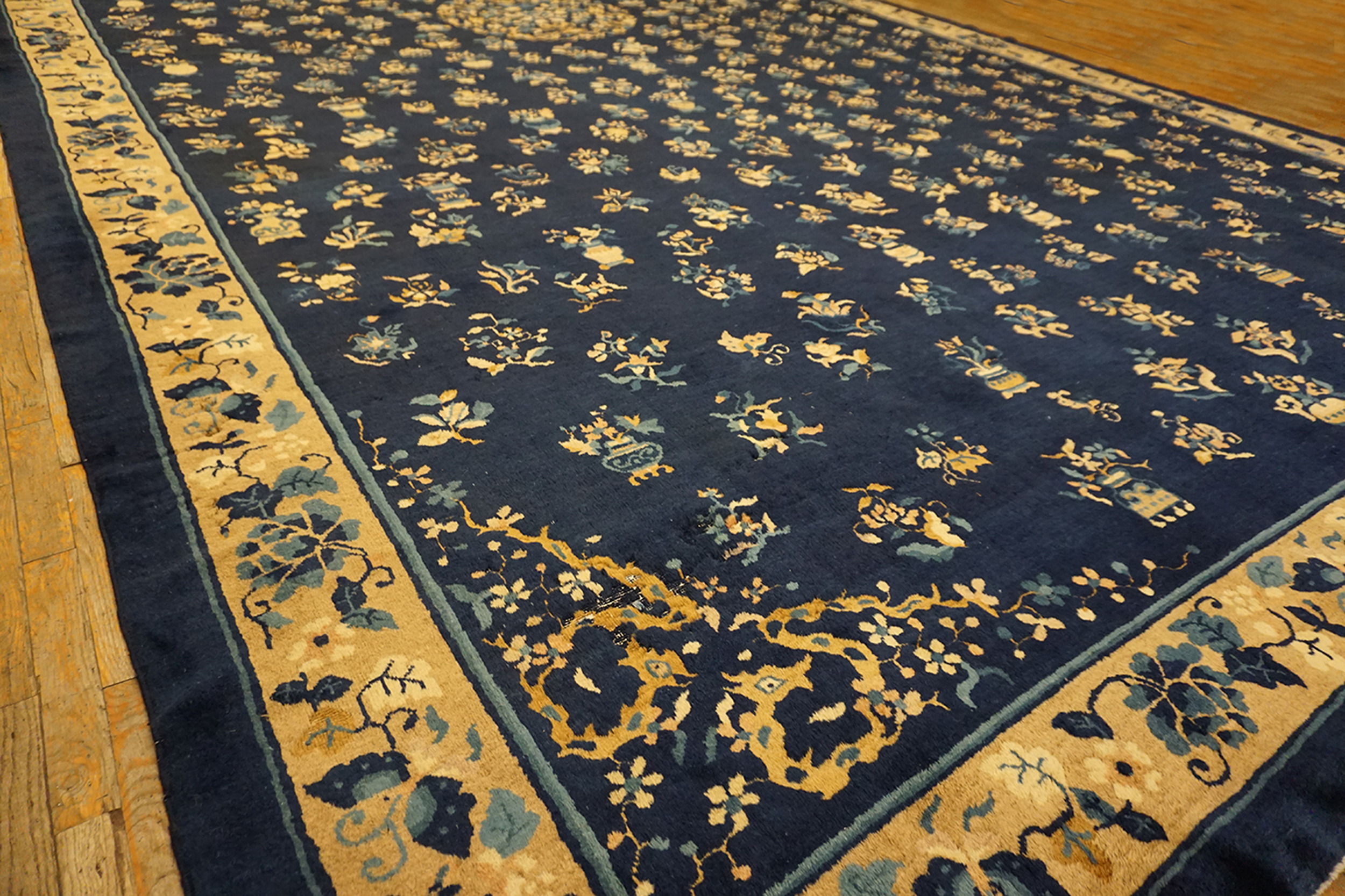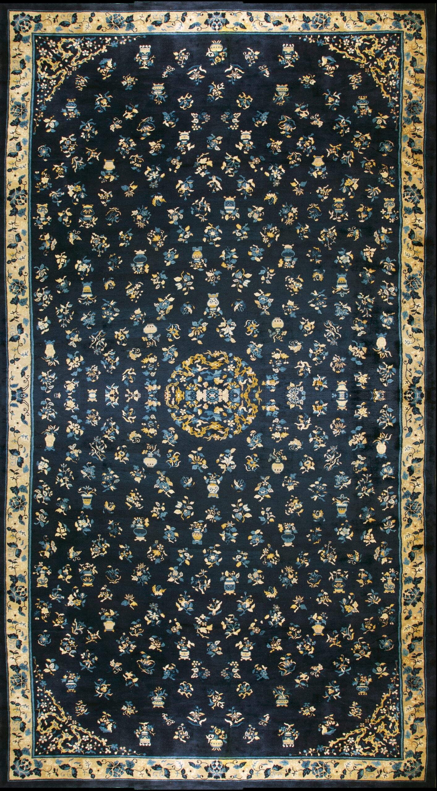 The field is dominated by a rich, saturated indigo, providing a dramatic backdrop for the delicate, scattered floral and vase motifs. This deep, resonant blue color rugs palette is characteristic of the finest late 19th-century workshop output. At the center, a subtle medallion, rendered in pale gold and secondary blue tones, anchors the composition, defining the precise aesthetic of peking rugs.