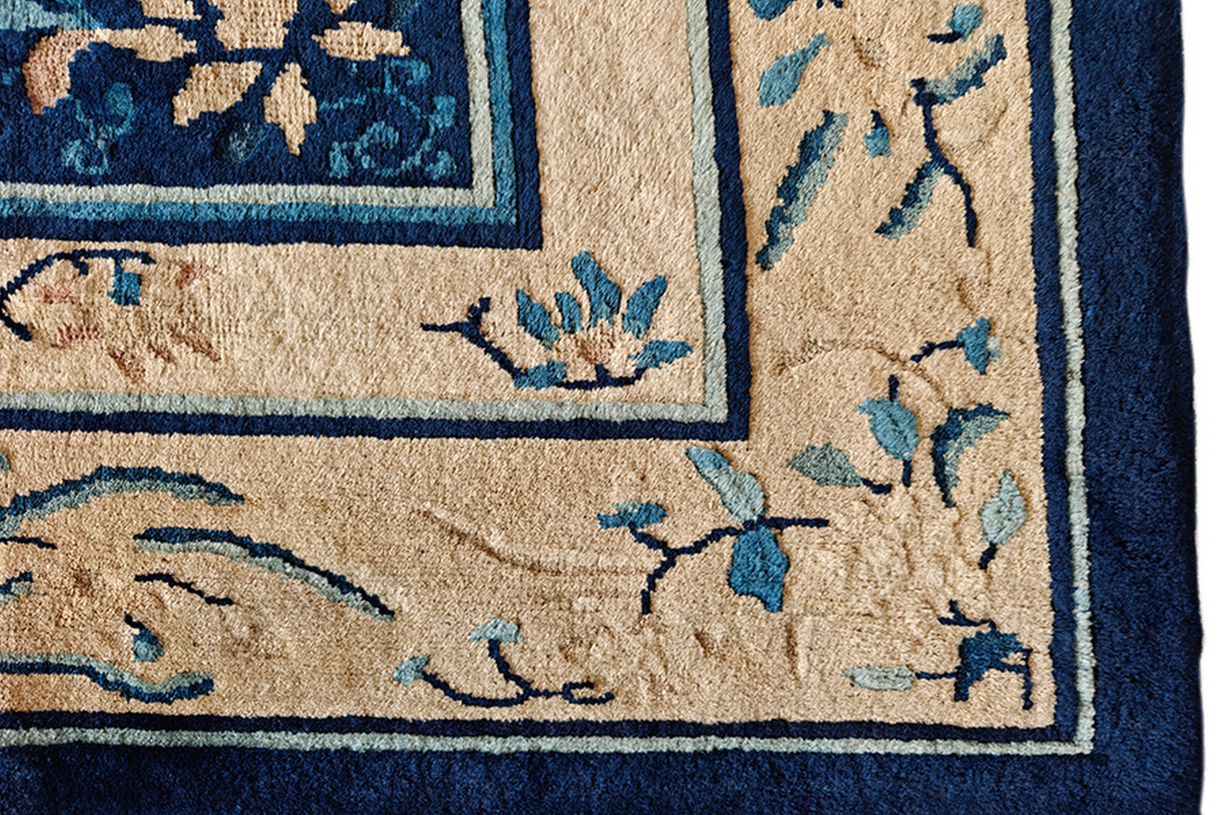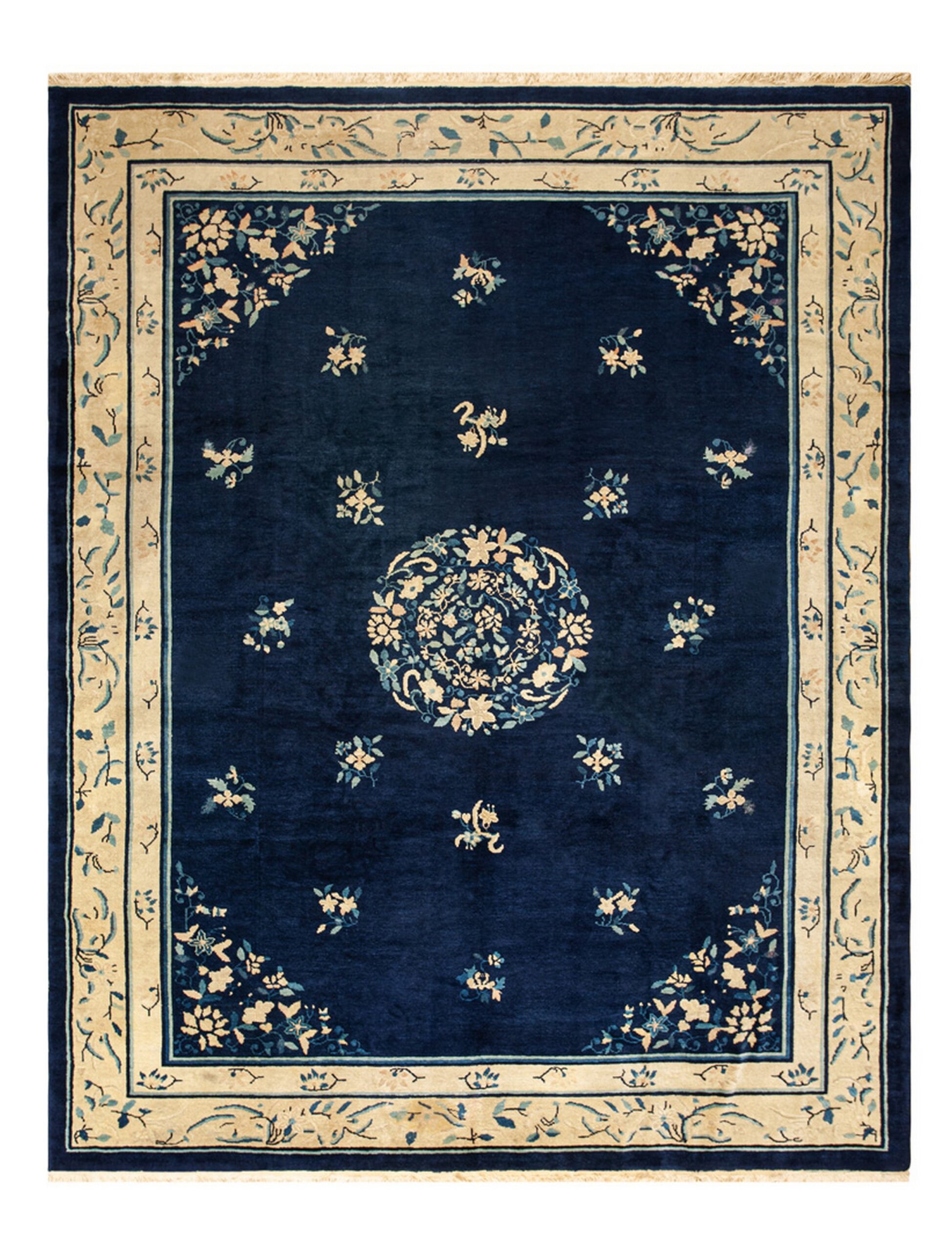 Antique Peking Chinese Floral, Medallion Blue 1920s Rug, Circa Date: 1920s. This exceptional piece exemplifies the refined aesthetic of early 20th-century Chinese weaving, moving away from dense traditional patterns toward a more open, decorative style favored in Western export markets. It remains a stunning example of classic oriental rugs from the Republican era, showcasing a mastery of scale and color balance.