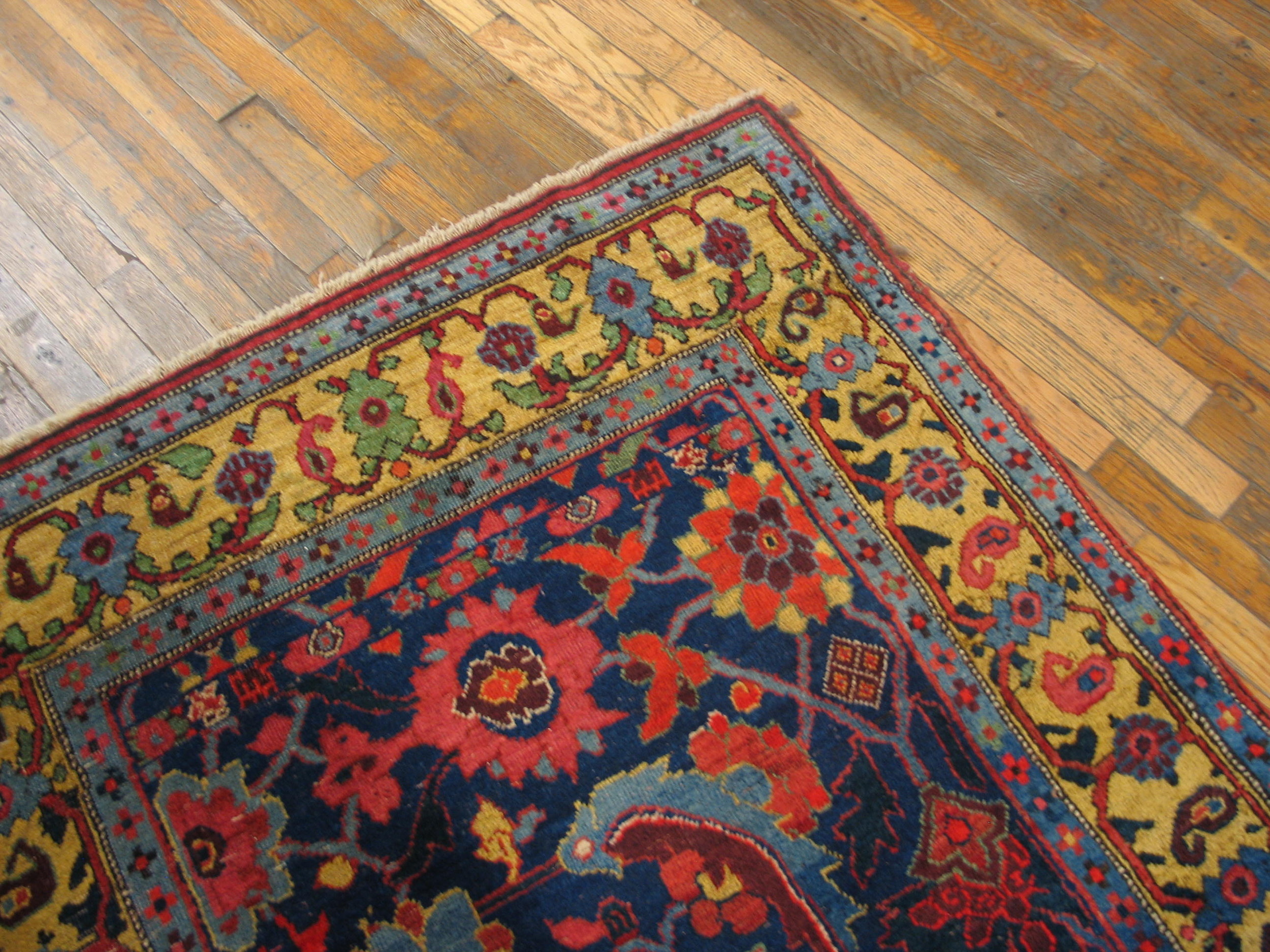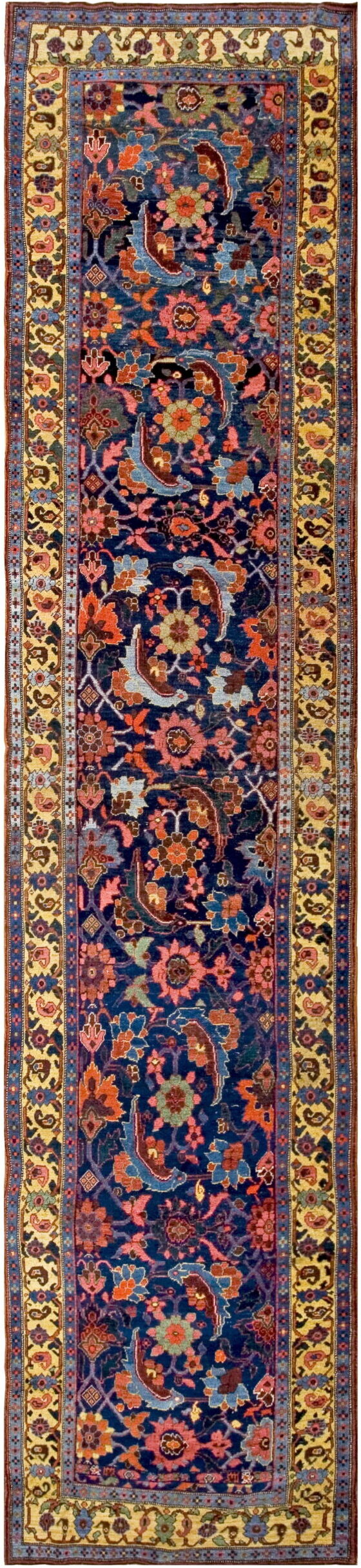 Antique Bijar Hallway Runner Wool Blue Rug, Country of Origin: Iran / Persia, Circa Date: 1900s. This exceptional example of a Iranian / Persian weaving tradition showcases the robust construction and saturated dyes for which the Kurdish region of Bijar is renowned. Dating from the turn of the 20th century, this piece represents the enduring quality expected of true antique rugs.