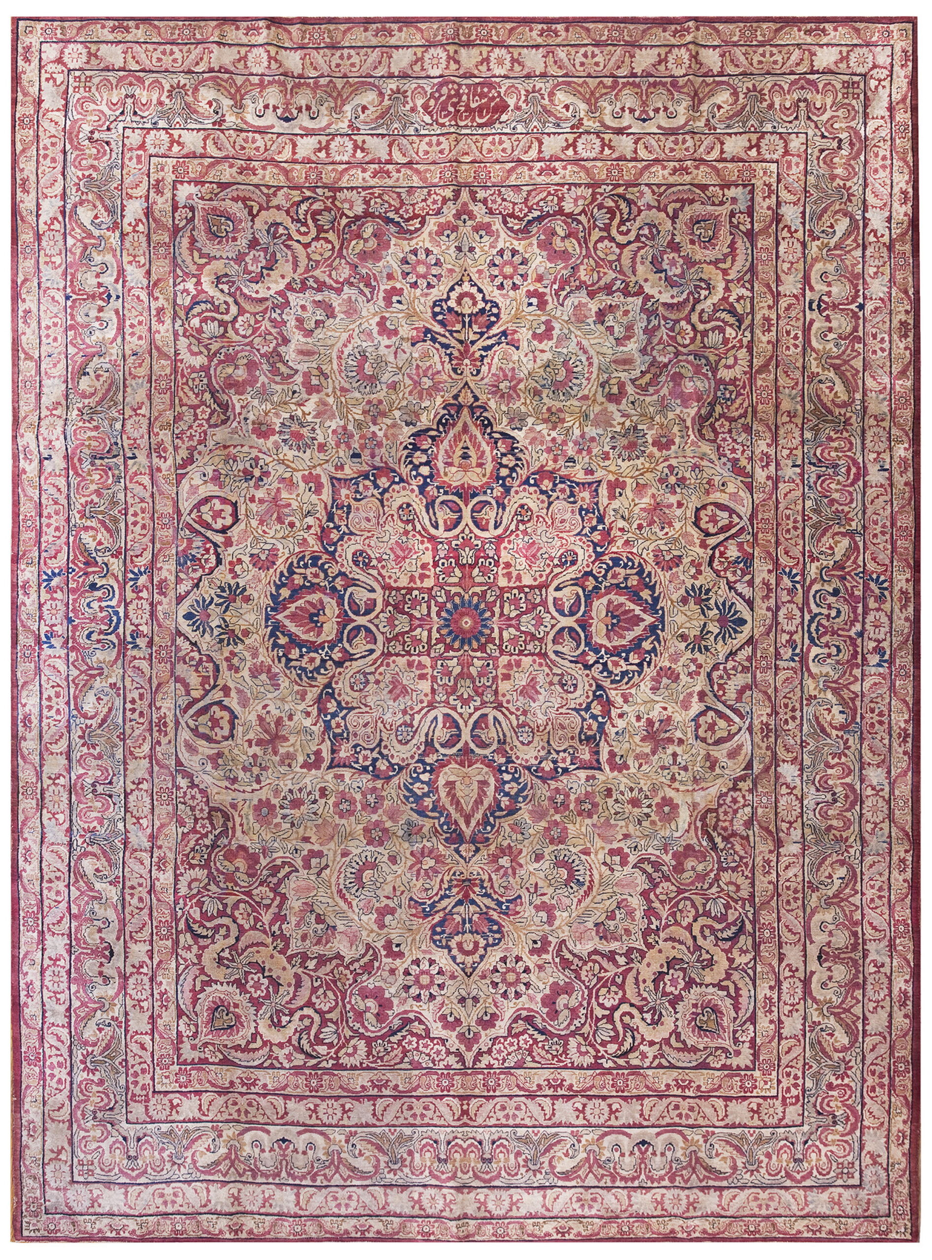 The central field is dominated by a luminous, softly aged ivory color ground, providing a perfect counterpoint to the deep madder red and subtle rose hues that define the intricate central medallion and corner spandrels. The palette is further punctuated by reserved accents of indigo and pale gold, demonstrating the masterful use of natural dyes typical of high-quality antique rugs.