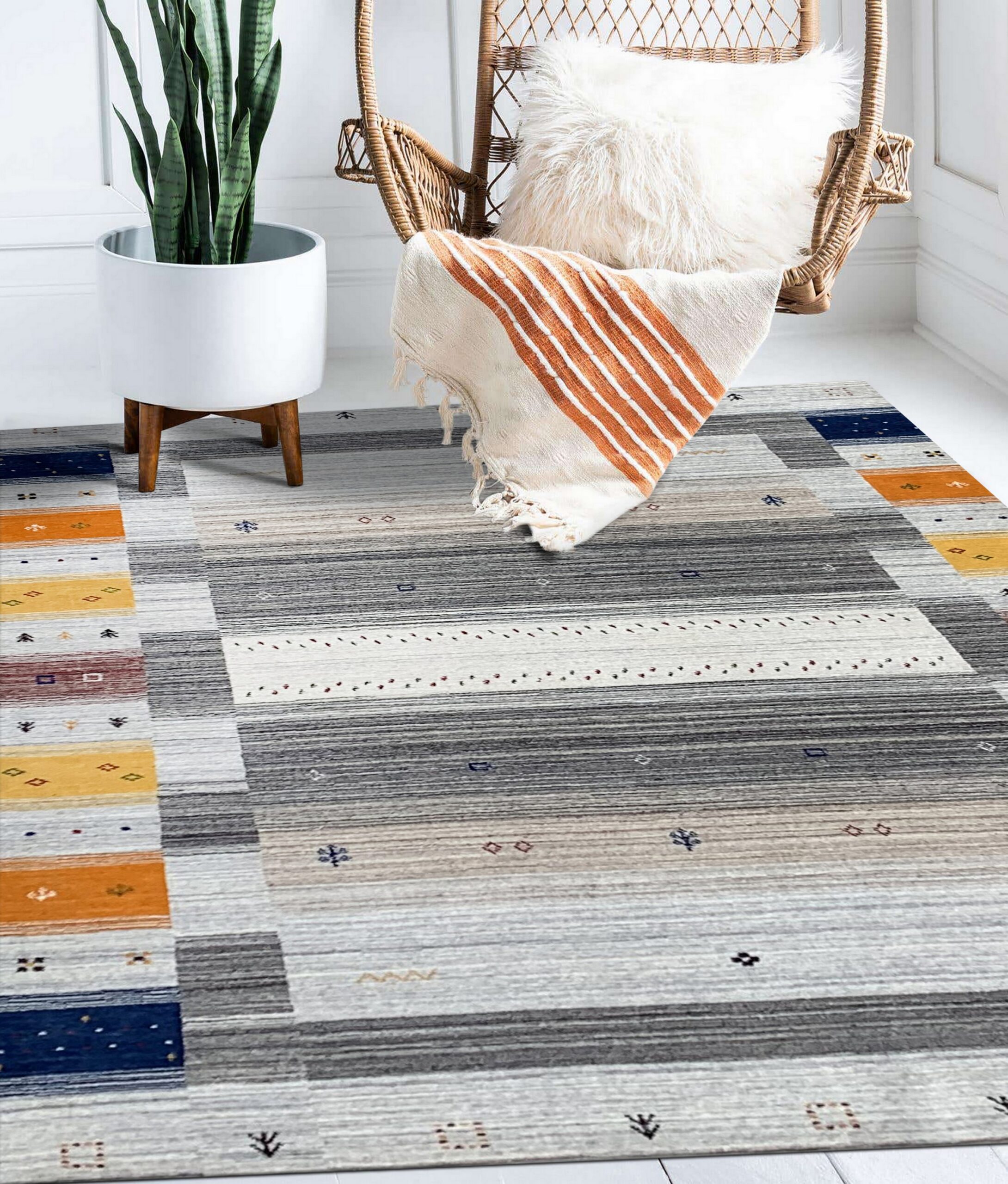 This versatile design seamlessly integrates into transitional, modern, or minimalist interiors, acting as a powerful anchor piece without overwhelming the space. While featured here in a standard area size, this Gabbeh style is often available in custom dimensions, including various widths suitable for hallway runner rugs, offering flexible design solutions for any space in the home.